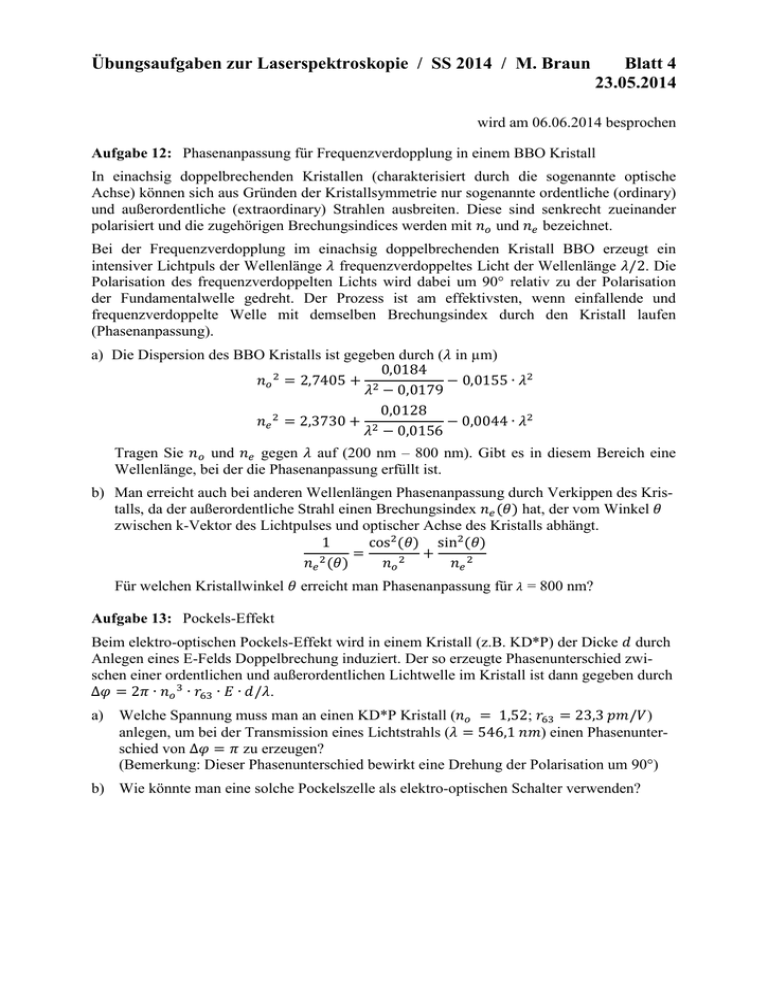 Übungsaufgaben zur Laserspektroskopie / SS 2014 / M. Braun Blatt 4 23.05.2014 wird am 06.06.2014 besprochen Aufgabe 12: Phasenanpassung für Frequenzverdopplung in einem BBO Kristall In einachsig doppelbrechenden Kristallen (charakterisiert durch die sogenannte optische Achse) können sich aus Gründen der Kristallsymmetrie nur sogenannte ordentliche (ordinary) und außerordentliche (extraordinary) Strahlen ausbreiten. Diese sind senkrecht zueinander polarisiert und die zugehörigen Brechungsindices werden mit und bezeichnet. Bei der Frequenzverdopplung im einachsig doppelbrechenden Kristall BBO erzeugt ein intensiver Lichtpuls der Wellenlänge frequenzverdoppeltes Licht der Wellenlänge . Die Polarisation des frequenzverdoppelten Lichts wird dabei um 90° relativ zu der Polarisation der Fundamentalwelle gedreht. Der Prozess ist am effektivsten, wenn einfallende und frequenzverdoppelte Welle mit demselben Brechungsindex durch den Kristall laufen (Phasenanpassung). a) Die Dispersion des BBO Kristalls ist gegeben durch ( in µm) Tragen Sie und gegen auf (200 nm – 800 nm). Gibt es in diesem Bereich eine Wellenlänge, bei der die Phasenanpassung erfüllt ist. b) Man erreicht auch bei anderen Wellenlängen Phasenanpassung durch Verkippen des Kristalls, da der außerordentliche Strahl einen Brechungsindex hat, der vom Winkel zwischen k-Vektor des Lichtpulses und optischer Achse des Kristalls abhängt. Für welchen Kristallwinkel erreicht man Phasenanpassung für = 800 nm? Aufgabe 13: Pockels-Effekt Beim elektro-optischen Pockels-Effekt wird in einem Kristall (z.B. KD*P) der Dicke durch Anlegen eines E-Felds Doppelbrechung induziert. Der so erzeugte Phasenunterschied zwischen einer ordentlichen und außerordentlichen Lichtwelle im Kristall ist dann gegeben durch . a) Welche Spannung muss man an einen KD*P Kristall ( ; ) anlegen, um bei der Transmission eines Lichtstrahls ( ) einen Phasenunterschied von zu erzeugen? (Bemerkung: Dieser Phasenunterschied bewirkt eine Drehung der Polarisation um 90°) b) Wie könnte man eine solche Pockelszelle als elektro-optischen Schalter verwenden?