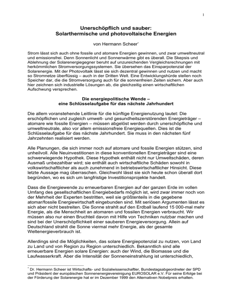 1 Unerschöpflich und sauber: Solarthermische und photovoltaische Energien von Hermann Scheer* Strom lässt sich auch ohne fossile und atomare Energien gewinnen, und zwar umweltneutral und emissionsfrei. Denn Sonnenlicht und Sonnenwärme gibt es überall. Die Skepsis und Ablehnung der Solarenergiegegner beruht auf unzureichenden Vergleichsrechnungen mit herkömmlichen Stromversorgungssystemen. Sie übersehen das Einsparpotenzial der Solarenergie. Mit der Photovoltaik lässt sie sich dezentral gewinnen und nutzen und macht so Stromnetze überflüssig – auch in der Dritten Welt. Eine Entwicklungshürde stellen noch Speicher dar, die die Stromversorgung auch für die sonnenfreien Zeiten sichern. Aber auch hier zeichnen sich industrielle Lösungen ab, die gleichzeitig einen wirtschaftlichen Aufschwung versprechen. Die energiepolitische Wende – eine Schlüsselaufgabe für das nächste Jahrhundert Die allem voranstehende Leitlinie für die künftige Energienutzung lautet: Die erschöpflichen und zugleich umwelt- und gesundheitszerstörenden Energieträger – atomare wie fossile Energien – müssen abgelöst werden durch unerschöpfliche und umweltneutrale, also vor allem emissionsfreie Energiequellen. Dies ist die Schlüsselaufgabe für das nächste Jahrhundert. Sie muss in den nächsten fünf Jahrzehnten realisiert werden. Alle Planungen, die sich immer noch auf atomare und fossile Energien stützen, sind unheilvoll. Alle Neuinvestitionen in diese konventionellen Energieträger sind eine schwerwiegende Hypothek. Diese Hypothek enthält nicht nur Umweltschäden, deren Ausmaß unbezahlbar wird; sie enthält auch wirtschaftliche Schäden sowohl in volkswirtschaftlicher als auch zunehmend in betriebswirtschaftlicher Hinsicht. Diese letzte Aussage mag überraschen. Gleichwohl lässt sie sich heute schon überall dort begründen, wo es sich um langfristige Investitionsprojekte handelt. Dass die Energiewende zu erneuerbaren Energien auf der ganzen Erde im vollen Umfang des gesellschaftlichen Energiebedarfs möglich ist, wird zwar immer noch von der Mehrheit der Experten bestritten, weil sie größtenteils in die gegebene atomar/fossile Energiewirtschaft eingebunden sind. Mit seriösen Argumenten lässt es sich aber nicht bestreiten. Die Sonne strahlt auf den Erdball laufend 15 000-mal mehr Energie, als die Menschheit an atomaren und fossilen Energien verbraucht. Wir müssen also nur einen Bruchteil davon mit Hilfe von Techniken nutzbar machen und sind bei der Unerschöpflichkeit einer sauberen Energieversorgung. Allein auf Deutschland strahlt die Sonne viermal mehr Energie, als der gesamte Weltenergieverbrauch ist. Allerdings sind die Möglichkeiten, das solare Energiepotenzial zu nutzen, von Land zu Land und von Region zu Region unterschiedlich. Bekanntlich sind alle erneuerbare Energien solare Energien: auch der Wind, die Biomasse und die Laufwasserkraft. Aber die Intensität der Sonneneinstrahlung ist unterschiedlich, * Dr. Hermann Scheer ist Wirtschafts- und Sozialwissenschaftler, Bundestagsabgeordneter der SPD und Präsident der europäischen Sonnenenergievereinigung EUROSOLAR e.V. Für seine Erfolge bei der Förderung der Solarenergie hat er im Dezember 1999 den Alternativen Nobelpreis erhalten. 2 ebenso die natürlichen Anbaubedingungen für Biomasse, die jeweiligen Windverhältnisse und die Wasserkraftpotenziale. Daraus ergibt sich, dass die jeweiligen konkreten Energieausbeuten nicht identisch sein können. Sonnenlicht und Sonnenwärme gibt es überall Es gibt Länder, in denen relativ wenig oder gar keine Wasserkraft zur Verfügung steht, die Klima- und Bodenverhältnisse wenig hergeben für die Nutzung der Biomasse, und Regionen, die nicht sehr ergiebig sind für die Windkraftgewinnung. In anderen stehen aber erneuerbare Energien in Hülle und Fülle zur Verfügung. Was aber überall vorhanden ist, sind Sonnenlicht und Sonnenwärme. Damit wird die Umwandlung von Sonnenlicht in Strom (Photovoltaik) und die Nutzung von Sonnenwärme für die Heiz- und sonstigen Wärmebedürfnisse sowie ebenfalls zur Stromerzeugung die wichtigste Basis für die künftige Energieversorgung und – nutzung. Man kann auch sagen: Photovoltaische und solarthermische Nutzung der erneuerbaren Energien wird die Hauptrolle für die Zukunft spielen. Nun gibt es viele, die wegen der unterschiedlichen Intensität der Sonneneinstrahlung davon sprechen, dass dieses vorwiegend für südliche Länder in Frage komme, aber kaum oder nur in geringem Maße für Mittel- oder Nordeuropa. Dies ist erneut ein großer Irrtum. Er entsteht dadurch, dass man die Energiesysteme immer nur ausschnitthaft betrachtet. In der Regel wird nur der Wirkungsgrad verschiedener Energieanlagen im Verhältnis zu den Kosten, die dafür aufzubringen sind, für die Energiewandlertechnik verglichen. Man vergleicht also die Stromerzeugungskosten in einem konventionellen Kraftwerk mit den Stromerzeugungskosten der Photovoltaik; oder man vergleicht die Photovoltaik-Stromerzeugungskosten bei uns in Mitteleuropa mit denen in Italien oder in der Sahara. Dann kommt man zwangsläufig bei falschen beziehungsweise unzulänglichen Kalkulationen an und landet unversehens bei falschen Schlussfolgerungen. Nur Energiesysteme lassen sich vergleichen Wenn man das unerschöpfliche und saubere Potenzial der Sonnenenergie in seinen wirtschaftlichen Anforderungen und Erträgen ermessen will, ist es notwendig, Energiesysteme miteinander zu vergleichen. Ein Energiesystem besteht aus mehr als einer Umwandlungstechnik. Der Systempreis der Energiebereitstellung enthält alle Kosten, von der Gewinnung der Primärenergie bis zur Lieferung der Energie an den Endkunden, ja sogar bis zur Frage der Effizienz des energieverbrauchenden Gebäudes oder Geräts. Und dieser Systempreis allein gibt uns Auskunft über die wirtschaftlichen Chancen erneuerbarer Energien und die optimale Art ihrer Anwendung und Nutzung. Der Systempreis der konventionellen Energien ergibt sich damit aus den K