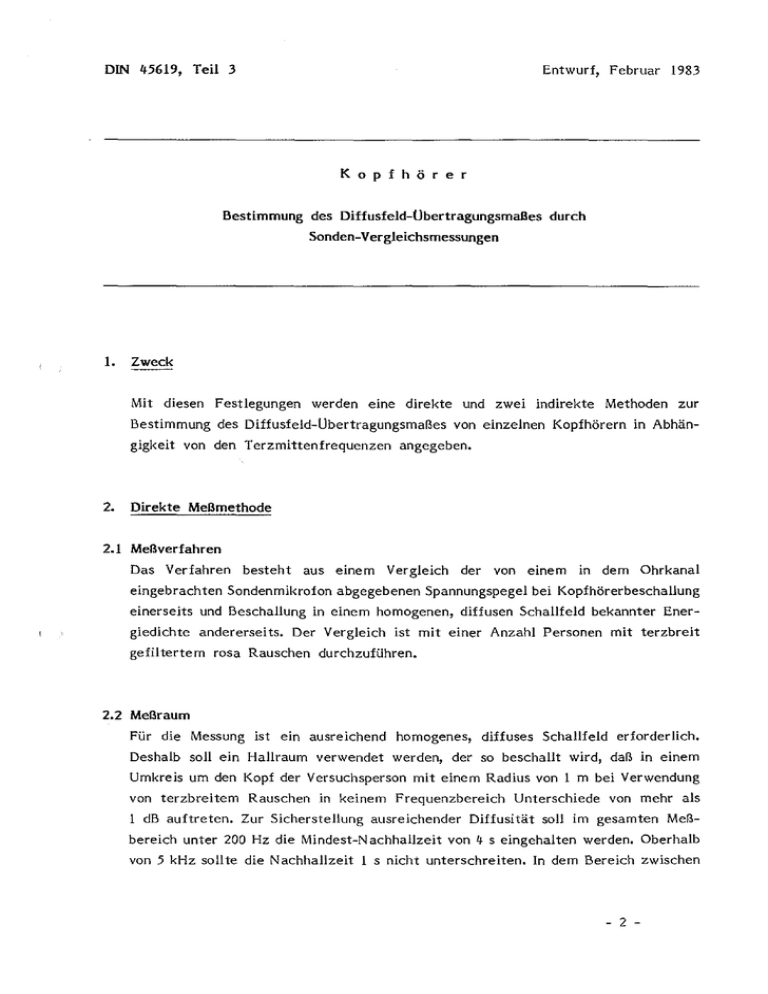 DIN 45619, Teil 3 Entwurf, Februar 1983 Kopfhörer Bestimmung des Diffusfeld-Ubertragungsmaßes durch Sonden-Vergleichsmessungen 1. Zweck Mit diesen Festlegungen werden eine direkte und zwei indirekte Methoden zur Bestimmung des Diffusfeld-Ubertragungsmaßes von einzelnen Kopfhörern in Abhängigkeit von den Terzmittenfrequenzen angegeben. 2. Direkte Meßmethode 2.1 Meßverfahren Das Verfahren besteht aus einem Vergleich der von einem in dem Ohrkanal eingebrachten Sondenmikrofon abgegebenen Spannungspegel bei Kopfhörerbeschallung einerseits und Beschallung in einem homogenen, diffusen Schallfeld bekannter Energiedichte anderersei ts. Der Vergleich ist mit einer Anzahl Personen mit terzbreit gefiltertem rosa Rauschen durchzuführen. 2.2 Meßraum Für die Messung ist ein ausreichend homogenes, diffuses Schallfeld erforderlich. Deshalb soll ein Hallraum verwendet werden, der so beschallt wird, daß in einem Umkreis um den Kopf der Versuchsperson mit einem Radius von I m bei Verwendung von terzbreitem Rauschen in keinem Frequenzbereich Unterschiede von mehr als I dB auftreten. Zur Sicherstellung ausreichender Diffusität soll im gesamten Meßbereich unter 200 Hz die Mindest-N achhallzeit von 4 s eingehalten werden. Oberhalb von 5 kHz sollte die Nachhallzeit I s nicht unterschreiten. In dem Bereich zwischen - 2 - - 2 - 200 Hz und 5 kHz sind mindestens 2 s erforderlich. Außerdem ist darauf zu achten, daß keine der Raumbegrenzungsflächen deutlich von der übrigen Oberfläche abweichende Absorptionseigenschaften hat. Der Störpegel muß hinreichend weit unter dem Pegel des Prüfschalls liegen. Diese Bedingung ist mit Sicherheit bei einem Störabstand von 30 dB erfüllt. 2.3 Meßgeräte Die Meßeinrichtung besteht aus einem Rauschgenerator, Terzfiltern, einem Verstärker, einem bis drei Lautsprechern, einer Ohrsonde, einem den Effektivwert bildenden Spannungsmesser und einer Einrichtung zur Messung des Schalldruckpegels. Die Meßunsicherheit bei der Bestimmung des Schalldruckpegels und der elektrischen Eingangsgröße sowie der Sondenausgangsspannung darf nicht größer als jeweils ::0.5 dB sein. 2.4 Durchführung der Messungen 2.4.1 Prüfschall Für das Terzbandrauschen sollten Bänder mit Mittenfrequenzen nach DIN 45 652, Ausgabe Januar 1964, Reihe b, gewählt werden. Es ist darauf zu achten, daß der Frequenzgang des Lautsprechers in den einzelnen Terzbändern keine scharf ausgeprägten Resonanzstellen besitzt. Der Schalldruckpegel des Prüfschalls sollte 80 dB nicht überschreiten. 2.4.2 Versuchspersonen Die Sondenmessungen sind in jedem Terzband mit mindestens 5 Personen durchzuführen. Die Hörfähigkeit der Personen spielt keine Rolle, jedoch sollen die individuellen Kopf- und Ohrformen nicht auffällig von normalen Maßen abweichen. 2.4.3 Ankopplung der Kopfhörer Die Art der Ankopplung der Kopfhörer an das Ohr ist anzugeben. Bei Doppelkopfhörern, die durch einen Bügel miteinander verbunden sind, sind Angaben über die Andruckkraft der Kopfhörer zu machen. Doppelkopfhörer sind entsprechend der Kopfhörerausführung seitenrichtig aufzusetzen. - 3 - - 3 - 2.4.4 Meßsonde Die Meßsonde sollte aus einem Miniatur-Elektret-Mikrofon bestehen, dessen Abmessungen klein genug sind, um damit im Ohrkanal einige Millimeter vor dem Trommelfell den Schall messen zu können. Dabei darf die Schallausbreitung am Außenohr, bis zur Ohrkanalebene 4 mm einwärts, nicht gestört werden. Die Mikrofonleitungen, die aus dem Ohrkanal herausgeführt werden, müssen deshalb aus Litze sehr geringen Querschnitts bestehen. Um einen festen Sitz des Miniaturmikrofons im Ohrkanal zu gewährleisten, sollten sich am Mikrofon zweckmäßigerweise federnde Bügel befinden, die an der Ohrkanalwand andrücken und deshalb das Mikrofon im Ohrkanal zentriert festklemmen. Die Federeigenschaften der Bügel müssen so bemessen sein, daß einerseits ein ausreichend fester Sitz auch bei unterschiedlichen Ohrkanalquerschnitten gewährleistet ist und daß andererseits das Ein- und Ausführen der Sonde ohne Schwierigkeiten möglich ist. Die Sonde darf keine scharfkantigen Elemente aufweisen, sodaß Verletzungen, insbesondere des Trommelfells, nicht zu befürchten sind. An den Frequenzgang der Meßsonde werden keine besonderen Anforderungen gestellt. Es ist aber darauf zu achten, daß innerhalb der einzelnen Terzbänder keine scharf ausgeprägten Resonanzstellen vorhanden sind. 2.4.5 Meßprozedur Vor Beginn der Messung wird der Versuchsperson die Meßsonde in den Ohrkanal eingeführt. Der Meßpunkt im Ohrkanal ist beliebig; er muß sich jedoch mindestens 4 mm hinter dem Ohrkanaleingang befinden. Die Mikrofonleitung wird locker aus dem Ohrkanal herausgeführt und mit Hilfe von Heftpflaster unterhalb der Ohrmuschel fixiert; sie darf den Sitz der Sonde im Ohrkanal nicht mehr verändern, wenn der Kopfhörer auf- oder abgesetzt wird. Der vom Sondenmikrofon abgegebene Spannungspegel wird für jedes Frequenzband bei Beschallung der Person im Meßraum im diffusen Schallfeld gemessen. Unmittelbar danach wird der Kopfhörer sorgfältig aufgesetzt und der Spannungspegel für jedes Frequenzband bei Kopfhörerbeschallung gemessen. Diese Meßreihe wird zweimal wiederholt, und die Person verändert dazu jedesmal im Meßraum den Hörort und die Ausrichtung von Kopf und Rumpf. 2.4.6 Auswertung für eine Person Aus dem Spannungspegel des Sondenmikrofons bei Kopfhörerbeschallung, bezogen auf den Spannungspegel am Eingang des Kopfhörers, sowie aus dem Spannungspegel - 4 - - 4 - des Sonden mikrofons bei Beschallung im diffusen Schallfeld, bezogen auf den am Hörort im diffusen Schallfeld erzeugten Schalldruckpegel, wird das für die betreffende Meßreihe und das betrachtete Frequenzband gültige Diffusfeld-Übertragungsmaß des Kopfhörers errechnet. Die errechneten Diffusfeld-Übertragungsmaße des Kopfhörers für die drei Meßreihen an einer Person werden arithmetisch gemittelt. 2.4.7 Mittelung über interindividuelle Unterschiede Die für jede de