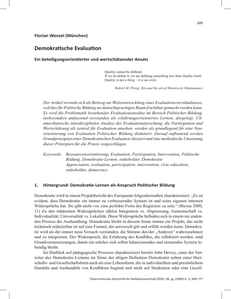 Demokratische Evaluation 309 Florian Wenzel (München) Demokratische Evaluation Ein beteiligungsorientierter und wertschätzender Ansatz Quality cannot be defined. If we do define it, we are defining something less than Quality itself. Quality is not a thing – it is an event. Robert M. Pirsig: Zen and the art of Motorcycle Maintenance Der Artikel versteht sich als Beitrag zur Weiterentwicklung eines Evaluationsverständnisses, welches für Politische Bildung im deutschsprachigen Raum fruchtbar gemacht werden kann. Es wird die Problematik bestehender Evaluationsansätze im Bereich Politischer Bildung, insbesondere umfassend verstanden als erfahrungsorientiertes Lernen, dargelegt. USamerikanische interdisziplinäre Ansätze der Evaluationsforschung, die Partizipation und Wertschätzung als zentral für Evaluation ansehen, werden als grundlegend für eine Neuorientierung von Evaluation Politischer Bildung diskutiert. Darauf aufbauend werden Grundprinzipien einer Demokratischen Evaluation skizziert und eine methodische Umsetzung dieser Prinzipien für die Praxis vorgeschlagen. Keywords: Ressourcenorientierung, Evaluation, Partizipation, Intervention, Politische Bildung, Demokratie-Lernen, stakeholder, Demokratie Appreciation, evaluation, participation, intervention, civic education, stakeholder, democracy 1. Hintergrund: Demokratie-Lernen als Anspruch Politischer Bildung Demokratie wird in einem Projektbericht des Europarats folgendermaßen charakterisiert: „Es ist evident, dass Demokratie ein immer zu verbesserndes System ist und seine eigenen internen Widersprüche hat. Sie gibt nicht vor, eine perfekte Form des Regierens zu sein.“ (Birzea 2000, 11) Zu den inhärenten Widersprüchen zählen Integration vs. Abgrenzung, Gemeinschaft vs. Individualität, Universalität vs. Lokalität. Diese Widersprüche befinden sich in einem nie endenden Prozess der Aushandlung. Demokratie bleibt in diesem Sinne immer ein Projekt, das nicht technisch reduzierbar ist auf eine Formel, die universell gilt und erfüllt werden kann. Demokratie wird als der immer neue Versuch verstanden, die Stimme des/der „Anderen“ wahrzunehmen und zu integrieren. Der Widerspruch, die Erfahrung des Konflikts, die reflektiert werden, sind Grundvoraussetzungen, damit ein solches sich selbst balancierendes und steuerndes System lebendig bleibt. Im Hinblick auf pädagogische Prozesse charakterisiert bereits John Dewey, einer der Vorreiter des Demokratie-Lernens im Sinne der obigen Definition Demokratie neben einer Herrschafts- und Gesellschaftsform auch als eine Lebensform, die in individuellem und persönlichem Handeln und Aushandeln von Konflikten beginnt und nicht auf Strukturen oder eine GesellÖsterreichische Zeitschrift für Politikwissenschaft (ÖZP), 38. Jg. (2009) H. 3, 309–??? Florian Wenzel 310 schaftsordnung zu beschränken ist – dies soll in Bildungsprozessen Politischer Bildung erlebbar werden: „Ein Gramm Erfahrung ist besser als eine Tonne Theorie, einfach deswegen, weil jede Theorie nur in der Erfahrung lebendige und der Nachprüfung zugängliche Bedeutung hat.“ (Dewey 1993, 193) Um dieser Dialektik gerecht zu werden, muss der Machbarkeitsanspruch demokratischer Bildung aufgegeben werden. Im Mittelpunkt müssen Prozesse stehen, die immer wieder einzigartig sind, nie vollständig planbar oder bis ins Letzte generalisierbar. DemokratieLernen heißt deshalb als Konsequenz der Begriffsanalyse: immer neu mit Prozessen umgehen und sich immer neu vom Anderen (der Meinung, der Kultur, des Standpunktes) überraschen lassen können und anerkennen, dass sich Demokratie einfacher normativer Vermittlung entzieht. Aus Sicht der Soziologie gibt es für pädagogische Prozesse insgesamt keine „funktionsfähige Kausaltechnologie“ (Luhmann / Schorr 1982, 9). Gäbe es eine solche, so ließe sie sich idealtypisch in Analogie zum Fabrikmodell begreifen, in welchem die Heterogenität des Ausgangsmaterials am Ende zu einer beliebigen Menge je homogener Produkte zusammengefügt wird. Luhmann schärft in seiner Auseinandersetzung mit dem Erziehungssystem den Blick für dieses Grundparadox von Pädagogik, welches erhebliche Auswirkungen auf die Art, Möglichkeiten und Grenzen von Evaluation hat. Bildung ist ein kreativer, Potenzial entfaltender Prozess, hat mit der Freiheit des Menschen zu tun und kann sich nicht in technischen Machbarkeitsvorstellungen erschöpfen: „Bildung wird in der geisteswissenschaftlichen Tradition als Emanzipation, im Resultat also als Freiheit begriffen.“ (Luhmann 2002, 196) Die inhärenten Widersprüche von Demokratie, die Erfahrungs- und Prozessorientierung von Demokratie-Lernen sowie das Grundparadox von Bildung erweitern Politische Bildung in ihrem Grundverständnis und erfordern ein Evaluationsverständnis, das nicht wie bisher nach einem Input-Output Modell auf die erzielten Wirkungen pädagogischer Interventionen fokussiert (siehe Schröder/Streblow 2007 zu verschiedenen klassischen und neueren Ansätzen im Feld). 2. Herausforderung: Demokratische Evaluation Annäherungen Mit dieser Ausgangslage ist Evaluation vor besondere Herausforderungen gestellt, sollen die selbstformulierten Bildungsansprüche von Politischer Bildung als Demokratie-Lernen nicht durch unterkomplexe und mechanistische Formen des Evaluierens ihrer Maßnahmen und Programme unterlaufen oder gar konterkariert werden. Es gilt, „andere Perspektiven zu Worte kommen zu lassen, Urteile von anderen zu integrieren und Bewertungsmonopole zu öffnen. Evaluation ist kein Instrument zur technischen Überprüfung und Kontrolle (zumindest nicht ausschließlich) klar definierter Zielvorgaben am Ende einer Entwicklung (…) Evaluation ist ein sozialer, kein messtechnischer Prozess.“ (Herrmann/Höfer 1999, 102) So verstanden hat Evaluation selber Bildungswirkung: Evaluation Politischer Bildung ist eine im besten Falle demokratische Intervention, die in den Grundwerten dem entspricht, was das jeweilige Projekt oder der jeweilige Le