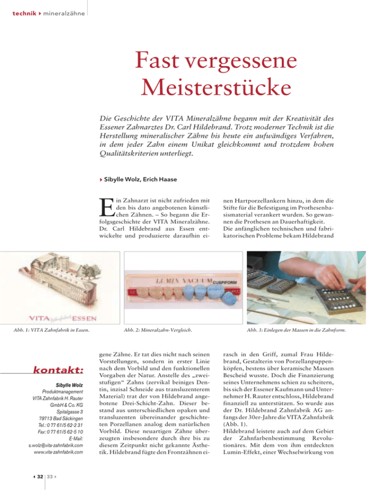 technikmineralzähne Fast vergessene Meisterstücke Die Geschichte der VITA Mineralzähne begann mit der Kreativität des Essener Zahnarztes Dr. Carl Hildebrand. Trotz moderner Technik ist die Herstellung mineralischer Zähne bis heute ein aufwändiges Verfahren, in dem jeder Zahn einem Unikat gleichkommt und trotzdem hohen Qualitätskriterien unterliegt. Sibylle Wolz, Erich Haase E in Zahnarzt ist nicht zufrieden mit den bis dato angebotenen künstlichen Zähnen. – So begann die Erfolgsgeschichte der VITA Mineralzähne. Dr. Carl Hildebrand aus Essen entwickelte und produzierte daraufhin ei- Abb. 1: VITA Zahnfabrik in Essen. kontakt: Sibylle Wolz Produktmanagement VITA Zahnfabrik H. Rauter GmbH & Co. KG Spitalgasse 3 79713 Bad Säckingen Tel.: 0 77 61/5 62-2 31 Fax: 0 77 61/5 62-5 10 E-Mail: s.wolz@vita-zahnfabrik.com www.vita-zahnfabrik.com 32 33 Abb. 2: Mineralzahn-Vergleich. gene Zähne. Er tat dies nicht nach seinen Vorstellungen, sondern in erster Linie nach dem Vorbild und den funktionellen Vorgaben der Natur. Anstelle des „zweistufigen“ Zahns (zervikal beiniges Dentin, inzisal Schneide aus transluzenterem Material) trat der von Hildebrand angebotene Drei-Schicht-Zahn. Dieser bestand aus unterschiedlichen opaken und transluzenten übereinander geschichteten Porzellanen analog dem natürlichen Vorbild. Diese neuartigen Zähne überzeugten insbesondere durch ihre bis zu diesem Zeitpunkt nicht gekannte Ästhetik. Hildebrand fügte den Frontzähnen ei- nen Hartporzellankern hinzu, in dem die Stifte für die Befestigung im Prothesenbasismaterial verankert wurden. So gewannen die Prothesen an Dauerhaftigkeit. Die anfänglichen technischen und fabrikatorischen Probleme bekam Hildebrand Abb. 3: Einlegen der Massen in die Zahnform. rasch in den Griff, zumal Frau Hildebrand, Gestalterin von Porzellanpuppenköpfen, bestens über keramische Massen Bescheid wusste. Doch die Finanzierung seines Unternehmens schien zu scheitern, bis sich der Essener Kaufmann und Unternehmer H. Rauter entschloss, Hildebrand finanziell zu unterstützen. So wurde aus der Dr. Hildebrand Zahnfabrik AG anfangs der 30er-Jahre die VITA Zahnfabrik (Abb. 1). Hildebrand leistete auch auf dem Gebiet der Zahnfarbenbestimmung Revolutionäres. Mit dem von ihm entdeckten Lumin-Effekt, einer Wechselwirkung von mineralzähnetechnik warmen und kalten, changierenden Farbtönen, etablierte er die Lumin-Farbskala noch vor Beginn des Zweiten Weltkrieges. Ab den 80er-Jahren sprach man auf allen Kontinenten von VITA-Farben. Bei der Farbbestimmung sind VITA-Farben weltweit der Standard. Auch mit dem VITA Toothguide 3D-Master hat die VITA einen weiteren entscheidenden Fortschritt in der Farbbestimmung und Farbreproduktion und somit in der natürlichen Ästhetik realisiert. Jeder Zahn ist ein Unikat Die Herstellung von Mineralzähnen ist sehr arbeitsaufwändig. Rund fünfzig Mal (!) muss ein Keramikzahn in die Hand genommen werden, bis er fertiggestellt ist. Da Mineralzähne preislich mit Kunststoffzähnen vergleichbar sind, ist die Rendite dementsprechend geringer. Dies hielt die Bad Säckinger Zahnfabrik allerdings nie davon ab, den Markt mit VITA Lumin Vacuum zu bedienen. Ausgangsmaterial für keramische Zähne sind entsprechend aufbereitete minerali- Abb. 4: Entgraten der gebackenen Zähne. Wie sieht Dr. Norbert Thiel, Ressortleiter Anorganische Chemie der VITA Zahnfabrik, die Zukunft der Keramikzähne? sche Massen. Die mit keramischen Farbkörpern eingefärbten Pulver werden zur Plastifizierung und Formbarkeit mit organischen Bindemitteln (Plastifizierer) vermischt. Für die Formgebung der Zähne werden zweiteilige Metallformen, sog. Matrizen, verwendet. Da die Keramikmasse während des Brennens schwindet, sind die Formen für die Zähne entsprechend der Brennschwindung um ca. 20 Volumenprozent größer gestaltet (Abb. 2). Durch die VITA Formenbau-Abteilung werden die Formen ständig gepflegt, denn Präzision für das Qualitätsprodukt „Zähne“ beginnt ganz vorn – beim Formenbau. Für die Schichtung der Zähne werden die angemischten und unterschiedlich eingefärbten Keramikmassen von Hand (Abb. 3) in die zweiteilige Metallform eingelegt. Mit dem Schichten wird auch eine Hülse in den „Zahnkörper“ (Frontzahn) eingebracht, in die später der Krampon eingelötet wird. Die Schichtung wird entsprechend einer Vorlage Zahn für Zahn manuell vorgenommen, so ist jeder Zahn ein Unikat. Abb. 5: Bemalen der Zahnhälse und Fissuren. „Mineralzähne haben auf jeden Fall einen festen Platz in der Prothetik. In vielen Märkten werden sie konstant nachgefragt oder gar bevorzugt verarbeitet. Es ist wichtig zu hinterfragen, warum diese Länder so erfolgreich mit keramischen Zähnen arbeiten. Sicher kann ich Ihnen auf Anhieb einige positive Argumente für die Zahnlinie VITA Lumin Vacuum nennen – wie die Ästhetik, Biokompatibilität und die Abrasi- Abb. 6: Aufstecken der gebrannten Zähne auf die Garniturenblättchen. onswerte der Zähne. Durch eine gezielte Betrachtung des Marktes, sind wir bei substanziellen Input der Anwender gerne bereit, eine Renaissance des VITA Mineralzahnes einzuleiten. Oberstes Ziel von VITAist es, unsere Kunden erfolgreicher zu machen, und das gelingt in erster Linie, wenn unsere Kunden die Produkte erhalten, welche sie zu einer optimalen Erfüllung ihrer Arbeit benötigen.“ ZWL 06 2005 technikmineralzähne Der Brennvorgang – eine Wissenschaft für sich Die in den Formen geschichteten Mineralzähne werden bei ca. 200 °C heißgepresst; dies wird als bisquitieren bezeichnet. Die verfestigten Rohlinge werden aus der Form gelöst, die Pressgrate mit einem Schmirgelhölzchen entfernt (Abb. 4). Danach werden der Zahnhals und die Fissur bei den Seitenzähnen (Abb. 5) von Hand bemalt. Das Entfernen der Pressgrate mit einem Schmirgelhölzchen nennt man verputzen. Danach werden die Zahn-Rohlinge für den anschließenden Brennprozess auf eine mit Quarzsand bestreute Brennplatte aufgesetzt. Die Molaren sind Abb. 7: