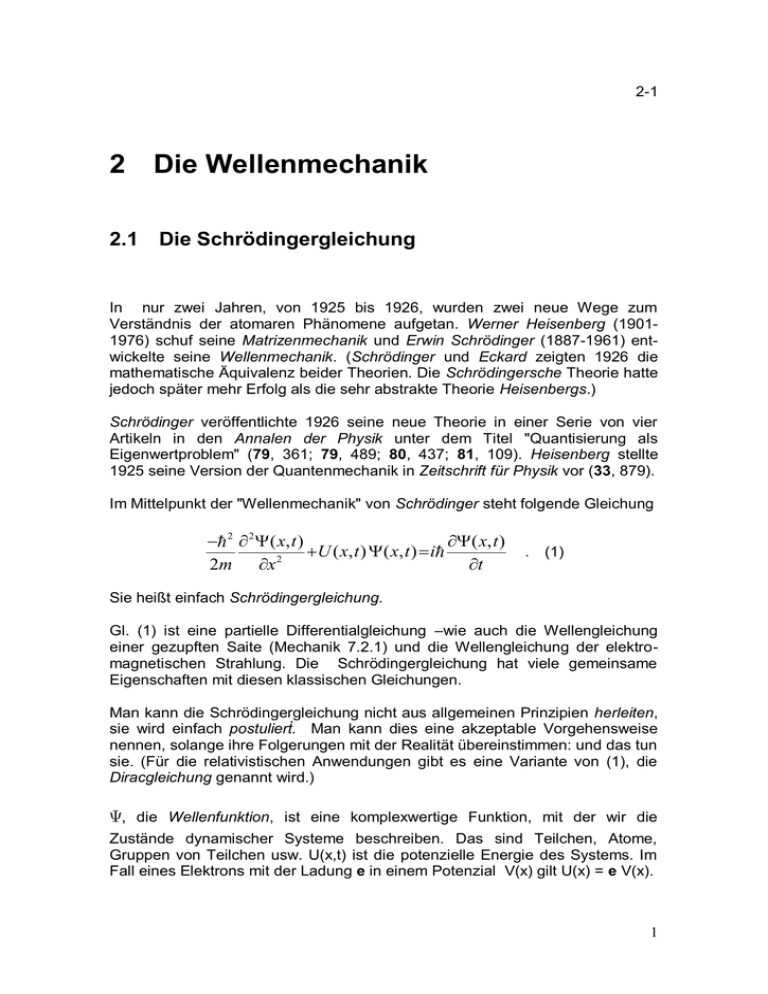 2-1 2 Die Wellenmechanik 2.1 Die Schrödingergleichung In nur zwei Jahren, von 1925 bis 1926, wurden zwei neue Wege zum Verständnis der atomaren Phänomene aufgetan. Werner Heisenberg (19011976) schuf seine Matrizenmechanik und Erwin Schrödinger (1887-1961) entwickelte seine Wellenmechanik. (Schrödinger und Eckard zeigten 1926 die mathematische Äquivalenz beider Theorien. Die Schrödingersche Theorie hatte jedoch später mehr Erfolg als die sehr abstrakte Theorie Heisenbergs.) Schrödinger veröffentlichte 1926 seine neue Theorie in einer Serie von vier Artikeln in den Annalen der Physik unter dem Titel "Quantisierung als Eigenwertproblem" (79, 361; 79, 489; 80, 437; 81, 109). Heisenberg stellte 1925 seine Version der Quantenmechanik in Zeitschrift für Physik vor (33, 879). Im Mittelpunkt der "Wellenmechanik" von Schrödinger steht folgende Gleichung 2 2 ( x, t ) ( x, t ) U ( x , t ) ( x , t ) i 2m x 2 t . (1) Sie heißt einfach Schrödingergleichung. Gl. (1) ist eine partielle Differentialgleichung –wie auch die Wellengleichung einer gezupften Saite (Mechanik 7.2.1) und die Wellengleichung der elektromagnetischen Strahlung. Die Schrödingergleichung hat viele gemeinsame Eigenschaften mit diesen klassischen Gleichungen. Man kann die Schrödingergleichung nicht aus allgemeinen Prinzipien herleiten, sie wird einfach Man kann dies eine akzeptable Vorgehensweise nennen, solange ihre Folgerungen mit der Realität übereinstimmen: und das tun sie. (Für die relativistischen Anwendungen gibt es eine Variante von (1), die Diracgleichung genannt wird.) , die Wellenfunktion, ist eine komplexwertige Funktion, mit der wir die Zustände dynamischer Systeme beschreiben. Das sind Teilchen, Atome, Gruppen von Teilchen usw. U(x,t) ist die potenzielle Energie des Systems. Im Fall eines Elektrons mit der Ladung e in einem Potenzial V(x) gilt U(x) = e V(x). 1 2-2 Wir sehen also: zu jedem dynamischen System gehört in der Quantenmechanik eine Wellenfunktion Psi: (x,t). Im Augenblick wollen wir uns uns nur darum kümmern, wie man die Funktion (x,t) finden kann, die einem gegebenen System entspricht, das sich in einem bestimmten Zustand befindet. Im Allgemeinen verändert sich der Zustand des Systems im Laufe der Zeit in einer komplizierten Art und Weise, sodass (x,t) in den Koordinaten x und t nicht separierbar ist. Dennoch gibt es Fälle (Ausnahmen), in denen (x,t) separabel ist und die folgende Gestalt hat (x,t) = ψ(x)·φ(t) . (2) Das geschieht zum Beispiel, wenn U(x) nicht explizit von der Zeit abhängt. (Das "große" Psi in (x,t) und das "kleine" Psi in ψ(x) sehen fast gleich aus. Ich werde daher immer die Koordinaten dazuschreiben, wenn die Gefahr einer Verwechslung besteht. Ein Psi ohne die Koordinate t ist immer ein "kleines" Psi. Die Methode der Separation der Variablen ist ausführlich in Mechanik 7.7.2 beschrieben worden.) Das Einsetzen von (2) in (1) –und die Division durch ψ(x)·φ(t)- liefert 2 1 d2 1 d U( x ) i : E 2m dx 2 dt (3) worin E die Separationskonstante ist. Die Funktion ψ(x), die nur eine Funktion von x ist, genügt der zeitunabhängigen Schrödingergleichung (4) (eine gewöhnliche Differentialgleichung): 2 d2( x ) (E U( x )) ( x ) 0 2m dx 2 (4) Wir zeigen weiter unten, dass die Konstante E nichts anderes ist als die Gesamtenergie des Systems. (Das war der Grund dafür, die Separationskonstante E zu nennen.) Gewöhnlich schreibt man Gl. (4) in einer einfacheren Form, nämlich Hψ=Eψ , (5) worin H wie folgt definiert ist: H := -ħ2/2m ·D2 + U (6) 2 2-3 mit D := d/dx und D2 := d2/dx2. Die Größe H ist ein Operator und wird Hamiltonoperator genannt (W. R. Hamilton, 1805 - 1865). Die Verallgemeinerung des Operators D 2 auf drei Dimensionen ist der sogenannte Laplaceoperator (J. G. Laplace, 1749 - 1827), Mechanik 7.2.1: : 2 2 x2 2 y2 2 z2 (7) Man betrachtet die Symbole D, D2, H usw. als Operatoren, die auf die Funktion einwirken, die rechts von ihnen steht. Im Augenblick dienen sie nur dazu, die zeitunabhängige Schrödingergleichung einfacher zu schreiben. Später werden wir diesen Operatoren ein ganzes Kapitel widmen, denn sie sind von grundlegender Bedeutung für eine symbolische Formulierung der Quantenmechanik. Im Mechanikkurs, Abschnitt 3.5, haben wir bereits den Operator D eingeführt. In 4.4 erscheint eine Gleichung des Typs (5). Eine Gleichung dieser Gestalt wird Eigenwertgleichung genannt, denn eine Lösung einer derartigen Gleichung ist ein Eigenwert. In der Mechanik wurden die Operatoren auf Vektoren angewandt, jetzt wirken sie auf eine Funktion ein, auf die Wellenfunktion ψ(x). In der symbolischen Formulierung der Quantenmechanik werden wir die ψFunktionen ebenfalls als Vektoren ansehen. Auf diese Weise erhalten wir eine beträchtliche Vereinfachung der Theorie. Die Funktion φ(t) ist Lösung der Gleichung d( t ) i E( t ) dt (8) Integration liefert ∫dφ/φ + c1' = -iE/ħ ∫dt + c2' oder ∫dφ/φ = -iE/ħ ∫dt + c', mit c' = c2' -c1'. Mit c' := ln c erhalten wir ln φ = -iEt/ħ + ln c, oder iEt iEt ln ln e ln c ln(c e ) ( t ) c e -und schließlich iEt (9) Den Faktor c kann man gleich 1 wählen. Wenn wir die Lösungen von (4) kennen, haben wir auch die allgemeine Lösung von (1), nämlich 3 2-4 ( x, t ) c n n ( x) e iEn t / (10) n 1 Die Schrödingergleichung (4) enthält nicht die imaginäre Zahl i. Man nennt die Funktionen ψ(x) auch Eigenfunktionen, sie werden immer mit dem kleinen Buchstaben ψ (Psi) bezeichnet. Die möglichen Energiewerte sind die Eigenwerte des Hamiltonoperators H. Um die Anwendung von (4) zu illustrieren, betrachten wir ausführlich das folgende Beispiel eines Teilchens in einem “Potentialkasten” oder „Potentialtopf“. 2.2 Ein Teilchen in einem eindimensionalen “Kasten” Fig. 1 Das Bild zeigt eine Strecke von x = 0 bis x = L, auf der sich ein Teilchen frei bewegen kann. An den Stellen 0 und L gibt es unendlich hohe „Wände“ der potenziellen Energie. Es handelt sich natürlich um ein leicht irreales Beispiel, denn wir we