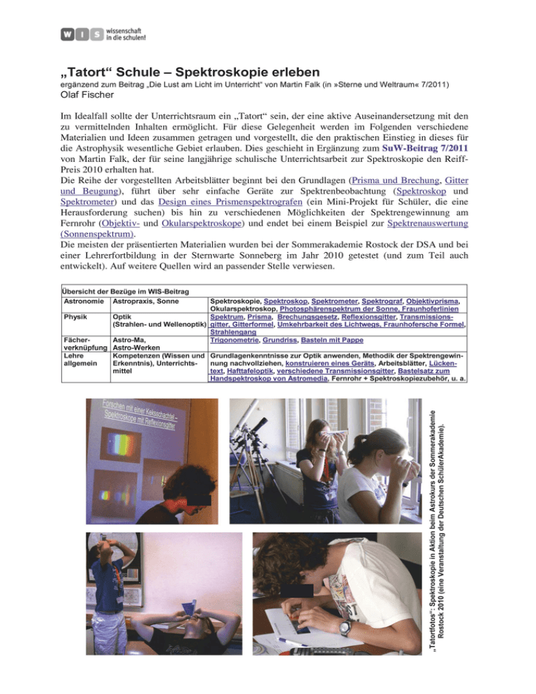 (→zurück zum Anfang) ARBEITSBLATT Tafeloptik mit Prisma Wenn man davon ausgeht, dass die Ablenkung eines Lichtstrahls beim Durchgang durch ein Prisma verschieden sein kann, so kommt man unter Zugrundelegung der Tatsache der Umkehrbarkeit des Lichtwegs zu der Folgerung, dass der symmetrische Verlauf einen Extremwert liefern muss. Dies ist experimentell zu untersuchen. Mittels Prisma, Kreisscheibe mit Winkelteilung und ε einer geeigneten Strahlquelle (am besten Laser) kann mit der Wandtafeloptik am Prisma die Abhängigkeit des Ablenkungswinkels δ vom Einfallswinkel α1 untersucht werden. α1 β1 ε β2 δ α2 1.) Experiment Bestimme experimentell für das gegebene Prisma die Ablenkwinkel δ für 7 verschiedene Einfallswinkel α1, die den symmetrischen Strahlenverlauf (durchgehender Strahl senkrecht zur Winkelhalbierenden) einschließen (siehe zum Vergleich auch unter: http://leifi.physik.unimuenchen.de/web_ph09/umwelt_technik/11prisma/PrismA.html ). Das Prisma (hier in Form eines Dreiecks mit den Innenwinkeln 30°, 60°, 90°) wird wie dargestellt mit der Hypotenuse längs der x-Achse der Winkelskala ausgerichtet und zum Fußpunkt der y-Achse der Skala hin mit dem Laser bestrahlt. Zum Fußpunkt des aus dem Prisma austretenden Strahls wird das auf einen Bogen Papier gezeichnete Ausfallslot α1 geschoben. Dann kann die Richtung des 1 austretenden Strahls markiert und vermessen 120° δ (α2). Der Ablenkwinkel δ ergibt sich schließlich aus: δ = α2 - (60°-α1) (siehe Bild). δ Nr. 180°-120°-α1 α2 Einfallswinkel Ausfallswinkel Ablenkwinkel α1 [°] α2 [°] δ [°] 1 20° 2 30° 3 40° 4 50° 5 60° 6 70° 7 80° 2.) Erläuterung Erläutere, wie man von der Tatsache der Umkehrbarkeit des Lichtwegs darauf schließen kann, dass der symmetrische Strahlverlauf einen Extremwert für δ markiert. 3.) Berechnung δ +ε Bestimme mit Hilfe der gesin gebenen Fraunhoferschen 2 Formel (rechts), die für den n = ε symmetrischen Strahlverlauf gilt, die Brechzahl n des Prismas. sin 2 (→zurück zum Anfang) ARBEITSBLATT Freihandexperiment mit Gittern Linienabstand a Entfernung s Gitter mit 80 Linien/mm Führe folgende Aufgaben durch: 1.) Beobachtung Vergleiche mit Hilfe des gezeigten Aufbaus die Spektren verschiedener Gitter. 2.) Messung & Auswertung 1 Bestimme die Wellenlänge λ des Laserlichts, indem du das Spektrum mit einem Gitter mit 80 Linien pro Millimeter ausmisst und die folgende Gleichung anwendest: a = tan α ⋅ s ≈ sin α ⋅ s = n⋅λ ⋅ s. d (d … Spaltabstand bzw. Gitterkonstante, n … Ordnung) 3.) Messung & Auswertung 2 Bestimme nun die Gitterkonstante für ein gegebenes Gitter. ARBEITSBLATT Spektroskop mit Reflexionsgitter (→zurück zum Anfang) Mit Hilfe einer Verpackungsschachtel, einer nicht mehr gebrauchten CD (diese hat ca. 630 Rillen pro mm) sowie etwas Klebstoff und Tesa-Band lässt sich schnell ein Handspektroskop anfertigen, dass es sogar ermöglicht, einige Fraunhoferlinien im Sonnenspektrum zu betrachten. Ohne größeren Aufwand ist es sogar möglich, das im Spektroskop sichtbare Sonnenspektrum mit einer einfachen Digitalkamera zu fotografieren, um es dann auswerten zu können. Bauanleitung 1. Fertige aus einer Verpackungsschachtel ein längliches Gehäuse (quadratisches Prisma: ca. 3,5 cm × 3,5 cm × 30 cm). Lasse dabei Grund- und Deckfläche des Prismas noch offen. 2. Stelle nun einen Keil (Dreiecksquerschnitt mit den Innenwinkeln 30°, 60°, 90°) aus Kartonresten her, der genau in das Gehäuse passt. (Trigonometrie hilft hier!) 3. Schneide ein CD-Stück aus (Teil eines Kreissektors, ca. 30°) und befestige es auf dem Kartonkeil (oben und unten mit Klebeband). 4. Baue den Kartonkeil in das Gehäuse ein, (befestige es) und verschließe das Gehäuse lichtdicht an dieser Seite. 5. Schneide mittig über dem CD-Stück ein Beobachtungsfenster in das Gehäuse (Größe: in Längsrichtung ca. 1cm, quer ca. 0,5 cm). 6. Verschließe jetzt auch das andere Gehäuseende durch einen einstellbaren Spalt. Achte dabei auf glatte Schnitte. Aufgabe Betrachte das Spektrum der Sonne durch das Keksschachtelspektroskop und stelle den Spalt so ein, dass einige Fraunhoferlinien erkennbar sind. Identifiziere die Linien C, D, H, K (siehe Arbeitsblatt „Auswertung eines Spektrums der Sonne“ weiter hinten). Bei welcher Farbe und welcher Wellenlänge erscheinen sie? Welche Elemente sind für die Linien verantwortlich? Ohne größeren Aufwand ist es sogar möglich, das im Spektroskop sichtbare Sonnenspektrum mit einer einfachen Digitalkamera zu fotografieren (siehe Bild rechts), um es auswerten zu können. ARBEITSBLATT (→zurück zum Anfang) „Prüfung der Skala des Handspektrometers von Astromedia“ Das Handspektrometer von Astromedia besitzt ein Transmissionsgitter mit einer Gitterkonstante von 1000 nm. Die Skala dieses Spektrometers ist in vergrößerter Form unten gegeben. Erkunde die Skala durch folgende Aufgaben: 1.) Leite eine Formel zur Berechnung des Abstands a eines Skalenstrichs für das Spektrum der 1. Beugungsordnung (n = 1) von der Nullmarke her. Die Nullmarke für den Abstand a (= a 1+ a2) wird durch die nullte Ordnung (n = 0), die mit dem Eintrittsspalt zusammenfällt, gebildet. Die für die Herleitung nötigen Größen findest Du in der Zeichnung unten. 2.) Gegeben sind: s = 11 cm und β = 74°. Berechne nun die Positionen einiger Skalenstriche, die in der unten stehenden Tabelle aufgeführt sind und trage sie dort ein. 3.) Vermesse nun die entsprechenden Skalenpositionen direkt auf der Skala des Handspektrometerbausatzes oder indirekt (maßstäblich umrechnen) am gegebenen Bild und führe den Vergleich zwischen Rechnung und Messung durch. Kommentiere Deine Ergebnisse. Skala des Handspektroskops von Astromedia 65 mm a1 a2 β Skala a s α Transmissionsgitter d = 1000 nm Zur Erinnerung: Bei einem Beugungsgitter erscheinen bei der Wellenlänge λ und dem Spaltabstand d die Beugungsmaxima (n = 0 … ) unter dem Winkel α, wobei gilt: sin α ⋅ d = n ⋅ λ . Wellenl