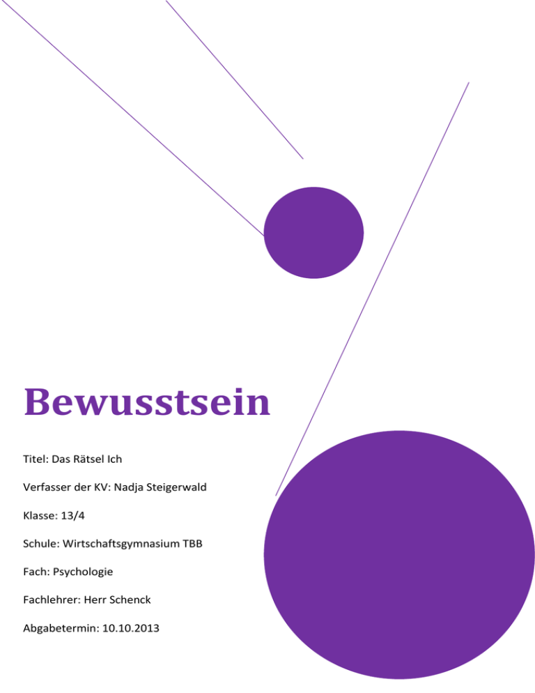 Bewusstsein Titel: Das Rätsel Ich Verfasser der KV: Nadja Steigerwald Klasse: 13/4 Schule: Wirtschaftsgymnasium TBB Fach: Psychologie Fachlehrer: Herr Schenck Abgabetermin: 10.10.2013 www.KlausSchenck.de/ Psychologie / Die Suche nach dem Ich/ Bewusstsein / Seite 1 von 18 „Das Rätsel Ich“ von Rainer Harf/ Kopiervorlage: fürs Internet wurden Fotos entfernt! (Nadja Steigerwald / WG 13 / 2013/14) Inhaltsverzeichnis 1. Farblegende………………………………………………………. S.2 2. Definition: Bewusstsein……………………………………… S.3 2.1 Drei Stufen des Bewusstseins…………………………. S.4 3. Wie/Wo entsteht das Bewusstsein?..................... S.5 3.1 griechischer Denker Platon…………………………….. S.5 3.2 Philosoph René Descartes………………………………. S.6 3.3 Arzt Paul Broca………………………………………………. S.6 3.4 Stand der Wissenschaft heute………………………… S.7 3.4.1 Wichtige Bereiche im Gehirn……………………… S.7 3.4.2 Neuronen…………………………………………………… S.8-9 3.5 Resultat………………………………………………………….. S.10 4. Die neun Zustände des Bewusstseins………………… S.11-12 5. Autobiografisches Gedächtnis……………………………. S.13 6. Aufmerksamkeitsbewusstsein…………………………… S.14 6.1 Thalamus……………………………………………………….. S.15 6.2 Beispiel Auge………………………………………………….. S.15 7. Der Weg des Reizes ins Bewusstsein………………….. S.16 8. Infobox………………………………………………………………. S.16 Endnoten………………………………………………………………. S.17 Literaturverzeichnis……………………………………………….. S.18 Selbstständigkeitserklärung…………………………………… S.18 www.KlausSchenck.de/ Psychologie / Die Suche nach dem Ich/ Bewusstsein / Seite 2 von 18 „Das Rätsel Ich“ von Rainer Harf/ Kopiervorlage: fürs Internet wurden Fotos entfernt! (Nadja Steigerwald / WG 13 / 2013/14) 1. Farblegende Wichtig! Bewusstsein, Ich Experte Vermutung www.KlausSchenck.de/ Psychologie / Die Suche nach dem Ich/ Bewusstsein / Seite 3 von 18 „Das Rätsel Ich“ von Rainer Harf/ Kopiervorlage: fürs Internet wurden Fotos entfernt! (Nadja Steigerwald / WG 13 / 2013/14) 2. Definition: Bewusstsein 1 Selbstwahrnehmung das eigene Ich Bewusstsein sich und die Welt erfahren Privater Zustand niemand kann vollends nachfühlen was ein anderes Ich erlebt Bewusstsein Leben keine Bedeutung www.KlausSchenck.de/ Psychologie / Die Suche nach dem Ich/ Bewusstsein / Seite 4 von 18 „Das Rätsel Ich“ von Rainer Harf/ Kopiervorlage: fürs Internet wurden Fotos entfernt! (Nadja Steigerwald / WG 13 / 2013/14) 2.1 drei Stufen des Bewusstseins2 aufmerksame Bewusstheit Bewusstsein IchBewusstheit momentane Bewusstheit www.KlausSchenck.de/ Psychologie / Die Suche nach dem Ich/ Bewusstsein / Seite 5 von 18 „Das Rätsel Ich“ von Rainer Harf/ Kopiervorlage: fürs Internet wurden Fotos entfernt! (Nadja Steigerwald / WG 13 / 2013/14) 3. Wie/ Wo entsteht Bewusstsein?3 Für lange Zeit galt: Naturwissenschaftler Unseriös: Bewusstsein zu ergründen Nur Geisteswissenschaftlern erlaubt Begründung Mentale Vorgänge sind so anders als stoffliche Prozesse 3.1 griechischer Denker Platon4 Trennung: Geist 5 Platon Körper Gefangen in vergänglichem Körper, Gerist existiert außerhalb der Gesetze der Physik Dieser Glaube hielt sich bis in die Neuzeit www.KlausSchenck.de/ Psychologie / Die Suche nach dem Ich/ Bewusstsein / Seite 6 von 18 „Das Rätsel Ich“ von Rainer Harf/ Kopiervorlage: fürs Internet wurden Fotos entfernt! (Nadja Steigerwald / WG 13 / 2013/14) 3.2 Philosoph René Descartes „Es gibt zwei „Wesenheiten“: die materiellen und die geistigen. Über die Zirbeldrüse, ein erbsengroßes Organ im Gehirn, können die beiden miteinander in Kontakt treten.“ 6 7 3.3 Arzt Paul Broca8 Sezierte Hirn eines Franzosen, der seine Sprachfähigkeit nahezu verloren hat Kehlkopf und Zunge völlig intakt Broca bemerkte auffällige Veränderung an linker Großhirnrinde Schlussfolgerung: mit dieser Hirnregion hängt Fähigkeit des Sprechens zusammen 9 Paul Broca lebte im 19. Jahrhundert Wissenschaftliche Revolution www.KlausSchenck.de/ Psychologie / Die Suche nach dem Ich/ Bewusstsein / Seite 7 von 18 „Das Rätsel Ich“ von Rainer Harf/ Kopiervorlage: fürs Internet wurden Fotos entfernt! (Nadja Steigerwald / WG 13 / 2013/14) 3.4 Stand der Wissenschaft heute 10 gibt nicht diesen einen Ort des Bewusstseins bewusstes Denken verteilt sich auf verschiedene Regionen der Großhirnrinde (Kortex) in Kortex sitzen die Nervenzellen (Neuronen), die ständig untereinander Kommunikation betreiben viele verschiedene neuronale Prozesse lassen unser Bewusstsein entstehen 3.4.1 Wichtige Bereiche im Gehirn 11 Supplementär-motorisches Areal Willkürliche Handlungen werden „geprobt“, was sie von unwillkürlichen unterscheidet Dorsolateraler präfrontaler Kortex Verbindet unterschiedliche Ideen und Wahrnehmungen miteinander wichtige Voraussetzung für bewusstes Erleben Orbifrontaler Kortex Generiert bewusste Emotionen. Bei Inaktivität: Reaktionen auf Reize körperliche Reflexe ohne Emotionen Temporallappen Für persönliche Erinnerungen und Sprache zuständig. Ohne ihn Bewusstsein stark eingeschränkt Motorischer Kortex Sorgt für körperliches Bewusstsein. Scheint wichtig für Ich- Bewusstsein und somit für Gesamtbewusstsein Thalamus Steuert die Aufmerksamkeit und den sensorischen Input Primär visueller Kortex Ohne kein bewusstes Sehen, auch wenn andere Teile des visuellen Kortex funktionieren Temporo-partieler Übergang Speichert „Karte“ des Selbst in Beziehung zur Umwelt & sammelt Infos aus anderen Arealen Hippocampus Kontrolliert das Absp