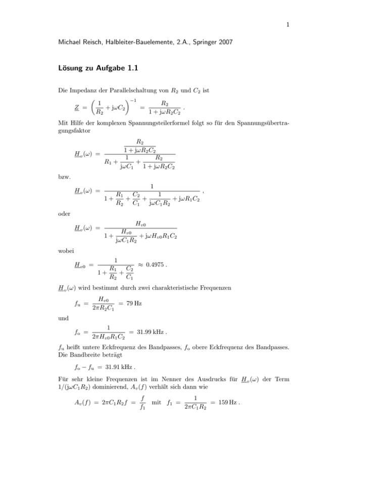 1 Michael Reisch, Halbleiter-Bauelemente, 2.A., Springer 2007 Lösung zu Aufgabe 1.1 Die Impedanz der Parallelschaltung von R2 und C2 ist ¶−1 µ R2 1 = + jωC2 . Z = R2 1 + jωR2 C2 Mit Hilfe der komplexen Spannungsteilerformel folgt so für den Spannungsübertragungsfaktor R2 1 + jωR2 C2 H v (ω) = 1 R2 R1 + + jωC1 1 + jωR2 C2 bzw. H v (ω) = 1 , C2 1 R1 + + + jωR1 C2 1+ R2 C1 jωC1 R2 oder H v (ω) = Hv0 Hv0 + jωHv0 R1 C2 1+ jωC1 R2 wobei H v0 = 1 ≈ 0.4975 . C2 R1 + 1+ R2 C1 H v (ω) wird bestimmt durch zwei charakteristische Frequenzen fu = Hv0 = 79 Hz 2πR2 C1 fo = 1 = 31.99 kHz . 2πHv0 R1 C2 und fu heißt untere Eckfrequenz des Bandpasses, fo obere Eckfrequenz des Bandpasses. Die Bandbreite beträgt fo − fu = 31.91 kHz . Für sehr kleine Frequenzen ist im Nenner des Ausdrucks für H v (ω) der Term 1/(jωC1 R2 ) dominierend, Av (f ) verhält sich dann wie Av (f ) = 2πC1 R2 f = f f1 mit f1 = 1 = 159 Hz . 2πC1 R2 2 F re q u e n z f 0 1 0 1 0 0 1 0 1 0 0 f1 1 k 1 0 k 1 k 1 0 k f2 1 0 0 k H z 1 M 1 0 0 k H z 1 M d B -6 -1 2 a v(f) -1 8 -2 4 -3 0 8 0 4 0 j -4 0 -8 0 0 F re q u e n z f Abb. 1. Bode-Diagramm für den Bandpaß (Wienbrücke mit R1 = 100 Ω, R2 = 100 Ω, C1 = 10 µF, C2 = 100 nF) In diesem Frequenzbereich steigt die Spannungsverstärkung mit zunehmender Frequenz mit 20 dB pro Dekade an; die Impedenz von R1 ist gegenüber der von C1 vernachlässigbar, die Admittanz von C2 gegenüber der von R2 , d.h. die Schaltung verhält sich wie ein RC-Hochpaß mit den Elementen C1 und R2 . Bei hohen Frequenzen dagegen wird der Nenner im Ausdruck für H v (ω) durch den Term jωR1 C2 dominiert. Die Spannungsverstärkung verhält sich dann wie A(f ) ≈ f2 f mit f2 = 1 = 15.9 kHz . 2πR1 C2 In diesem Frequenzbereich fällt die Spannungsverstärkung mit zunehmender Frequenz mit 20 dB pro Dekade ab; die Impedenz von C1 ist gegenüber der von R1 vernachlässigbar, die Admittanz von R2 gegenüber der von C2 , d.h. die Schaltung verhält sich wie ein RC-Tiefpaß mit den Elementen R1 und C2 . Die Werte von f1 und f2 lassen sich durch lineare Extrapolation des ansteigenden bzw. abfallenden Kurvenstücks im Bodeplot zu 0 dB hin bestimmen. Der Übertragungsfaktor weist zusätzlich einen Bereich auf, in dem gilt 3 1+ R1 C2 f1 + À R2 C1 f und 1+ R1 C2 f + À , R2 C1 f2 hier zeigt der Bodeplot des Bandpasses ein deutlich ausgeprägtes Plateau (Übertragungsband). In diesem gilt 1 H v (f ) ≈ 1+ C2 R1 + R2 C1 = Hv0 . Die Phasenverschiebung des Bandpasses nähert sich vom Wert 90◦ für kleine Frequenzen bei denen das Hochpaßverhalten dominiert, dem Wert 0◦ im Übertragungsband und verläuft gegen den Wert −90◦ im Bereich großer Frequenzen, in dem das Tiefpaßverhalten dominiert. 1 Michael Reisch, Halbleiter-Bauelemente, 2.A., Springer 2004 Lösung zu Aufgabe 1.2 Der komplexe Zeiger v C der Spannung über der Kapazität ergibt sich aus der Eingangsspannung (kompexer Zeiger v 1 ) nach der Spannungsteilerregel zu vC = 1 1 . v mit Y = jωC + 1 + RY 1 RS + jωL Erneutes Anwenden der Spannungsteilerregel ergibt für den komplexen Zeiger v 2 der Ausgangsspannung v2 = RS v = RS + jωL C RS µ (RS + jωL) 1 + jωRC + = RS v R + RS + jω(RS RC + L) − ω 2 LRC 1 = RS 1 v , R + RS 1 + jω/ω1 − (ω/ω2 )2 1 R RS + jωL ¶ v1 wobei RS RC + L ω1 1 = 47.7 kHz = bzw. f1 = ω1 R + RS 2π und 1 = ω2 r LRC R + RS bzw. f2 = ω2 = 2.76 MHz . 2π Der Effektivwert der an RS abgegebenen Leistung ergibt sich nun aus ¶2 2 µ 1 |v |2 1 v1 RS P (f ) = 2 = 2RS 2 R + RS RS |1 + jf/f1 − (f/f2 )2 |2 zu 2.22 mW P (f ) = ¯ ¶2 ¯¯2 µ ¯ f f ¯ ¯ − ¯ ¯1 + j ¯ 47.7 kHz 2.76 MHz ¯ Hieraus folgt das Verstärkungsmaß in dBm µ ¶ P ap (f ) = 10 dBm log 1 mW £ ¤ = 10 dBm log(2.22) − 2 log |1 + jf/f1 − (f/f2 )2 | Abbildung ?? zeigt den aus dem asymptotischen Verhalten ermitteln Verlauf des Bode-Diagramms. Für f ¿ f1 ist die abgegebene Leistung nahezu frequenzunabhängig (3.46 dBm), für f > f1 fällt sie zunächst mit 20 dBm/dec um für f > f2 dann mit 40 dBm/dec zu fallen. 2 1 0 d B m 2 .7 6 M H z 4 7 .7 k H z 1 k 1 0 k -2 0 -4 0 Abb. 1. An RS abgegebene Leistung 1 M 1 0 M H z 1 Michael Reisch, Halbleiter-Bauelemente, 2.A., Springer 2007 Lösung zu Aufgabe 1.3 (a) Die bei der maximal zulässigen Verlustleistung Pzul auftretende Übertemperatur ist ∆T = Pzul Rth = 150 K . Die maximal zulässige Bauteiltemperatur ist demzufolge 450 K. (b) Falls keine Wärme abgeführt wird, dient die gesamte zugeführte Leistung P zur Erhöhung der im Bauteil gespeicherten Wärmeenergie, d.h. Cth · ∆T (t) = P · t . Die Zeit nach der die Übertemperatur ∆T = 150 K erreicht ist, ergibt sich daraus zu t = Cth · ∆T = 3.75 s . P (c) Die in (b) verwendete Näherung darf nur für Zeiten, die klein sind im Vergleich zur thermischen Zeitkonstanten τth = Rth Cth = 30 s verwendet werden. Unter Berücksichtigung der Wärmeabfuhr gilt · µ ¶¸ t . ∆T (t) = P Rth 1 − exp − τth Die Übertemperatur ∆T = 150 K ergibt sich daraus nach der Zeit µ ¶ ∆T t = −τth ln 1 − = 4s P Rth was annähernd mit dem Ergebnis aus (b) übereinstimmt. 1 Michael Reisch, Halbleiter-Bauelemente, 2.A., Springer 2007 Lösung zu Aufgabe 1.4 Die Übertemperatur des Widerstands errechnet sich aus der umgesetzten Verlustleistung ∆T = P Rth , wobei P = RI 2 mit dem Widerstandswert bei der Betriebstemperatur zu ermitteln ist R = R0 (1 + αR ∆T ) . Für die Übertemperatur ergibt sich so die Beziehung ∆T = Rth R0 (1 + αR ∆T )I 2 , bzw. ∆T = Rth R0 I 2 = 50 K . 1 − αR R0 Rth I 2 Der Widerstandswert bei Betriebstemperatur ist deshalb 50 Ω, d.h. der Strom I = 0.1 A ruft am Widerstand den Spannungsabfall V = 5 V hervor. 1 Michael Reisch, Halbleiter-Bauelemente, 2.A., Springer 2007 Lösung zu Aufgabe 1.5 In 1 mol einer Substanz sind 6.022 · 1023 Atome (bzw. Moleküle) enthalten. Aus der Dichte und der molaren Masse ergibt sich die Anzahl der mol in 1 cm3 Silizium und daraus die Dichte der Atome im Siliziumkristall 