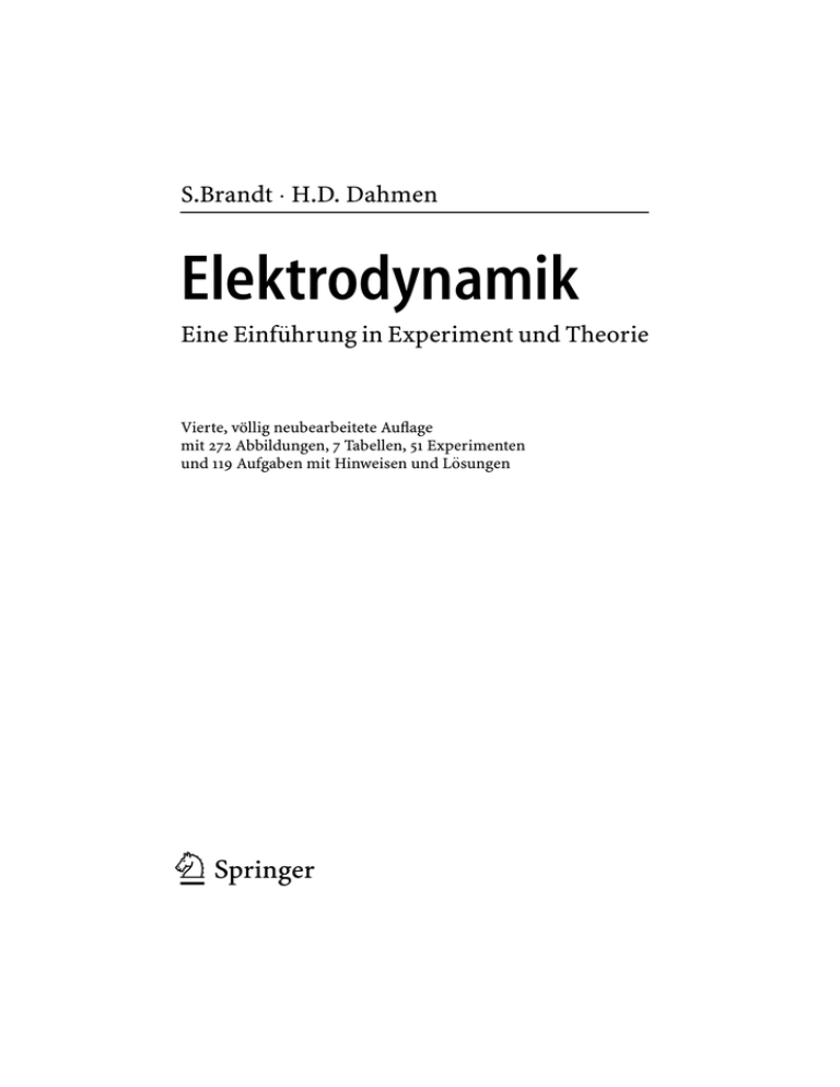 S.Brandt · H.D. Dahmen Elektrodynamik Eine Einführung in Experiment und Theorie Vierte, völlig neubearbeitete Auflage mit 272 Abbildungen, 7 Tabellen, 51 Experimenten und 119 Aufgaben mit Hinweisen und Lösungen 123 Inhaltsverzeichnis 1 Einleitung. Grundlagenexperimente. Coulombsches Gesetz . 1.1 Erste Experimente . . . . . . . . . . . . . . . . . . . . . 1.2 Das Coulombsche Gesetz . . . . . . . . . . . . . . . . . 1 1 4 2 Elektrostatik in Abwesenheit von Materie . . . . . . . . . . 2.1 Das elektrostatische Feld einer Punktladung . . . . . . . . 2.2 Das Feld einer beliebigen Ladungsverteilung. Ladungsdichte 2.3 ∗ Mikroskopische und gemittelte Ladungsdichte und Feldstärke . . . . . . . . . . . . . . . 2.4 Elektrischer Fluß . . . . . . . . . . . . . . . . . . . . . 2.5 Quellen elektrostatischer Felder . . . . . . . . . . . . . . 2.6 Wirbelfreiheit des elektrostatischen Feldes. Feldgleichungen 2.7 Das elektrostatische Potential. Spannung . . . . . . . . . 2.8 Graphische Veranschaulichung elektrostatischer Felder . . 2.9 Poisson-Gleichung. Laplace-Gleichung . . . . . . . . . . 2.10 Elektrischer Dipol . . . . . . . . . . . . . . . . . . . . . 2.10.1 ∗ Grenzfall verschwindenden Ladungsabstandes. Ladungsdichte des Dipols . . . . . . . . . . . . 2.10.2 Potentielle Energie eines Dipols im elektrostatischen Feld. Kraft und Drehmoment auf einen Dipol . . . . . . . . . . . . . . . . . . 2.11 Systeme mehrerer Punktladungen . . . . . . . . . . . . . 2.12 Aufgaben . . . . . . . . . . . . . . . . . . . . . . . . . 10 10 11 3 Elektrostatik in Anwesenheit von Leitern . . . . . . . . . . 3.1 Influenz auf großen, ebenen Platten . . . . . . . . . . . . 3.2 Plattenkondensator. Kapazität . . . . . . . . . . . . . . . 3.2.1 Kapazität . . . . . . . . . . . . . . . . . . . . . 3.2.2 Parallel- und Reihenschaltungen von Kondensatoren 3.2.3 Kraft zwischen den Kondensatorplatten . . . . . 3.2.4 Energiespeicherung im Plattenkondensator . . . . 48 49 51 51 53 54 56 15 17 20 22 22 25 27 29 32 38 40 44 VIII 3.3 3.4 3.5 3.6 3.7 Inhaltsverzeichnis Influenz einer Punktladung auf eine große, ebene Metallplatte. Spiegelladung . . . . . . . . . . . . . Influenz eines homogenen Feldes auf eine Metallkugel. Induziertes Dipolmoment . . . . . . . . . . . . . . . . . Flächenladungen als Ursache für Unstetigkeiten der Feldstärke . . . . . . . . . . . . . . . . . . . . . . . Anwendungen homogener elektrischer Felder . . . . . . . 3.6.1 Messung der Elementarladung im Millikan-Versuch 3.6.2 Beschleunigung von geladenen Teilchen . . . . . 3.6.3 Ablenkung geladener Teilchen. Elektronenstrahloszillograph . . . . . . . . . . . Aufgaben . . . . . . . . . . . . . . . . . . . . . . . . . 4 Elektrostatik in Materie . . . . . . . . . . . . . . . . . . 4.1 Einfachste Grundzüge der Struktur der Materie . . . . 4.2 Materie im homogenen elektrostatischen Feld. Permittivitätszahl. Elektrische Suszeptibilität. Elektrische Polarisation . . . . . . . . . . . . . . . . 4.3 Das Feld der elektrischen Flußdichte. Feldgleichungen in Materie . . . . . . . . . . . . . . . . . . . . . . . 4.4 Energiedichte des elektrostatischen Feldes . . . . . . 4.4.1 Energiedichte eines Feldes im Vakuum. Selbstenergie . . . . . . . . . . . . . . . . . 4.4.2 Energiedichte eines Feldes bei Anwesenheit von Materie . . . . . . . . . . . . . . . . . . 4.5 Unstetigkeiten der elektrischen Flußdichte. Brechungsgesetz für Feldlinien . . . . . . . . . . . . 4.6 ∗ Mikroskopische Begründung der Feldgleichungen des elektrostatischen Feldes in Materie . . . . . . . . 4.6.1 Mikroskopische und gemittelte Ladungsverteilungen. Feldgleichungen . . . . 4.6.2 Raum- und Oberflächenladungsdichten durch Polarisation . . . . . . . . . . . . . . 4.7 Ursachen der Polarisation . . . . . . . . . . . . . . . 4.7.1 Elektronische Polarisation . . . . . . . . . . 4.7.2 ∗ Clausius–Mossottische Formel . . . . . . . 4.7.3 Orientierungspolarisation . . . . . . . . . . . 4.8 Verschiedene dielektrische Erscheinungen . . . . . . 4.9 Aufgaben . . . . . . . . . . . . . . . . . . . . . . . 56 59 63 65 65 67 68 72 . . . . 75 75 . . 77 . . . . 81 83 . . 83 . . 86 . . 90 . . 92 . . 92 . . . . . . . . . . . . . . 97 99 99 101 104 105 107 Inhaltsverzeichnis 5 Elektrischer Strom als Ladungstransport . . . . . . . . 5.1 Elektrischer Strom. Stromdichte . . . . . . . . . . . . 5.2 Kontinuitätsgleichung . . . . . . . . . . . . . . . . . 5.3 ∗ Mikroskopische Formulierung der Stromdichte . . . 5.4 Strom in Substanzen höherer Dichte. Ohmsches Gesetz 5.4.1 Einfaches Modell des Ladungstransports. Leitfähigkeit . . . . . . . . . . . . . . . . . 5.4.2 Strom in ausgedehnten Leitern. Widerstand. Ohmsches Gesetz . . . . . . . . . . . . . . . 5.5 Leistung des elektrischen Feldes. Joulesche Verluste . 5.6 Stromkreis. Technische Stromrichtung . . . . . . . . 5.7 Netzwerke . . . . . . . . . . . . . . . . . . . . . . . 5.7.1 Kirchhoffsche Regeln. Reihen- und Parallelschaltung ohmscher Widerstände . . . . . . . . . . . . 5.7.2 Messung von Strom bzw. Spannung mit einem Meßgerät . . . . . . . . . . . . . 5.8 Ionenleitung in Flüssigkeiten. Elektrolyse . . . . . . . 5.9 Elektronenleitung in Metallen. Darstellung von Strom–Spannungs-Kennlinien auf dem Oszillographen 5.10 Ionen- und Elektronenleitung in ionisierten Gasen . . 5.11 Aufgaben . . . . . . . . . . . . . . . . . . . . . . . 6 Grundlagen des Ladungstransports in Festkörpern. Bändermodell . . . . . . . . . . . . . . . . . . . . . . . 6.1 Vielteilchensystem am absoluten Temperaturnullpunkt. Fermi-Grenzenergie . . . . . . . . . . . . . . . . . . 6.2 Vielteilchensystem bei höheren Temperaturen . . . . . 6.2.1 Fermi–Dirac-Funktion . . . . . . . . . . . . 6.2.2 Fermi–Dirac-Verteilung . . . . . . . . . . . 6.3 Das Bändermodell der Kristalle . . . . . . . . . . . . 6.4 Kristalle am absoluten Temperaturnullpunkt: Leiter und Nichtleiter . . . . . . . . . . . . . . . . . 6.5 Kristalle bei höherer Temperatur: Leiter, Halbleiter und Nichtleiter . . . . 