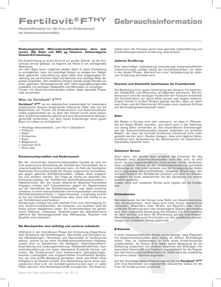 Fertilovit® FTHY Gebrauchsinformation Vitalstoffkomplex für die Frau mit Kinderwunsch bei Autoimmunthyreoiditis Präkonzeptionelle Mikronährstoffkombination ohne Jod‑ zusatz. Mit Selen und 800 μg Folsäure. Zeitverzögerte Vitamin­‑C-Freisetzung. selbst kann die Therapie durch eine gesunde Lebensführung und krankheitsangemessene Ernährung unterstützen. Die Entscheidung zu einem Kind ist ein großer Schritt. Ist der Entschluss einmal gefasst, so beginnt die Reise in ein aufregendes Abenteuer. Um dem Baby einen möglichst idealen Start in seine Entwicklung zu ermöglichen, kann die zukünftige Mutter so einiges tun. Neben einer gesunden Lebensführung spielt dabei eine ausgewogene Ernährung mit viel frischem Obst und Gemüse eine wichtige Rolle. Experten empfehlen, den weiblichen Körper bereits einige Monate vor einer geplanten Schwangerschaft über Nahrungsergänzungsmittel zusätzlich mit wichtigen Vitalstoffen und Mineralien zu versorgen. Frauen mit Autoimmunthyreoiditis sollten dabei spezielle Präparate verwenden. Jodarme Ernährung Was ist Fertilovit® FTHY? Fertilovit® FTHY ist ein diätetisches Lebensmittel für besondere medizinische Zwecke (ergänzende bilanzierte Diät), das auf die Bedürfnisse von Frauen mit Kinderwunsch und Autoimmunthyreoiditis zugeschnitten ist. Es kann den Körper durch seine besondere Zusammensetzung optimal auf eine bevorstehende Schwangerschaft vorbereiten, um dem neuen Erdenbürger einen guten Start ins Leben zu ermöglichen! 99Wichtige Antioxidantien, zum Teil in Depotform 9 9Folsäure 9 9Selen 9 9B-Vitamine 9 9Eisen 9 9Magnesium 9 9Coenzym Q10 9 9Ohne Jod Autoimmunthyreoiditis und Kinderwunsch Bei der chronischen Autoimmunthyreoiditis handelt es sich um eine autoimmune Erkrankung der Schilddrüse (Thyreoidea), die in unterschiedlichen Formen auftreten kann. Im Falle der häufigeren Hashimoto-Thyreoiditis bildet der Körper sogenannte Autoantikörper gegen gesunde Schilddrüsenzellen, sodass diese angegriffen und zerstört werden. Die Folge ist häufig ein Absinken der Hormonproduktion der Schilddrüse (Schilddrüsenunterfunktion = Hypothyreose). Bei der etwas selteneren Basedow-Thyreoiditis hingegen richten sich Autoantikörper gegen ein Signalmolekül auf der Oberfläche der Schilddrüsenzellen, was diese zunächst meistens zu einer überschießenden Hormonproduktion veranlasst (Schilddrüsenüberfunktion = Hyperthyreose). Langfristig kommt es bei den betroffenen Patientinnen aber auch hier häufig zu einer Schilddrüsenunterfunktion. Schätzungen zufolge hat jede sechste Frau eine Veranlagung für eine Autoimmunthyreoiditis, die Ursachen und Auslöser sind bis heute jedoch weitgehend unklar. Ein Zusammenhang mit genetischen Faktoren, Jodexzess, Veränderungen der Sexualhormone während der Schwangerschaft bzw. Menopause, Rauchen und Strahlen wird diskutiert. Die Beschwerden sind vielfältig und variieren individuell. Während in der überaktiven Phase der Erkrankung (Hyperthyreose) Symptome wie Schlaflosigkeit, Nervosität und Zittrigkeit sowie Hitzewallungen, Herzrasen und Haarausfall im Vordergrund stehen, kommt es bei einer Schilddrüsenunterfunktion (Hypothyreose) eher zu Symptomen wie Müdigkeit, Gewichtszunahme, Erschöpfung und Leistungsminderung. Kälteempfindlichkeit, Konzentrationsstörung und sogar depressive Zustände können auftreten. Bei Kinderwunsch sind insbesondere Zyklusstörungen, sexuelle Lustlosigkeit und eingeschränkte Fruchtbarkeit Symptome, die eine große Belastung darstellen. Auch das Risiko einer Fehlgeburt ist deutlich erhöht. Eine Behandlung durch einen spezialisierten Arzt (z.B. mit Schilddrüsenhormonen) kann in vielen Fällen dennoch eine Schwangerschaft ermöglichen. Die Patientin Stand der Gebrauchsinformation: Juli 2013 Eine übermäßige Jodbelastung beschleunigt wissenschaftlichen Untersuchungen zufolge häufig den Krankheitsverlauf, vor allem in der akuten Phase, während von einer Verbesserung bei iodarmer Ernährung berichtet wird. Vitamine und Vitalstoffe beeinflussen die Fruchtbarkeit Die Bedeutung einer guten Versorgung des Körpers mit bestimmten Vitalstoffen und Mineralien ist allgemein anerkannt. Bei Kinderwunsch sind die wichtigen Funktionen der Folsäure einschließlich Schutzfunktion vor Spina bifida bereits seit langem bekannt. Zudem konnte in großen Studien gezeigt werden, dass vor allem auch Eisen und die Vitamine der B-Gruppe einen positiven Einfluss auf die Empfängnisbereitschaft haben. Selen Die Böden in Europa sind sehr selenarm, so dass in Pflanzen, die auf diesen Böden wachsen, und damit auch in der Nahrung, nur wenig Selen vorhanden ist. Bei entzündlichen Erkrankungen wie der Autoimmunthyreoiditis besteht außerdem ein erhöhter Bedarf, der über die normale Ernährung manchmal nicht mehr gedeckt werden kann. Studien belegen, dass eine tägliche Seleneinnahme eine Verbesserung der Beschwerden bei Autoimmunthyreoiditis bewirken kann. Oxidativer Stress Auch wenn, wie bereits oben erwähnt, die Ursachen für das Auftreten einer Autoimmunthyreoiditis nicht klar sind, so wird durch neuere wissenschaftliche Erkenntnisse immer deutlicher, dass oxidativer Stress an der Krankheitsentstehung zumindest mitbeteiligt ist. Hierunter versteht man die Schädigung von Zellen durch aggressive Sauerstoffradikale. Oxidativer Stress kann den Immunprozess in der Schilddrüse anheizen und wird von Wissenschaftlern für einen wesentlichen Teil der Symptome mit verantwortlich gemacht. Zudem wirkt sich oxidativer Stress auch negativ auf die Eizellen aus. Antioxidantien Normalerweise hat der Körper eine Reihe von Abwehrmechanismen (Antioxidantien), doch diese sind nicht immer ausreichend vorhanden. Besonders unter Stress, bei Rauchern oder durch schlechte Ernährung kann das körpereigene System geschwächt sein. Eine zusätzliche Versorgung des Körpers mit Antioxidantien ist dann sinnvoll und kann die Erkrankung günstig beeinflussen. Gleichzeitig werden auch Ihre Eizellen vor den schädlich