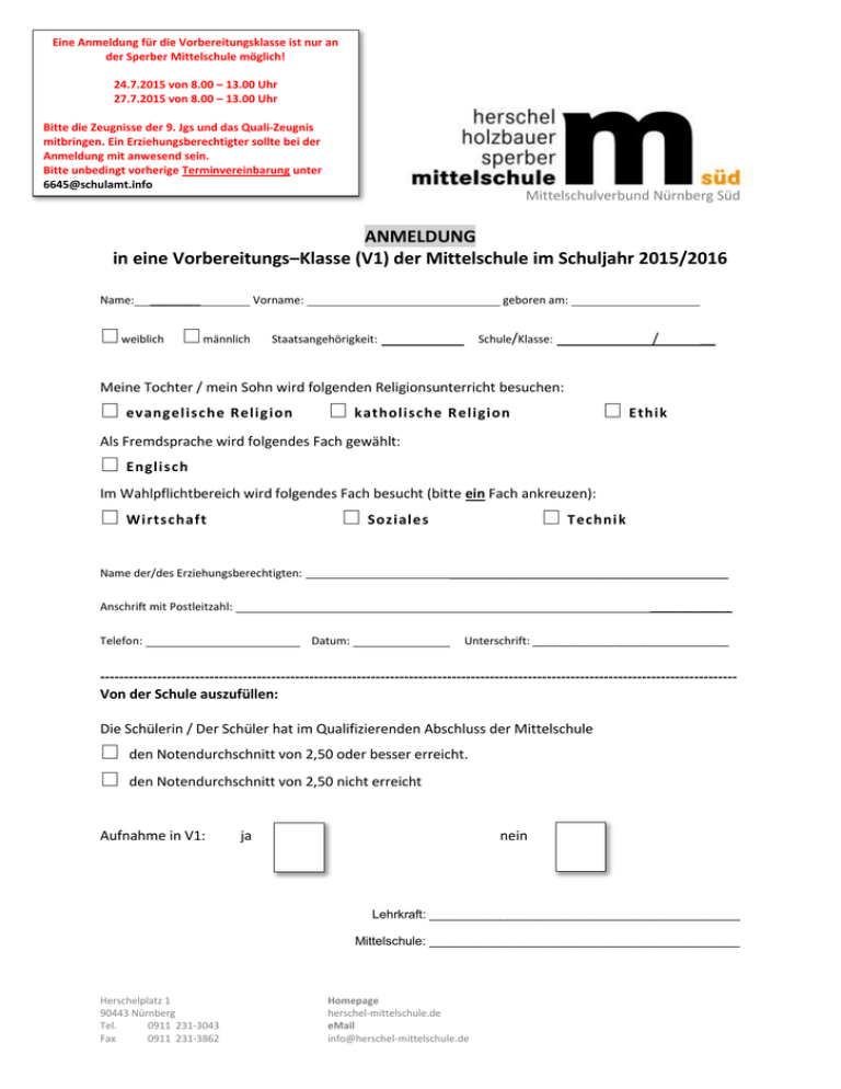 Eine Anmeldung für die Vorbereitungsklasse ist nur an der Sperber Mittelschule möglich! 24.7.2015 von 8.00 – 13.00 Uhr 27.7.2015 von 8.00 – 13.00 Uhr Bitte die Zeugnisse der 9. Jgs und das Quali-Zeugnis mitbringen. Ein Erziehungsberechtigter sollte bei der Anmeldung mit anwesend sein. Bitte unbedingt vorherige Terminvereinbarung unter 6645@schulamt.info Mittelschulverbund Nürnberg Süd ANMELDUNG in eine Vorbereitungs–Klasse (V1) der Mittelschule im Schuljahr 2015/2016 Name: ________ Vorname: weiblich männlich geboren am: Schule/Klasse: Staatsangehörigkeit: / __ Meine Tochter / mein Sohn wird folgenden Religionsunterricht besuchen: evangelische Relig ion katholische Religion Ethik Als Fremdsprache wird folgendes Fach gewählt: Englisch Im Wahlpflichtbereich wird folgendes Fach besucht (bitte ein Fach ankreuzen): Wirtschaft Soziales Name der/des Erziehungsberechtigten: Techni k ____________________________________________ Anschrift mit Postleitzahl: _____________ Telefon: Datum: Unterschrift: _______________________________ -------------------------------------------------------------------------------------------------------------------------------------Von der Schule auszufüllen: Die Schülerin / Der Schüler hat im Qualifizierenden Abschluss der Mittelschule den Notendurchschnitt von 2,50 oder besser erreicht. den Notendurchschnitt von 2,50 nicht erreicht Aufnahme in V1: ja nein Lehrkraft: ____________________________________________ Mittelschule: ____________________________________________ Herschelplatz 1 90443 Nürnberg Tel. 0911 231-3043 Fax 0911 231-3862 Homepage herschel-mittelschule.de eMail info@herschel-mittelschule.de