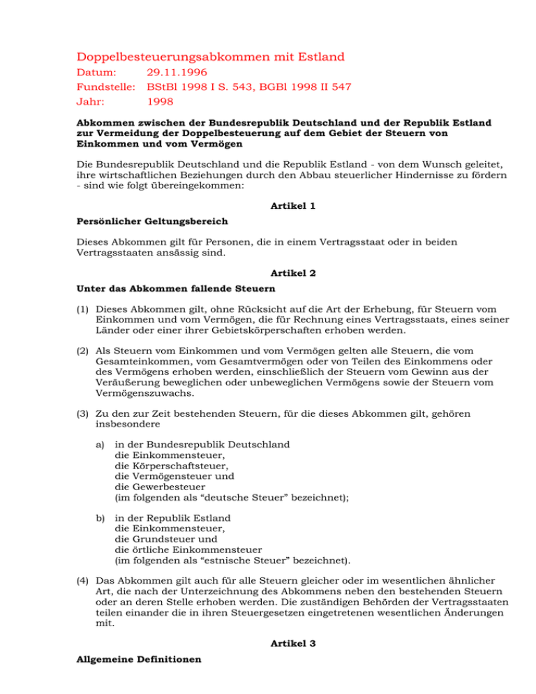 Doppelbesteuerungsabkommen mit Estland Datum: Fundstelle: Jahr: 29.11.1996 BStBl 1998 I S. 543, BGBl 1998 II 547 1998 Abkommen zwischen der Bundesrepublik Deutschland und der Republik Estland zur Vermeidung der Doppelbesteuerung auf dem Gebiet der Steuern von Einkommen und vom Vermögen Die Bundesrepublik Deutschland und die Republik Estland - von dem Wunsch geleitet, ihre wirtschaftlichen Beziehungen durch den Abbau steuerlicher Hindernisse zu fördern - sind wie folgt übereingekommen: Artikel 1 Persönlicher Geltungsbereich Dieses Abkommen gilt für Personen, die in einem Vertragsstaat oder in beiden Vertragsstaaten ansässig sind. Artikel 2 Unter das Abkommen fallende Steuern (1) Dieses Abkommen gilt, ohne Rücksicht auf die Art der Erhebung, für Steuern vom Einkommen und vom Vermögen, die für Rechnung eines Vertragsstaats, eines seiner Länder oder einer ihrer Gebietskörperschaften erhoben werden. (2) Als Steuern vom Einkommen und vom Vermögen gelten alle Steuern, die vom Gesamteinkommen, vom Gesamtvermögen oder von Teilen des Einkommens oder des Vermögens erhoben werden, einschließlich der Steuern vom Gewinn aus der Veräußerung beweglichen oder unbeweglichen Vermögens sowie der Steuern vom Vermögenszuwachs. (3) Zu den zur Zeit bestehenden Steuern, für die dieses Abkommen gilt, gehören insbesondere a) in der Bundesrepublik Deutschland die Einkommensteuer, die Körperschaftsteuer, die Vermögensteuer und die Gewerbesteuer (im folgenden als “deutsche Steuer” bezeichnet); b) in der Republik Estland die Einkommensteuer, die Grundsteuer und die örtliche Einkommensteuer (im folgenden als “estnische Steuer” bezeichnet). (4) Das Abkommen gilt auch für alle Steuern gleicher oder im wesentlichen ähnlicher Art, die nach der Unterzeichnung des Abkommens neben den bestehenden Steuern oder an deren Stelle erhoben werden. Die zuständigen Behörden der Vertragsstaaten teilen einander die in ihren Steuergesetzen eingetretenen wesentlichen Änderungen mit. Artikel 3 Allgemeine Definitionen (1) Im Sinne dieses Abkommens, wenn der Zusammenhang nichts anderes erfordert, a) bedeutet der Ausdruck “Bundesrepublik Deutschland” das Gebiet, in dem das Steuerrecht der Bundesrepublik Deutschland gilt, einschließlich des Meeresgrunds, des Meeresuntergrunds und der darüberliegenden, an das Küstenmeer angrenzenden Wassersäule, soweit die Bundesrepublik Deutschland dort in Übereinstimmung mit dem Völkerrecht und ihrem innerstaatlichen Recht souveräne Rechte und Hoheitsbefugnisse ausübt; b) bedeutet der Ausdruck “Republik Estland” die Republik Estland und, im geographischen Sinne verwendet, das Hoheitsgebiet der Republik Estland sowie die an die Hoheitsgewässer der Republik Estland angrenzenden Gebiete, in denen die Republik Estland in Übereinstimmung mit ihren innerstaatlichen Rechtsvorschriften und dem Völkerrecht ihre Rechte hinsichtlich des Meeresbodens, des Meeresuntergrunds und der natürlichen Ressourcen ausüben kann; c) bedeuten die Ausdrücke “ein Vertragsstaat” und “der andere Vertragsstaat” je nach dem Zusammenhang die Bundesrepublik Deutschland oder die Republik Estland; d) bedeutet der Ausdruck “Person” natürliche Personen, Gesellschaften und alle anderen Personenvereinigungen; e) bedeutet der Ausdruck “Gesellschaft” juristische Personen oder Rechtsträger, die für die Besteuerung wie juristische Personen behandelt werden; f) bedeuten die Ausdrücke “Unternehmen eines Vertragsstaats” und “Unternehmen des anderen Vertragsstaats”, je nachdem, ein Unternehmen, das von einer in einem Vertragsstaat ansässigen Person betrieben wird, oder ein Unternehmen, das von einer im anderen Vertragsstaat ansässigen Person betrieben wird; g) bedeutet der Ausdruck “Staatsangehöriger” aa) in bezug auf die Bundesrepublik Deutschland alle Deutschen im Sinne des Artikels 116 Absatz 1 des Grundgesetzes für die Bundesrepublik Deutschland sowie alle juristischen Personen, Personengesellschaften und anderen Personenvereinigungen, die nach dem in der Bundesrepublik Deutschland geltenden Recht errichtet worden sind; bb) in bezug auf die Republik Estland alle natürlichen Personen, die die Staatsangehörigkeit der Republik Estland besitzen und alle juristischen Personen, Personengesellschaften und anderen Personenvereinigungen, die nach dem in der Republik Estland geltenden Recht errichtet worden sind; h) bedeutet der Ausdruck “internationaler Verkehr” jede Beförderung mit einem Seeschiff oder Luftfahrzeug, das von einem Unternehmen eines Vertragsstaats betrieben wird, es sei denn, das Seeschiff oder Luftfahrzeug wird ausschließlich zwischen Orten im andren Vertragsstaat betrieben; i) bedeutet der Ausdruck “zuständige Behörde” in der Bundesrepublik Deutschland das Bundesministerium der Finanzen und in der Republik Estland der Finanzminister oder sein bevollmächtigter Vertreter. (2) Bei der Anwendung des Abkommens durch einen Vertragsstaat hat, wenn der Zusammenhang nichts anderes erfordert, jeder im Abkommen nicht definierte Ausdruck die Bedeutung, die ihm nach dem Recht dieses Staates über die Steuern zukommt, für die das Abkommen gilt. Artikel 4 Ansässige Person (1) Im Sinne dieses Abkommens bedeutet der Ausdruck “eine in einem Vertragsstaat ansässige Person” ein Person, die nach dem Recht dieses Staates dort aufgrund ihres Wohnsitzes, ihres ständigen Aufenthalts, des Ortes der Geschäftsleitung, des Ortes ihrer Registrierung oder aufgrund eines anderen ähnlichen Merkmals steuerpflichtig ist. Der Ausdruck umfaßt auch die Regierung dieses Staates, eines seiner Länder und eine ihrer Gebietskörperschaften. Der Ausdruck umfaßt jedoch nicht eine Person, die in diesem Staat nur mit Einkünften aus Quellen in diesem Staat oder mit in diesem Staat gelegenem Vermögen steuerpflichtig ist. (2) Ist nach vorstehendem Absatz 1 eine natürliche Person in beiden Vertragsstaaten ansässig, so gilt folgendes: a) Die Person gilt als in dem Staa