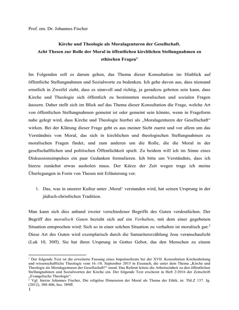 Prof. em. Dr. Johannes Fischer Kirche und Theologie als Moralagenturen der Gesellschaft. Acht Thesen zur Rolle der Moral in öffentlichen kirchlichen Stellungnahmen zu ethischen Fragen1 Im Folgenden soll es darum gehen, das Thema dieser Konsultation im Hinblick auf öffentliche Stellungnahmen und Sozialworte zu bedenken. Ich gehe davon aus, dass niemand ernstlich in Zweifel zieht, dass es sinnvoll und richtig, ja geradezu geboten sein kann, dass Kirche und Theologie sich öffentlich zu bestimmten moralischen und sozialen Fragen äussern. Daher stellt sich im Blick auf das Thema dieser Konsultation die Frage, welche Art von öffentlichen Stellungnahmen gemeint ist oder gemeint sein könnte, wenn in Frageform nahe gelegt wird, dass Kirche und Theologie hierbei als „Moralagenturen der Gesellschaft“ wirken. Bei der Klärung dieser Frage geht es aus meiner Sicht zuerst und vor allem um das Verständnis von Moral, das sich in kirchlichen und theologischen Stellungnahmen zu moralischen Fragen findet, und zum anderen um die Rolle, die die Moral in der gesellschaftlichen und politischen Öffentlichkeit spielt. Zu beidem will ich im Sinne eines Diskussionsimpulses ein paar Gedanken formulieren. Ich bitte um Verständnis, dass ich hierzu zunächst etwas ausholen muss. Der Kürze der Zeit wegen trage ich meine Überlegungen in Form von Thesen mit Erläuterung vor. 1. Das, was in unserer Kultur unter ‚Moral‘ verstanden wird, hat seinen Ursprung in der jüdisch-christlichen Tradition. Man kann sich dies anhand zweier verschiedener Begriffe des Guten verdeutlichen. Der Begriff des moralisch Guten bezieht sich auf ein Verhalten, mit dem einer gegebenen Situation entsprochen wird: Sich so in einer solchen Situation zu verhalten ist moralisch gut.2 Diese Art des Guten wird exemplarisch durch die Samaritererzählung Jesu veranschaulicht (Luk 10, 30ff). Sie hat ihren Ursprung in Gottes Gebot, das den Menschen zu einem 1 Der folgende Text ist die erweiterte Fassung eines Impulsreferats bei der XVII. Konsultation Kirchenleitung und wissenschaftliche Theologie vom 16.-18. September 2015 in Eisenach, die unter dem Thema „Kirche und Theologie als Moralagenturen der Gesellschaft?“ stand. Das Referat leitete die Arbeitseinheit zu den öffentlichen Stellungnahmen und Sozialworten der Kirche ein. Der folgende Text erscheint in Heft 2/2016 der Zeitschrift „Evangelische Theologie“. 2 Vgl. hierzu Johannes Fischer, Die religiöse Dimension der Moral als Thema der Ethik, in: ThLZ 137. Jg. (2012), 388-406, bes. 389ff. 1 entsprechenden Verhalten anleitet. Demgegenüber bezieht sich in der antiken Ethik der Begriff des Guten auf das gute Leben, und damit ist etwas anderes gemeint als ein moralisch gutes Leben. Für Aristoteles ist das gute Leben ein Leben, das die Bestimmung des Menschen verwirklicht, die Vernunft zu ihrer grösstmöglichen Entfaltung zu bringen in Gestalt der dianoetischen und ethischen Tugenden. Wenn man die Tugenden ‚gut‘ nennt, dann sind sie dies nicht in einem moralischen Sinne, sondern vielmehr in dem Sinne, dass sich in ihnen die Bestimmung des Menschen realisiert. Aristoteles hat unseren Begriff der Moral nicht gekannt. 2. Vom jüdisch-christlichen Ursprung der Moral her fällt Licht auf eine Ambivalenz und Zweideutigkeit, die der Moral in der Moderne und darüber hinaus bis in die Gegenwart anhaftet und von der – wie noch zu erläutern sein wird – auch kirchliche und theologische Stellungnahmen zu moralischen Fragen häufig nicht frei sind. Geht man zurück auf den jüdisch-christlichen Ursprung der Moral, dann betrifft diese Zweideutigkeit das Verständnis von Gottes Gebot. Genauer gesagt geht es um den Grund und das Motiv der Gebotsbefolgung: Sind die Gebote Gottes deshalb zu befolgen, weil sie von Gott geboten sind? Oder sind sie um des willen zu befolgen, weshalb sie von Gott geboten sind, so um des Hungrigen willen, auf dass er satt wird, oder um des Fremden willen, auf dass er eine Bleibe hat? Im ersten Fall liegen Grund und Motiv des Handelns in dessen Gebotenheit durch Gott, und es gibt nur einen einzigen Grund und ein einziges Motiv für alles gebotene Handeln, nämlich seine Gebotenheit durch Gott. Im zweiten Fall ist es die Situation des Bedürftigen, in der Grund und Motiv des Handelns liegen, und es gibt so viele Gründe und Motive, wie es Situationen von Bedürftigkeit gibt (vgl. Matth 25, 35f). Der Sinn der Gebote liegt dann darin, den Blick für die Situation des Bedürftigen zu schärfen. Ersichtlich ist das Gebot der Nächstenliebe von dieser zweiten Art. Um die Alternative auf eine griffige Art zu bezeichnen, unterscheide ich daher zwischen einer Gesetzesmoral auf der einen Seite und einer Moral der Liebe auf der anderen Seite. Hinter dieser Alternative stehen zwei verschiedene Gottesbilder: einerseits ein Gott, der vom Menschen unbedingten Gehorsam in Bezug auf die Einhaltung seiner Gebote verlangt; andererseits ein Gott, der seine Gebote zum Wohl seiner Kreaturen erlässt und mit ihnen den Menschen für dieses Wohl in seinen Dienst nimmt. Diese Ambivalenz und Zweideutigkeit zwischen Gesetz und Liebe haftet auch der säkularen Moral an. Um dies an einem aktuellen Beispiel zu verdeutlichen: Soll denen, die derzeit 2 aufgrund politischer Verfolgung in Deutschland Asyl suchen, deshalb geholfen werden, weil dies moralisch geboten ist? Oder soll ihnen um des willen geholfen werden, weshalb dies moralisch geboten ist, nämlich um der verzweifelten Situation und Notlage willen, in der sich viele von ihnen befinden? Im ersten Fall liegen der Grund und das Motiv für ein entsprechendes Handeln in dem Urteil ‚Es ist moralisch geboten, politisch Verfolgten zu helfen‘. Im zweiten Fall liegen Grund und Motiv in der Angewiesenheit dieser Menschen auf Hilfe. 3. Die Moderne ist bis in die Gegenwart durch ein Verständnis von Moral im Sinne der Gesetzesmoral geprägt. Die Moral wird dabei zu einer autoritativ-verpflichtenden Letztinstanz, gewissermassen als das säkul