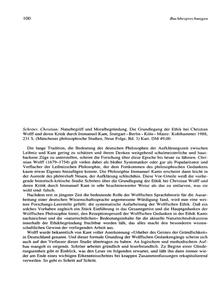 100 Buchbesprechungen Schwer, Christian: Naturbegriff und Moralbegründung. Die Grundlegung der Ethik bei Christian Wolff und deren Kritik durch Immanuel Kant, Stuttgart-Berlin-Köln-Mainz: Kohlhammer 1988, 231 S. (Münchener philosophische Studien, Neue Folge, Bd. 3) Kart. DM 49,00. Die lange Tradition, die Bedeutung der deutschen Philosophen der Aufklärungszeit zwischen Leibniz und Kant gering zu schätzen und ihrem Denken weitgehend schulmeisterliche und haus­ backene Züge zu unterstellen, scheint die Forschung über diese Epoche bis heute zu lähmen. Chri­ stian Wolff (1679-1754) gilt vielen dabei als bloßer Systematiker oder gar als Popularisator und Verflacher der Leibnizschen Philosophie, der dem Fortkommen des philosophischen Gedankens kaum etwas Eigenes hinzufügen konnte. Die Philosophie Immanuel Kants erscheint dann leicht in der Aureole des phönixhaft Neuen, der Aufklärung schlechthin. Diese Vor-Urteile weiß die vorlie­ gende historisch-kritische Studie Schröers über die Grundlegung der Ethik bei Christian Wolff und deren Kritik durch Immanuel Kant in sehr beachtenswerter Weise als das zu entlarven, was sie wohl sind: falsch. Nachdem erst in jüngster Zeit die bedeutende Rolle der Wolffschen Sprachtheorie für die Ausar­ beitung einer deutschen Wissenschaftssprache angemessene Würdigung fand, wird nun eine wei­ tere Forschungs-Leerstelle gefüllt: die systematische Aufarbeitung der Wolffschen Ethik. Daß ein solches Vorhaben zugleich ein Stück Einführung in das Gesamtgerüst und die Hauptgedanken der Wolffschen Philosophie bietet, den Rezeptionsprozeß der Wolffschen Gedanken in der Ethik Kants nachzeichnet und die »naturrechtlichen« Bedeutungsinhalte für die aktuelle Naturrechtsdiskussion innerhalb der Ethikbegründung fruchtbar werden läßt, das alles macht den besonderen wissen­ schaftlichen Gewinn der vorliegenden Arbeit aus. Wolff wurde bekanntlich von Kant voller Anerkennung »Urheber des Geistes der Gründlichkeit« in Deutschland genannt. Und dieser formale Grundzug der Wolffschen Gedankengänge scheint sich auch auf den Verfasser dieser Studie übertragen zu haben. An logischem und methodischem Auf­ bau mangelt es nirgends. Schröer arbeitet gründlich und leserfreundlich. Zu Beginn einer Gliede­ rungseinheit gibt er Einblick, was den Leser im folgenden erwartet, und läßt ihn dann immer wie­ der am Ende eines wichtigen Erkenntnisschrittes bei knappen Zusammenfassungen rekapitulierend verweilen. So geht es Schritt auf Schritt. Buchbesprechungen 101 Nach einer instruktiven Einführung in die Problemstellung der Arbeit, in die Motivation des Autors, die zur Beschäftigung mit Wolffs Ethik geführt hat, und in den Stand der Wolff-Forschung (11—18) erläutert der Vf. im ersten Kapitel als wichtige Voraussetzungen für die Interpretation die methodische Vorgehens weise Wolffs und die tragenden Schlüsselbegriffe, auf denen sein ethischer Ansatz aufruht (19-28). Ausgehend von der in Modifikationen immer wieder neu vorgelegten Frage, welche Rolle die Verwendung des Ausdrucks »Natur« in der ethischen Argumentation spielt, beginnt nun die eigentliche Wolff-Interpretation. Da der Begriff »Natur« und mit ihm die für sein richtiges Verständnis maßgeblichen Begriffe »Zusammenstimmen«, »Wesen« und vor allem »Vollkommenheit« zentrale Begriffe der Wölfi­ schen Philosophie überhaupt darstellen, werden sie als erster Interpretationsschritt in ihren logi­ schen und metaphysischen Sinnkontexten in einem eigenen Kapitel (II) ausführlich vorgestellt (31-99). Diese Ausführlichkeit der Begriffsklärung und -analyse erweckt zuweilen den Eindruck des Spröden, sie erweist sich jedoch für das dritte Kapitel, das über die spezifische Verwendung des Naturbegriffs in der Wölfischen Ethik handelt, als unentbehrlich (100-176). Der Vf. kann hier nämlich überzeugend aufweisen, daß der Schlüssel zum eigentlichen Verständnis dieses ethischen Ansatzes im Begriff der Vollkommenheit selbst zu finden ist. Der Begriff der Vollkommenheit als eine »Zusammenstimmung des Mannigfaltigen« wird in der Wolffschen Formulierung des »Gesetzes der Natur« zum entscheidenden Moralkriterium: »Tue, was dich und deinen Zustand vollkommener macht; unterlaß, was ihn unvollkommener macht« (100). Anhand dieser allgemei­ nen Regel zeichnet der Vf. die Wölfische materiale Ethik als Pflichtenlehre nach (100-141). Er kann im Wolffschen »Gesetz der Natur« als Grund der Verpflichtung ein weder »empirisch er­ kanntes« noch ein »bloß theologisches Prinzip«, sondern ein »genuin rationales Prinzip« aufdekken, das die Vernunft als ihr eigenes oberstes Gesetz erkennt (142-157), und kann zugleich die Grenzen einer so verstandenen allgemeinen Regel für die Bestimmung der zentralen Begriffe der klassischen Ethik wie »das höchste Gut«, »Glückseligkeit« oder »Tugend« in der von Wolff zu breit angelegten Anwendung des Begriffs der Vollkommenheit aufzeigen (158-173). Das dritte Kapitel schließt mit einem »Rückblick« (173-176), der es in sich hat. Der Vf. bietet hier eine sy­ stematisierte Zusammenschau aller bisher gewonnenen Ergebnisse. Ein Kompliment gedanklicher Präzision. Wer sich als Leser die Mühe begrifflicher Auseinandersetzung sparen wollte, kommt hier auch ohne sie in den Genuß der Erkenntnis. Im vierten Kapitel zieht der Vf. nun »Kant als kritischen Gesprächspartner« zur näheren Prüfung der Wolffschen Moralbegründung hinzu (177-212). Wolffs Position soll auch von dieser Seite auf der Basis entsprechender Textgrundlagen aus der »Grundlegung zur Metaphysik der Sitten« und aus der »Kritik der praktischen Vernunft« auf ihre Stärken und auf ihre Schwächen hin untersucht werden. Mit dieser strengen methodischen Eingrenzung gelingt es dem Vf., diese ergänzende KantStudie in den Dienst der Gesamtaussage seiner Arbeit zu stellen. Indem Schröer in diesem Kapitel die sachliche Kontinuität, aber auch Diskontinuität der Kantischen zur Wolffsche