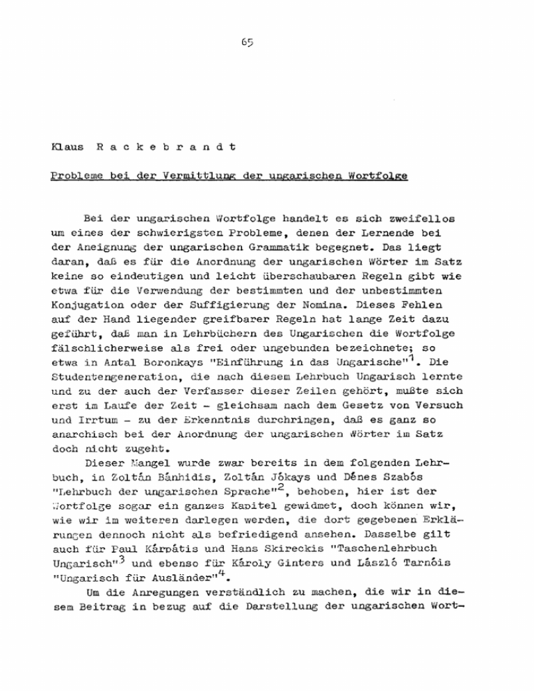 65 Klaus R a c k e b r a n d t Probleme bel der Vermittlung der ungarischen Wortfolge Bei der ungarischen Wortfolge handelt es sich zweifellos um eines der schwierigsten Probleme, denen der Lernende bei der Aneignung der ungarischen Grammatik begegnet. Das liegt daran, daß es für die Anordnung der ungarischen Wörter im Satz keine so eindeutigen und leicht überschaubaren Segeln gibt wie etwa für die Verwendung der bestimmten und der unbestimmten Konjugation oder der Suffigierung der Nomina. Dieses Pehlen auf der Hand liegender greifbarer Regeln hat lange Zeit dazu geführt, daß man in Lehrbüchern des Ungarischen die Wortfolge fälschlicherweise als frei oder ungebunden bezeichnete; so A etwa in Antal Boronkays "Einführung in das Ungarische" . Die Studentengeneration, die nach diesem Lehrbuch Ungarisch lernte und zu der auch der Verfasser dieser Zeilen gehört, mußte sich erst im Laufe der Zeit - gleichsam nach dem Gesetz von Versuch und Irrtum - zu der Erkenntnis durchringen, dadi es ganz so anarchisch bei der Anordnung der ungarischen Wörter im Satz doch nicht zugeht. Dieser Mangel wurde zwar bereits in dem folgenden Lehrbuch, in Zoltán Bánhidis, Zoltán Jókays und Dénes Szabós p "Lehrbuch der ungarischen Sprache" , behoben, hier ist der Jortfolge sogar ein ganzes Kapitel gewidmet, doch können wir, wie wir im weiteren darlegen Vierden, die dort gegebenen Erklärungen dennoch nicht als befriedigend ansehen. Dasselbe gilt auch für Faul Kárpátis und Hans Skireckis "Taschenlehrbuch Ungarisch"^ und ebenso für 4 Károly Ginters und László Tarnóis "Ungarisch für Ausländer" . Um die Anregungen verständlich zu machen, die wir in diesem Beitrag in bezug auf die Darstellung der ungarischen Wort- GG folge vermitteln wollen, ist es erforderlich, hier zunächst einmal kurz darzustellen, was der Student heute auf Grund der vorliegenden Lehrmaterialien über die ungarische Wortfolge erfährt. Die drei letztgenannten Lehrbücher stimmen in dieser Hinsicht weitgehend miteinander überein, eventuelle Unterschiede sind durch den verschiedenen Grad der Ausführlichkeit der Beschreioung bedingt,. Zunächst einmal giût es eine Anzahl Regeln für die Stellung der sog,. Formwörter oder Synsemantika, die aber keinerlei Problem darstellen. Der Artikel steht stets vor dem Substantiv, auf das er sich bezieht, sowie vor eventuellen Erweiterungen desselben. Die Postpositionen, der Name sagt es Dereits, sind dem Bezugswort - von wenigen Spezialfällen abgesehen - immer nachgestellt. Die Konjunktionen stehen in der Regel vor dem Satzteil oder Satz, den sie jcoppeln, nur zwei oder drei von ihnen haben Zweitstellung im angeknüpften Satz. Das Personalpronomen geht, soweit es uDerhaupt gebraucht wird, dem konjugierten Verb voran, und das Demonstrativpronomen steht vor seinem in der Regel mit bestimmtem Artikel versehenen Bezugswort, mit dem es in der Art einer Apposition kongruiert. Um auf die Autosemantika zu kommen so können wir, ohne uns in tiefere Prooleme zu verstricken, noch soviel sagen, daß das Attrißut ohne äußere Kongruenzmittel seinem Bezugswort stets vorangeht. Was aber die Stellung der üorigen Glieder des ungarischen Satzes zueinander betrifft, lassen sich weitere formelle Regeln nicht mehr aufstellen. uie genannten Lehroücher - wir geben ihre Auffassungen aus Gründen der geootenen Knappheit hier in einer eigenen Zusammenfassung wieder - sagen dazu folgendes: Die Hauptregel für die ungarische Wortfolge besteht darin, daß der Teil des Satzes, der die stärkste Betonung trägt, stets unmittelbar vor dem konjugierten Teil des Prädikats steht. Dieses kann ein Vollverb, ein Hilfsverb oder im Palle des nominalen Prädikats in der 3« Person auch die Nullkopula sein. Ist das Prädikat selbst der meistbetonte Satzteil, so ist die Wortfolge frei, die Stellung des konjugierten Verbs im Satz also C7 Deliebig. (Als betont gilt das Prädikat auch stets dann, wenn im Satz Icein anderes Wort besonders hervorgehoben wird.) Beispiele: A diiüc a könyvtárban levelet ír. Levelet ír a diák a könyvtároan. Tr a^diák a könyvtárban levelet. A diák levelet ir a könyvtárban. Soll dagegen ein anderer Satzteil als das Prädikat besonders hervorgehoben werden, so muß ír ihm unmittelbar folgen. Bei Betonung des Subjekts: A diák ír levelet a Könyvtárban. A könyvtárban a diák ír levelet. levelet a könyvtárban a diák ír. Bei Hervorhebung des Objekts: Levelet ír a diák a könyvtárDan. A könyvtárban levelet ír a diák:. A diáK levelet ír a könyvtároan. Schließlich bei Betonung der adveroialen Bestimmung des Ortes: A könyvtároan ír a diaK levelet. A diák a Könyvtároan ír levelet. A könyvtároan ír levelet a diáK. Hier zeigt sich oereits, daß alle diese Formen bis auf eine, nämlich: ír a diák a könyvtároan levelet. zweideutig sind. Sie Können der Hervorhebung des jeweils vor ír stehenden Wortes dienen, daneben aber auch Desagen, daß nichts im Satz besonders hervorgehoDen ist bzw. daß das Prädiicat selDst die Betonung trägt. Hier muß die Satzintonation Aufschluß üoer die tatsächlichen Verhältnisse geben. Stets als betont gelten im ungarischen Satz die Interrogativpronomina und die VerneinungspartiKeln nem und sem. Sie stehen also immer unmittelbar vor dem Konjugierten Teil des Frädikats: Ki ír levelet a Könyvtároan? Mit ír a diáK a könyvtároan? Hol ír levelet a diák? 6T A diák nem ín levelet a könyvtárban. A diák sem ír levelet a könyvtárban. Wird durch die Verneinungspartikeln nem oder sem ein anderer Satzteil als das Prädikat negiert, so bilden sie zusammen mit diesem negierten Satzglied den besonders hervorgehobenen bzw. betonten Teil des Satzes und treten mit ihm gemeinsam vor den konjugierten Teil des Prädikats (nem steht dabei vor, sem hinter dem von ihm negierten Satzglied): Kern a diák: ír levelet a könyvtároan. Kern a könyvtárban ír levelet a diáic. Nem levelet ír a diáic a könyvtárban. A diák sem ír le