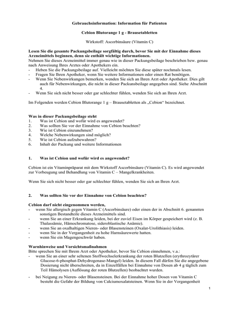 Gebrauchsinformation: Information für Patienten Cebion Blutorange 1 g - Brausetabletten Wirkstoff: Ascorbinsäure (Vitamin C) Lesen Sie die gesamte Packungsbeilage sorgfältig durch, bevor Sie mit der Einnahme dieses Arzneimittels beginnen, denn sie enthält wichtige Informationen. Nehmen Sie dieses Arzneimittel immer genau wie in dieser Packungsbeilage beschrieben bzw. genau nach Anweisung Ihres Arztes oder Apothekers ein. - Heben Sie die Packungsbeilage auf. Vielleicht möchten Sie diese später nochmals lesen. - Fragen Sie Ihren Apotheker, wenn Sie weitere Informationen oder einen Rat benötigen. - Wenn Sie Nebenwirkungen bemerken, wenden Sie sich an Ihren Arzt oder Apotheker. Dies gilt auch für Nebenwirkungen, die nicht in dieser Packunsbeilage angegeben sind. Siehe Abschnitt 4. - Wenn Sie sich nicht besser oder gar schlechter fühlen, wenden Sie sich an Ihren Arzt. Im Folgenden werden Cebion Blutorange 1 g – Brausetabletten als „Cebion“ bezeichnet. Was in dieser Packungsbeilage steht 1. Was ist Cebion und wofür wird es angewendet? 2. Was sollten Sie vor der Einnahme von Cebion beachten? 3. Wie ist Cebion einzunehmen? 4. Welche Nebenwirkungen sind möglich? 5. Wie ist Cebion aufzubewahren? 6. Inhalt der Packung und weitere Informationen 1. Was ist Cebion und wofür wird es angewendet? Cebion ist ein Vitaminpräparat mit dem Wirkstoff Ascorbinsäure (Vitamin C). Es wird angewendet zur Vorbeugung und Behandlung von Vitamin C – Mangelkrankheiten. Wenn Sie sich nicht besser oder gar schlechter fühlen, wenden Sie sich an Ihren Arzt. 2. Was sollten Sie vor der Einnahme von Cebion beachten? Cebion darf nicht eingenommen werden, - wenn Sie allergisch gegen Vitamin C (Ascorbinsäure) oder einen der in Abschnitt 6. genannten sonstigen Bestandteile dieses Arzneimittels sind. wenn Sie an einer Erkrankung leiden, bei der zuviel Eisen im Körper gespeichert wird (z. B. Thalassämie, Hämochromatose, sideroblastische Anämie). wenn Sie an oxalhaltigen Nieren- oder Blasensteinen (Oxalat-Urolithiasis) leiden. wenn Sie in der Vergangenheit zu hohe Harnsäurewerte hatten. wenn Sie ein Magengeschwür haben. Warnhinweise und Vorsichtsmaßnahmen Bitte sprechen Sie mit Ihrem Arzt oder Apotheker, bevor Sie Cebion einnehmen, v.a.: - wenn Sie an einer sehr seltenen Stoffwechselerkrankung der roten Blutzellen (erythrozytärer Glucose-6-phosphat-Dehydrogenase-Mangel) leiden. In diesem Fall dürfen Sie die angegebene Dosierung nicht überschreiten, da in Einzelfällen bei Einnahme von Dosen ab 4 g täglich zum Teil Hämolysen (Auflösung der roten Blutzellen) beobachtet wurden. - bei Neigung zu Nieren- oder Blasensteinen. Bei der Einnahme hoher Dosen von Vitamin C besteht die Gefahr der Bildung von Calciumoxalatsteinen. Wenn Sie in der Vergangenheit 1 schon mehrfach Nierensteine hatten, sollten Sie die Aufnahme von mehr als 100 bis 200 mg Vitamin C vermeiden. Dieses Arzneimittel ist in diesem Fall auf Grund seines Gehaltes von 1 g Vitamin C nicht für Sie geeignet. Fragen Sie in diesem Fall Ihren Arzt um Rat. - wenn Sie an einer schweren Nierenfunktionsstörung leiden und Dialysepatient sind. Sie sollten pro Tag nicht mehr als 50 bis 100 mg Vitamin C einnehmen, da es sonst zu hohen Oxalatkonzentrationen im Blut (Hyperoxalämie) und dadurch bedingt zur Bildung von Oxalatkristallen in den Nieren (Nierensteine) kommen kann. In diesem Fall ist Cebion nicht für Sie geeignet und Sie sollten ein niedriger dosiertes Vitamin C-Präparat verwenden. Einnahme von Cebion zusammen mit anderen Arzneimitteln Informieren Sie Ihren Arzt oder Apotheker, wenn Sie andere Arzneimittel einnehmen/anwenden, kürzlich andere Arzneimittel eingenommen/angewendet haben oder beabsichtigen andere Arzneimittel einzunehmen/anzuwenden. Vitamin C kann die Aufnahme von Eisen und Aluminium aus dem Magen-Darm-Trakt erhöhen. Dies ist besonders bei verminderter Leistung der Nieren, bei Eisenersatztherapie und bei Einnahme aluminiumhaltiger Medikamente gegen Magenübersäuerung zu beachten. Die gleichzeitige Einnahme mit Salicylaten (bestimmte Mittel gegen Schmerzen und Fieber) kann die Ausscheidung von Vitamin C erhöhen. Die gleichzeitige Einnahme von Deferoxamin (Arzneimittel zur Behandlung einer Eisenvergiftung) kann die Giftigkeit von Eisen im Gewebe, vor allem im Herzen, erhöhen und zu Herzversagen führen. Wenn Vitamin C in Mengen von mehreren Gramm eingenommen wird, können verschiedene Laborwerte (Zucker, Harnsäure, Kreatinin, anorganisches Phosphat) im Harn gestört sein. Bei Diabetikern kann Vitamin C - ohne Beeinflussung der Zuckerwerte im Blut - den Nachweis von Zucker im Harn verfälschen. Ebenso kann es nach Grammdosen zu falsch negativen Ergebnissen bei versuchtem Nachweis von Blut im Stuhl kommen. Allgemein können chemische Nachweismethoden, die auf Farbreaktionen beruhen, beeinträchtigt werden. Informieren Sie daher vor geplanten Untersuchungen bitte Ihren Arzt, falls Sie hohe Dosen von Vitamin C einnehmen. Hohe Dosen von Vitamin C können die Blutspiegel von Indinavir (bestimmtes Arzneimittel gegen Infektionen mit HIV) verringern. Schwangerschaft und Stillzeit Wenn Sie schwanger sind oder stillen, oder wenn Sie vermuten, schwanger zu sein oder beabsichtigen, schwanger zu werden, fragen Sie vor der Einnahme dieses Arzneimittels Ihren Arzt oder Apotheker um Rat. Wenn Sie schwanger sind, sollten Sie Cebion nur unter Aufsicht Ihres Arztes oder Zahnarztes einnehmen. Es wird davon abgeraten, die angegebenen Dosierungen in der Schwangerschaft und Stillzeit zu überschreiten. Vitamin C gelangt über den Mutterkuchen in den Kreislauf des ungeborenen Kindes und tritt auch in die Muttermilch über. Verkehrstüchtigkeit und Fähigkeit zum Bedienen von Maschinen Cebion hat keinen oder einen zu vernachlässigenden Einfluss auf die Verkehrstüchtigkeit und die Fähigkeit zum Bedienen von Maschinen. Cebion enthält Natrium und Saccharose. Natrium Dieses Arzneimittel enthält 10 mmol (oder 225 mg) Natrium pro Dosis. Wenn Sie eine ko