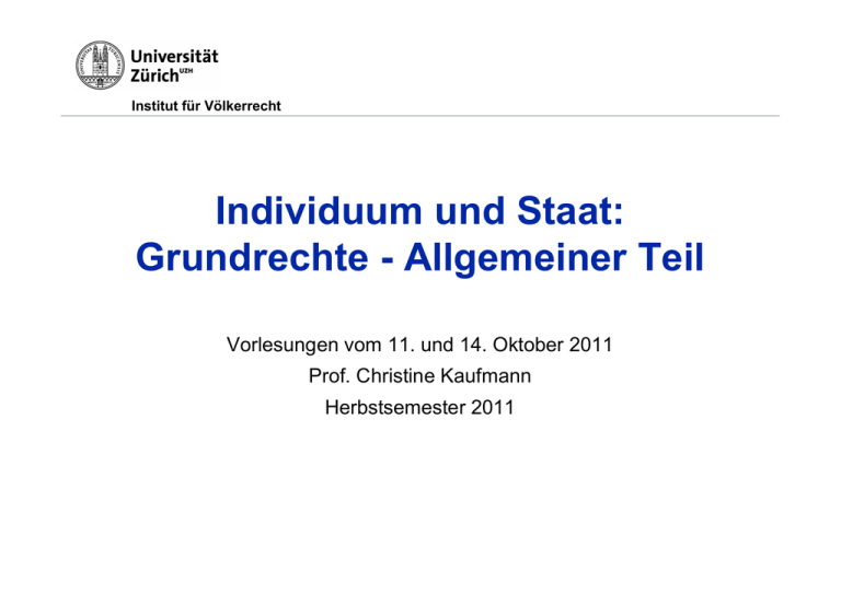 Institut für Völkerrecht Individuum und Staat: Grundrechte - Allgemeiner Teil Vorlesungen vom 11. und 14. Oktober 2011 Prof. Christine Kaufmann Herbstsemester 2011 Institut für Völkerrecht Grundfragen: Einstieg ¾ Der vierzehnjährige P. wird auf der Fahrt im Extragzug zu einem Fussballspiel des FCZ gegen den FC Basel von der Polizei am Bahnhof Altstetten festgenommen. Erst nach Mitternacht darf er seine Eltern anrufen. Sind Grundrechte tangiert? ¾ Der fünfzehnjährige M. wird wegen wiederholter massiver Störung des Unterrichts definitiv von der Schule verwiesen. Wird sein Recht auf Bildung verletzt? Staatsrecht I - Grundrechte Allgemeiner Teil, Prof. Dr. iur. Christine Kaufmann, Herbstsemester 2011 Seite 2 Institut für Völkerrecht Status des Individuums: Rechte und Pflichten: Terminologie (1/3) ¾ Grundrechte – Von der Verfassung garantiert – Schützen grundlegende Rechte des Einzelnen oder einer Gruppe – Rechtsansprüche gegenüber dem Staat ¾ Menschenrechte – Rechte, die für alle Menschen gelten, insbes. auch Ausländerinnen und Ausländer – Grundrechte, die vom Völkerrecht garantiert werden – Nicht alle Menschenrechte sind vor Gericht eingklagbar Staatsrecht I - Grundrechte Allgemeiner Teil, Prof. Dr. iur. Christine Kaufmann, Herbstsemester 2011 Seite 3 Institut für Völkerrecht Status des Individuums: Rechte und Pflichten: Terminologie (2/3) ¾ Verfassungsmässige Rechte – Umfasst alle Grundrechte und einige weitere Bestimmungen der BV, z.B. den Vorrang des Bundesrechts – Hat primär prozessrechtliche Bedeutung (Voraussetzung für subsidiäre Verfassungsbeschwerde) ¾ „Bürgerrechte“ – Uneinheitliche Terminologie – Kann stehen für • Grundrechte, auf die sich nur Schweizer Bürger berufen können (z.B. Niederlassungsfreiheit) • Rechte von Art. 37 und 38 BV Staatsrecht I - Grundrechte Allgemeiner Teil, Prof. Dr. iur. Christine Kaufmann, Herbstsemester 2011 Seite 4 Institut für Völkerrecht Status des Individuums: Rechte und Pflichten: Terminologie (3/3) ¾ Grundpflichten – Elementare Pflichten des Einzelnen – In BV kein Pflichtenkatalog, nur punktuelle Erwähnung, z.B. Militärdienst- und Zivilschutzdienstpflicht (Art. 59 Abs. 1 BV und 61 Abs. 3 BV) – Kantone kennen z.T. weitergehende Pflichten: z.B. Stimmpflicht (Schaffhausen), Amtszwang. Staatsrecht I - Grundrechte Allgemeiner Teil, Prof. Dr. iur. Christine Kaufmann, Herbstsemester 2011 Seite 5 Institut für Völkerrecht Status des Individuums: Rechte und Pflichten: Widerstandsrecht? ¾ „Grosses Widerstandsrecht“ – Naturrechtlich begründetes Recht, sich gegen ein illegitimes, ungerechtes Verhalten des Staates zu wehren und dabei geltendes (positives) Recht zu verletzen – Voraussetzungen • Legale Mittel erfolglos ausgeschöpft • Wahrung der Verhältnismässigkeit ¾ „Kleines Widerstandsrecht“ – Gleiche Definition wie oben, umfasst jedoch nur gewaltfreie Handlungen – Insbesondere: Ziviler Ungehorsam Staatsrecht I - Grundrechte Allgemeiner Teil, Prof. Dr. iur. Christine Kaufmann, Herbstsemester 2011 Seite 6 Institut für Völkerrecht Allgemeine Grundrechtslehren: Grundlagen der Grundrechte ¾ Erster Schritt: Philosophie (Naturrechtslehre) – John Locke: „The State of Nature has a Law of Nature to govern it, which obliges everyone: And Reason, which is that Law, teaches all Mankind, who will but consult it, that being all equal and independent, no one ought to harm another in his Life, Health Liberty and Possessions.“ – Zweck des Staates ist Schutz der Menschenrechte ¾ Zweiter und dritter Schritt: Umsetzung – Politische Umsetzung im Rahmen der Nationalstaaten – Universelle politische Umsetzung (Vereinte Nationen) Staatsrecht I - Grundrechte Allgemeiner Teil, Prof. Dr. iur. Christine Kaufmann, Herbstsemester 2011 Seite 7 Institut für Völkerrecht Allgemeine Grundrechtslehren: Entstehung, wichtige historische Daten (1/3) ¾ Ausgangspunkt: Grundrechte als rechtliche Antwort auf Bedrohungen durch den Staat, aber – Nicht jede Bedrohungslage führt zu neuen Grundrechten – Nicht jedes Element der menschlichen Entfaltung wird von Grundrechten geschützt ¾ 1215: Magna Charta ¾ 1628: Petition of Rights: Sicherheit der Person und des Eigentums ¾ 1679: Habeas Corpus Akte: Schutz vor willkürlicher Verhaftung Staatsrecht I - Grundrechte Allgemeiner Teil, Prof. Dr. iur. Christine Kaufmann, Herbstsemester 2011 Seite 8 Institut für Völkerrecht Allgemeine Grundrechtslehren: Entstehung, wichtige historische Daten (2/3) ¾ 1776: Virginia Bill of Rights und Amerikanische Unabhängigkeitserklärung – Einfluss von John Locke – Ergänzung der US-Verfassung durch Amendments: „Bill of Rights“ ¾ 1789: Declaration des droits de l‘homme et du citoyen – Grosser Einfluss in Europa – Betonung der Rechtsgleichheit ¾ 1948: Allgemeine Menschenrechtserklärung ¾ 1950: Europäische Menschenrechtskonvention ¾ 1966: UNO-Menschenrechtspakte I und II Staatsrecht I - Grundrechte Allgemeiner Teil, Prof. Dr. iur. Christine Kaufmann, Herbstsemester 2011 Seite 9 Institut für Völkerrecht Allgemeine Grundrechtslehren: Entstehung, wichtige historische Daten (3/3) ¾ 1969: Amerikanische Menschenrechtskonvention ¾ 1975: KSZE-Schlussakte von Helsinki ¾ 1981: Banjul Charta der Menschenrechte und der Rechte der Völker (Afrika) ¾ 1989: UNO-Konvention über die Rechte des Kindes ¾ 1992: Erklärung von Rio zu Umwelt und Entwicklung (Rio-Deklaration) ¾ 1993: Vienna Declaration and Programme of Action ¾ 2004: Arabische Charta der Menschenrechte ¾ 2006: UNO-Konvention über die Rechte von Menschen mit Behinderungen Staatsrecht I - Grundrechte Allgemeiner Teil, Prof. Dr. iur. Christine Kaufmann, Herbstsemester 2011 Seite 10 Institut für Völkerrecht Allgemeine Grundrechtslehren: Bedeutung der Grundrechte ¾ Grundrechte sind besonders geschützte Rechtspositionen – Sie binden das gesamte staatliche Handeln – Durchsetzung vor den Gerichten (dank Justiziabilität) ¾ Internat