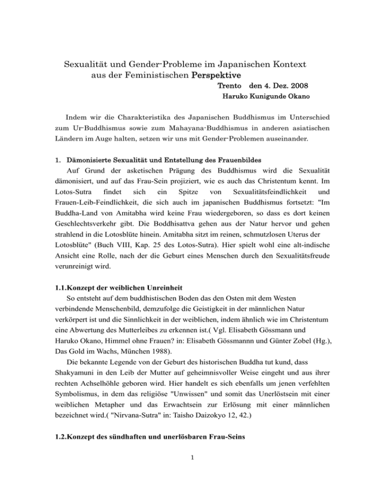 Sexualität und Gender-Probleme im Japanischen Kontext aus der Feministischen Perspektive Trento den 4. Dez. 2008 Haruko Kunigunde Okano Indem wir die Charakteristika des Japanischen Buddhismus im Unterschied zum Ur-Buddhismus sowie zum Mahayana-Buddhismus in anderen asiatischen Ländern im Auge halten, setzen wir uns mit Gender-Problemen auseinander. 1. Dämonisierte Sexualität und Entstellung des Frauenbildes Auf Grund der asketischen Prägung des Buddhismus wird die Sexualität dämonisiert, und auf das Frau-Sein projiziert, wie es auch das Christentum kennt. Im Lotos-Sutra findet sich ein Spitze von Sexualitätsfeindlichkeit und Frauen-Leib-Feindlichkeit, die sich auch im japanischen Buddhismus fortsetzt: "Im Buddha-Land von Amitabha wird keine Frau wiedergeboren, so dass es dort keinen Geschlechtsverkehr gibt. Die Boddhisattva gehen aus der Natur hervor und gehen strahlend in die Lotosblüte hinein. Amitabha sitzt im reinen, schmutzlosen Uterus der Lotosblüte" (Buch VIII, Kap. 25 des Lotos-Sutra). Hier spielt wohl eine alt-indische Ansicht eine Rolle, nach der die Geburt eines Menschen durch den Sexualitätsfreude verunreinigt wird. 1.1.Konzept der weiblichen Unreinheit So entsteht auf dem buddhistischen Boden das den Osten mit dem Westen verbindende Menschenbild, demzufolge die Geistigkeit in der männlichen Natur verkörpert ist und die Sinnlichkeit in der weiblichen, indem ähnlich wie im Christentum eine Abwertung des Mutterleibes zu erkennen ist.( Vgl. Elisabeth Gössmann und Haruko Okano, Himmel ohne Frauen? in: Elisabeth Gössmannn und Günter Zobel (Hg.), Das Gold im Wachs, München 1988). Die bekannte Legende von der Geburt des historischen Buddha tut kund, dass Shakyamuni in den Leib der Mutter auf geheimnisvoller Weise eingeht und aus ihrer rechten Achselhöhle geboren wird. Hier handelt es sich ebenfalls um jenen verfehlten Symbolismus, in dem das religiöse "Unwissen" und somit das Unerlöstsein mit einer weiblichen Metapher und das Erwachtsein zur Erlösung mit einer männlichen bezeichnet wird.( "Nirvana-Sutra" in: Taisho Daizokyo 12, 42.) 1.2.Konzept des sündhaften und unerlösbaren Frau-Seins 1 Während die Idee der Unreinheit des Frauenblutes und die der Sündhaftigkeit der Frau in Verbindung gesetzt wurde, wurde die Vorstellung breit im Volk verfestigt, dass die religiöse Erlösung der Frau unmöglich bzw. schwierig sei. In einem bekannten Lotos-Sutra (XII:Devadatta) heisst es: „Der Körper der Frau ist unrein, so dass er nicht die Schale für den Empfang der heiligen Lehre sein kann. Ausserdem haften der Frau fünf Hindernisse an. Das Wichtigste unter diesen Hindernissen besteht darin, dass sie als Frau nicht Buddha werden kann. Dadurch ergibt sie sich ein Widerspruch in der universalen Heilsidee des Mahayana, nämlich einerseits die Geschlechtsneutralität des für alle bestimmten Buddha-Ideals und andererseits die Auffassung, dass die Frau als Frau nicht Buddha werden kann. Um diesen Widerspruch zu lösen, rief man die Lehre von der Umgestaltung der Frau zum Mann ins Leben. So findet sich beispielsweise bis heute im japanaischen Buddhismus die Anschauung, dass es keinen Buddha in weiblicher Gestalt oder keine Frauen im paradiesischen Reinen Land (Jodo) gibt. Auf Grund der Sutren mit streng asketischer Prägung wie das Lotos-Sutra oder das kleine Sukhavativyuha-Sutra, die im japanischen Buddhismus eine unentbehrliche Rolle gespielt haben, kam ein negatives Frauenbild in Japan zustande, das auch von Frauen sowie Männern internalisiert worden ist. Die Vorstellung, dass die Frau eine sündhafte und unreine Form des Menschseins ist, galt lange Zeit auch als ein Bescheidenheitstopos von Frauen, dessen Sachverhalt noch näherer Untersuchung bedarf. Um das negative Frauenbild zum Ausdruck zu bringen, sind hier die zwei für Frauen speziellen Höllen nach der Volksfrömmigkeit zu erwähnen. Die erste Frauenhölle, ein sogenannter Blut-Teich (chinoike-jigoku ), in dem die Frauen im Blut schweben und ersticken, gilt für alle Frauen, die die Blutung kennen, da ihr Blut die Erde unrein macht und sie durch die Waschungen ihrer Wäsche Flüsse verunreinigen, aus dem die „reinen“ Mönche ahnungslos Wasser für den Tee holen und ebenso unrein werden. Dieses Bluttabu ist in der buddhistischen Geschichte Japans lange nachgewirkt: Selbst die buddhistischen die Priesterinnen hatten sich bis vor kurzem bei der Einweihung in die buddhistischen Gebote eigens einem Reinigungsritus mit einem bestimmten Sutra zu unterziehen, der für männliche Priester unnötig ist. Die zweite reine Frauenhölle heisst die Hölle der sogenannten unfruchtbaren Frau (umazume-jigoku), in der alle Frauen in Gestalt eines Drachen mit Hörnern oder einer Schlange als Dämonin dargestellt werden. Wahrscheinlich sind diejenigen impliziert, die die Schwangerschaft abgebrochen oder das Kind wegen Armuts gleich nach der Geburt töten lassen mussten. 2 Vom Mittelalter bis zur Neuzeit wurden verschiedene Höllenbilder gezeichnet, anhand derer man von Frauen die Frömmigkeit forderte, dienten aber in der Wirklichkeit der Domestizierung der Frauen. 1.3 Konzept der Erlösung der ‘unreinen’ und ‘sündhaften‘ Frauen Unter der Voraussetzung des in dieser Weise bestimmten Frau-Seins gab es in bezug auf das Heil von Frauen drei Möglichkeiten: 1. Aufgrund der im Mahayana-Buddhismus, also in der universalen Form des Buddhismus, entstandenen Lehre wird angenommen, dass die Frau, wenn sie entprechend gelebt hat, zum Mann umgewandelt und so erlöst werden kann. 2. Es gibt auch die Auffassung, dass sie durch den Rückzug ins klösterliche Leben gerettet werden kann, sowie, 3. Den Glauben, dass durch die Geburt und Erziehung eines Sohnes, dessen Verdienst als Mönch der Mutter zugute kommt, die Frau erlöst werden kann. Mit letzterem ist folgendes gemeint: Die Mutter eines Sohnes, die ihm in der Hoffnung, dass es sich zum Mönchtum entschliesst, zur Lehrerin wird, wird nicht mehr als weibliches Wesen angesehen
