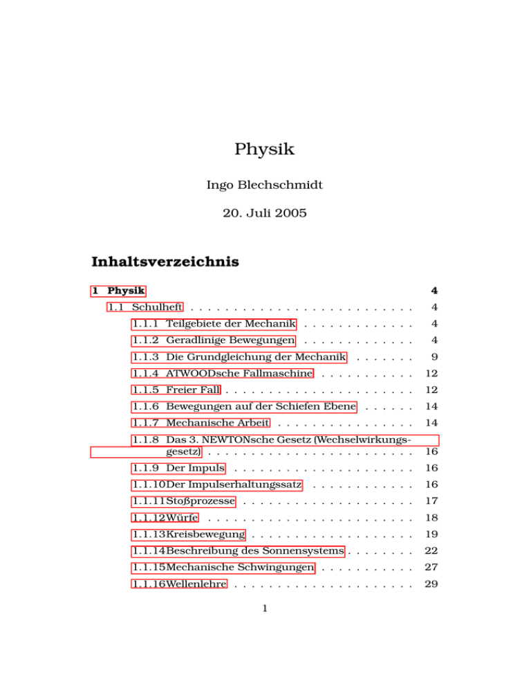 Physik Ingo Blechschmidt 20. Juli 2005 Inhaltsverzeichnis 1 Physik 4 1.1 Schulheft . . . . . . . . . . . . . . . . . . . . . . . . . . 4 1.1.1 Teilgebiete der Mechanik . . . . . . . . . . . . . 4 1.1.2 Geradlinige Bewegungen . . . . . . . . . . . . . 4 1.1.3 Die Grundgleichung der Mechanik . . . . . . . 9 1.1.4 ATWOODsche Fallmaschine . . . . . . . . . . . 12 1.1.5 Freier Fall . . . . . . . . . . . . . . . . . . . . . . 12 1.1.6 Bewegungen auf der Schiefen Ebene . . . . . . 14 1.1.7 Mechanische Arbeit . . . . . . . . . . . . . . . . 14 1.1.8 Das 3. NEWTONsche Gesetz (Wechselwirkungsgesetz) . . . . . . . . . . . . . . . . . . . . . . . . 16 1.1.9 Der Impuls . . . . . . . . . . . . . . . . . . . . . 16 1.1.10Der Impulserhaltungssatz . . . . . . . . . . . . 16 1.1.11Stoßprozesse . . . . . . . . . . . . . . . . . . . . 17 1.1.12Würfe . . . . . . . . . . . . . . . . . . . . . . . . 18 1.1.13Kreisbewegung . . . . . . . . . . . . . . . . . . . 19 1.1.14Beschreibung des Sonnensystems . . . . . . . . 22 1.1.15Mechanische Schwingungen . . . . . . . . . . . 27 1.1.16Wellenlehre . . . . . . . . . . . . . . . . . . . . . 29 1 INHALTSVERZEICHNIS 2 1.2 Hausaufgaben . . . . . . . . . . . . . . . . . . . . . . . 30 1.2.1 1. Hausaufgabe . . . . . . . . . . . . . . . . . . . 30 1.2.2 2. Hausaufgabe . . . . . . . . . . . . . . . . . . . 32 1.2.3 3. Hausaufgabe . . . . . . . . . . . . . . . . . . . 32 1.2.4 4. Hausaufgabe . . . . . . . . . . . . . . . . . . . 33 1.2.5 5. Hausaufgabe . . . . . . . . . . . . . . . . . . . 34 1.2.6 6. Hausaufgabe . . . . . . . . . . . . . . . . . . . 35 1.2.7 7. Hausaufgabe . . . . . . . . . . . . . . . . . . . 37 1.2.8 8. Hausaufgabe . . . . . . . . . . . . . . . . . . . 38 1.2.9 9. Hausaufgabe . . . . . . . . . . . . . . . . . . . 38 1.2.1010. Hausaufgabe . . . . . . . . . . . . . . . . . . 40 1.2.1112. Hausaufgabe . . . . . . . . . . . . . . . . . . 41 1.2.1213. Hausaufgabe . . . . . . . . . . . . . . . . . . 42 1.2.1314. Hausaufgabe . . . . . . . . . . . . . . . . . . 43 1.2.1415. Hausaufgabe . . . . . . . . . . . . . . . . . . 44 1.2.1516. Hausaufgabe . . . . . . . . . . . . . . . . . . 44 1.2.1617. Hausaufgabe . . . . . . . . . . . . . . . . . . 45 1.2.1718. Hausaufgabe . . . . . . . . . . . . . . . . . . 45 1.2.1819. Hausaufgabe . . . . . . . . . . . . . . . . . . 46 1.2.1920. Hausaufgabe . . . . . . . . . . . . . . . . . . 46 1.2.2021. Hausaufgabe . . . . . . . . . . . . . . . . . . 47 1.2.2122. Hausaufgabe . . . . . . . . . . . . . . . . . . 48 1.2.2223. Hausaufgabe . . . . . . . . . . . . . . . . . . 49 1.2.2324. Hausaufgabe . . . . . . . . . . . . . . . . . . 49 1.2.2425. Hausaufgabe . . . . . . . . . . . . . . . . . . 49 1.2.2526. Hausaufgabe . . . . . . . . . . . . . . . . . . 50 1.2.2627. Hausaufgabe . . . . . . . . . . . . . . . . . . 51 1.2.2729. Hausaufgabe . . . . . . . . . . . . . . . . . . 52 1.2.2830. Hausaufgabe . . . . . . . . . . . . . . . . . . 52 INHALTSVERZEICHNIS 3 1.2.2931. Hausaufgabe . . . . . . . . . . . . . . . . . . 52 1.2.3032. Hausaufgabe . . . . . . . . . . . . . . . . . . 53 1.2.3133. Hausaufgabe . . . . . . . . . . . . . . . . . . 54 1.2.3234. Hausaufgabe . . . . . . . . . . . . . . . . . . 54 1.2.3335. Hausaufgabe . . . . . . . . . . . . . . . . . . 54 1.2.3436. Hausaufgabe . . . . . . . . . . . . . . . . . . 55 1.2.3537. Hausaufgabe . . . . . . . . . . . . . . . . . . 55 1.2.3638. Hausaufgabe . . . . . . . . . . . . . . . . . . 56 1.2.3739. Hausaufgabe . . . . . . . . . . . . . . . . . . 56 1.2.3840. Hausaufgabe . . . . . . . . . . . . . . . . . . 57 1.2.3941. Hausaufgabe . . . . . . . . . . . . . . . . . . 57 1.2.4042. Hausaufgabe . . . . . . . . . . . . . . . . . . 58 1.2.4143. Hausaufgabe . . . . . . . . . . . . . . . . . . 58 1.2.4244. Hausaufgabe . . . . . . . . . . . . . . . . . . 59 1.2.4345. Hausaufgabe . . . . . . . . . . . . . . . . . . 59 1.2.4446. Hausaufgabe . . . . . . . . . . . . . . . . . . 60 1.2.4547. Hausaufgabe . . . . . . . . . . . . . . . . . . 60 1.2.4648. Hausaufgabe . . . . . . . . . . . . . . . . . . 60 1.2.4749. Hausaufgabe . . . . . . . . . . . . . . . . . . 61 1.2.4850. Hausaufgabe . . . . . . . . . . . . . . . . . . 61 1.2.4951. Hausaufgabe . . . . . . . . . . . . . . . . . . 63 1.2.5052. Hausaufgabe . . . . . . . . . . . . . . . . . . 63 1.3 Tests . . . . . . . . . . . . . . . . . . . . . . . . . . . . . 64 1.3.1 1. Extemporale aus der Mathematik . . . . . . 64 1.3.2 Formelsammlung zur 1. Schulaufgabe . . . . . 65 1.3.3 Formelsammlung zur 2. Schulaufgabe . . . . . 67 1 PHYSIK 1 4 Physik 1.1 Schulheft 1.1.1 Teilgebiete der Mechanik Kinematik Bewegungslehre Dynamik Einfluss von Kräften auf Bewegungen Statik Gleichgewicht von Kräften und Drehmomenten Bewegung Ortsveränderung bezüglich eines Bezugssystems Bezugssystem Koordinaten-System, in dem der Bewegungsablauf betrachtet wird 1.1.2 Geradlinige Bewegungen Die gleichförmige Bewegung Kennzeichen: In gleichen Zeitabschnitten ∆t werden gleiche Wege ∆x zurückgelegt. Weg = x ∼ t = Zeit =⇒ x t = const. =: v; Die Geschwindigkeit einer gleichförmigen Bewegung ist der konstante Quotient xt . v= x t und v = ∆x ; ∆t Graphische Darstellung: v = xt ; =⇒ x = v · t 1 PHYSIK 5 x Zeit−Ort−Diagramm (t−x−Diagramm) t v= ∆x ; ∆y Die Steigung der Ursprungsgeraden ist ein Maß für die Geschwindigkeit. v Zeit−Geschwindigkeits−Diagramm (t−v−Diagramm) t Die Fläche unter dem t-v-Diagramm ist ein Maß für den zurückgelegten Weg x. 1 PHYSIK 6 Die gleichmäßig beschleunigte Bewegung Kennzeichen: Die Geschwindigkeit ändert sich proportional zur Zeit. v v ∼ t; t Die Geschwindkeit nimmt bei festen Zeitintervallen ∆t stets um den selben Betrag zu. ⇒ ∆v ∼ ∆t; Es gilt: ∆v ∆t = v t = const.; wird als Beschleunigung a der gleichmäßig Der konstante Quotient ∆v ∆t beschleunigten Bewegung bezeichnet. Einheit der Beschleunigung: 1 sm2 ; Umrechnung: • 1 km = h 1000m 3600s = 1 m ; 3,6 s • 1 ms = 3, 6 km ; h v t = a = const.; 