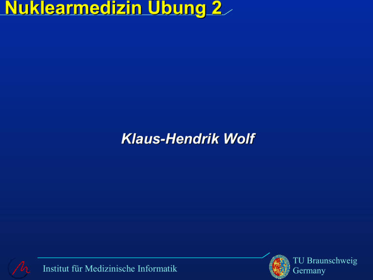 Nuklearmedizin Übung 2 Klaus-Hendrik Wolf Institut für Medizinische Informatik TU Braunschweig Germany Nuklidtafel Institut für Medizinische Informatik TU Braunschweig Germany Zerfallsreihe Institut für Medizinische Informatik TU Braunschweig Germany Strahlungsarten Ionisierende Strahlung ist in der Lage, Elektronen aus einem Atom herauszulösen. • Korpuskularstrahlung – Besteht aus Teilchen mit Ruhemasse – geladen oder ungeladen • Photonenstrahlung – Teilchen (Photonen) ohne Ruhemasse – ungeladen Institut für Medizinische Informatik TU Braunschweig Germany Strahlungsarten Direkt ionisierende Strahlung Elektrisch geladene Teilchen (z.B. Elektronen, Protonen, Deuteronen, Alphateilchen) geben ihre Energie unmittelbar durch Stöße an die Materie entlang ihrer Bahn ab Indirekt ionisierende Strahlung erzeugt durch Wechselwirkung mit einem Atom ein geladenes Teilchen, das durch Stöße Energie abgeben kann. Institut für Medizinische Informatik TU Braunschweig Germany Strahlungsarten Strahlenart Direkt ionisierendIndirekt ionisierend (geladene Teilchen) KorpuskularStrahlung (ungeladene Teilchen) Elektronen Neutronen Protonen Pi-Mesonen (Pionne) Deuteronen Alphateilchen Schwere Ionen Pi-Mesonen Pionen Photonenstrahlung Röntgenstrahlung Gammastrahlung Institut für Medizinische Informatik TU Braunschweig Germany Elektromagnetische Strahlung Institut für Medizinische Informatik TU Braunschweig Germany Elektromagnetische Strahlung Energietransport ist nicht kontinuierlich ● Diskrete Quantensprünge bei – Ausstrahlung (Emission) –Verschluckung (Absorption) Ausbreitungsgeschwindigkeit c = 300 000 km/s Wellenlänge ( λ), Frequenz (ν) c=λν Energie (E) E=νh ● Institut für Medizinische Informatik TU Braunschweig Germany Elektromagnetische Strahlung Röntgenstrahlung ionisierende Photonenstrahlung aus dem Coulombschen Feld der Atomkerne oder aus Atomhülle Gammastrahlung ionisierende Photonenstrahlung aus angeregten Atomkernen oder aus Elementarteilchenprozessen Röntgen- und Gammastrahlung unterscheiden sich nur durch die Art der Entstehung Institut für Medizinische Informatik TU Braunschweig Germany Korpuskularstrahlung Besteht aus • Geladenen Teilchen Elektronen, Protonen, Deuteronen, Alphateilchen, Pi-Mesonen • Ungladenen Teilchen Neutronen, Pi-Mesonen geladene Teilchen können in Teilchenbeschleunigern beschleunigt werden Korpuskularstrahlung kann durch Kernumwandlungen entstehen Institut für Medizinische Informatik TU Braunschweig Germany Wechselwirkungen mit Materie • • • • • • • Anregung und Ionisation Schwächung Absorption Photoeffekt (Photoionisation, Photoabsorption) Compton-Effekt Paarbildung / Paarvernichtung Zusammenstöße mit Materie Institut für Medizinische Informatik TU Braunschweig Germany Wechselwirkungen: Anregung und Ionisation Vorgang in Elektronenhülle • Absorption eines Photons • Zusammenstoß mit Elektron • Kontakt mit angeregtem Atom Ionisation • Direkte~ (Stoßionisation) • Indirekte~ durch Anregung Institut für Medizinische Informatik TU Braunschweig Germany Wechselwirkungen: Schwächung,Absorption Durchtritt von Photonenstranlung durch Materie Zusammengesetzt aus Absorption und Streuung Abhängig von • Körperdicke • Körperdichte • Kernladungszahl der Atome Absorption = Schächung – Streuung Institut für Medizinische Informatik TU Braunschweig Germany Wechselwirkungen: Photoeffekt Photoeffekt Institut für Medizinische Informatik Photon wird vollständig absorbiert Elektron wird emittiert (Bindungs- u. kinet.Energie) Durch Wiederbesetzung des Platzes Austrahlung von elektromagnetischer Strahlung TU Braunschweig Germany Wechselwirkungen: Compton-Effekt Photon löst äußeres Bindungselektron wird abgelenkt Energieverlust Compton-Effekt Institut für Medizinische Informatik TU Braunschweig Germany Wechselwirkungen: Paarbildungseffekt Vollständige Absorption des Energiequants (>1,022MeV) Wechselwirkung im Kernfeld Umwandlung in Teilchenpaar (Negatron, Positron) Postitron = „Antielektron“ => Vernichtungsstrahlung Paarbildungseffekt zwei Photonen je 0,511MeV diametral Institut für Medizinische Informatik TU Braunschweig Germany Strahlungsenergie Institut für Medizinische Informatik TU Braunschweig Germany Entstehung von Röntgenstrahlung Institut für Medizinische Informatik TU Braunschweig Germany Röntgenspektrum Institut für Medizinische Informatik TU Braunschweig Germany Wechselwirkungen mit biologischen Stukturen Institut für Medizinische Informatik TU Braunschweig Germany Direkte und indirekte Strahlenwirkungen Institut für Medizinische Informatik TU Braunschweig Germany Ionisationskammer Institut für Medizinische Informatik TU Braunschweig Germany Szintillationsdetektor Institut für Medizinische Informatik TU Braunschweig Germany Bohrlochmessplatz Institut für Medizinische Informatik TU Braunschweig Germany Kollimator Institut für Medizinische Informatik TU Braunschweig Germany Gammakamera Institut für Medizinische Informatik TU Braunschweig Germany Gammakamera Institut für Medizinische Informatik TU Braunschweig Germany