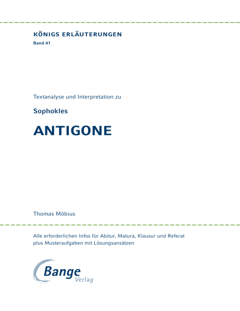 königs erläuterungen Band 41 Textanalyse und Interpretation zu Sophokles antigone Thomas Möbius Alle erforderlichen Infos für Abitur, Matura, Klausur und Referat plus Musteraufgaben mit Lösungsansätzen Zitierte Ausgabe: Sophokles: Antigone. Übersetzt von Wilhelm Kuchenmüller. Stuttgart: Reclam 1955 (Reclams Universal-Bibliothek 659). Über den Autor dieser Erläuterung: Thomas Möbius, geboren 1963 in Heidelberg, Studium der Germanistik und ev. Theologie, Promotion zum Dr. phil. in der germanistischen Mediävistik, Stipendiat der Konrad-Adenauer-Stiftung, Lehraufträge an der Universität Heidel­berg, 1991–2001 Lehrer an einem Gymnasium in Mannheim, seit 2002 Akademischer Rat an der Pädagogischen Hochschule Heidelberg, mehrjährige Auslandsaufenthalte in Mailand, Rom und Singapur, Autor von Lernhilfen und Königs Erläuterungen des Bange Verlags. Das Werk und seine Teile sind urheberrechtlich geschützt. Jede Verwertung in anderen als den gesetzlich zugelassenen Fällen bedarf der vorherigen schriftlichen Einwilligung des Verlages. Hinweis zu § 52 a UrhG: Die öffentliche Zugänglichmachung eines für den Unterrichtsgebrauch an Schulen bestimmten Werkes ist stets nur mit Einwilligung des Berechtigten zulässig. 2. Auflage 2012 ISBN 978-3-8044-1937-7 PDF: 978-3-8044-5937-3, EPUB: 978-3-8044-6937-2 © 2003, 2011 by C. Bange Verlag, 96142 Hollfeld Alle Rechte vorbehalten! Titelbild: Szenenfoto aus einer Theateraufführung der Antigone des Sophokles von Bertolt Brecht am Stadttheater Chur/Schweiz 1948. Helene Weigel (Mitte) als Antigone. © Ruth Berlau/Hoffmann. Bild-Nr. 47-153. Druck und Weiterverarbeitung: Tiskárna Akcent, Vimperk inhalt 1. Das Wichtigste auf einen Blick – Schnellübersicht 2. Sophokles: Leben und Werk 8 2.1Biografie 2.2 Zeitgeschichtlicher Hintergrund Der Dionysoskult Das griechische Theater 2.3 Angaben und Erläuterungen zu wesentlichen Werken 3. Textanalyse und -interpretation 6 8 10 10 13 17 3.1Entstehung und Quellen 3.2Inhaltsangabe 3.3Aufbau Die Grundstruktur der Handlung Drei Einheiten Chronologie der Szenen 3.4Personenkonstellationen und Charakteristiken Zweifigurendrama Kreon Kreon und Haimon Kreon und Teiresias Antigone Der Chor Der Wächter 3.5 Sachliche und sprachliche Erläuterungen 18 18 25 29 29 31 31 45 46 46 49 50 52 56 59 61 inhalt 3.6 Stil und Sprache 3.7Interpretationsansätze Tragödie von der freien Selbstbestimmung Historisch-politische Bezüge 4.Rezeptionsgeschichte Dramatische Bearbeitungen Epische Bearbeitungen Inszenierungen 5.Materialien Mat. 1 Aristoteles (384–322): Poetik (Auszüge) Mat. 2 Über den Antigone-Monolog im Werkstatt-Theater Darmstadt im Jahre 1998 Mat. 3 David Bösch inszeniert Antigone im Essener Grillo Theater im Jahre 2008 Mat. 4 Inszenierung in antiker Spielpraxis auf den Münchner Dionysien im Jahre 1997 Mat. 5 Projekt Antigone 2000 der Arbeitsgruppe Parate Labor 69 70 71 73 77 77 84 87 91 91 92 94 96 98 6.Prüfungsaufgaben mit Musterlösungen 100 Literatur 116 Stichwortverzeichnis 118 1schnellübersicht 2sophokles: Leben und Werk 3Textanalyse und -interpretation 1. Das Wichtigste auf einen Blick – Schnellübersicht Damit sich jeder Leser in unserem Band rasch zurechtfindet und das für ihn Interessante gleich entdeckt, hier eine Übersicht. S. 8 f. S. 10 ff. S. 17 Im 2. Kapitel beschreiben wir Sophokles’ Leben und stellen den zeitgeschichtlichen Hintergrund dar: Sophokles lebte von ca. 497/496 bis 406 v. Chr. in Athen. (Abschnitt 2.1) Die Zeit war politisch geprägt durch die Rivalität zwischen Athen und Sparta. Das wichtigste innenpolitische Ereignis waren die demokratischen Reformen des Perikles. (Abschnitt 2.2) Die Antigone wurde um 442/441 während der Feiern zu Ehren des Gottes Dionysos uraufgeführt. (Abschnitt 2.3) Im 3. Kapitel bieten wir eine Textanalyse und -interpretation. S. 18 ff. Der Antigonestoff ist vermutlich Bestandteil einer thebanischen Lokalsage. Möglicherweise hat die Tragödie des Sophokles auch selbst den Antigonestoff begründet. (Abschnitt 3.1) S. 25 ff. Entstehung und Quellen: Inhalt: Die Tragödie behandelt die Frage nach den Grundlagen und den Grenzen menschlichen Handelns. Antigone handelt gegen das Bestattungsverbot Kreons und begräbt ihren Bruder Polyneikes. Sie begründet ihre Haltung mit dem Göttergebot, das die Bestattung eines Toten zur heiligen Pflicht macht. Kreon verurteilt sie deswegen zum Tode. (Abschnitt 3.2) 6 sophokles 4Rezeptions­ geschichte 5materialien 6prüfungs­ aufgaben Chronologie und Schauplätze: Der Handlungszeitraum erstreckt sich von frühmorgens bis zum Abend desselben Tages; die Tragödie spielt durchgehend an einem Ort, vor dem Königspalast in Theben. (Abschnitt 3.3) S. 29 ff. Personen: Die Hauptpersonen sind: Kreon: absolutistischer Herrscher Unbestechlichkeit und Unabhängigkeit als oberste Prinzipien seines Handelns weicht nur gezwungenermaßen der göttlichen Macht. S. 46 ff. Antigone beruft sich auf göttliches Recht. bereit zur Selbstaufopferung wirkt auch unbesonnen. S. 52 ff. Wir stellen diese Hauptfiguren und die Nebenfiguren ausführlich vor. (Abschnitt 3.4) Stil und Sprache: Stil und Sprache werden einerseits durch die Übersetzung aus dem Griechischen geprägt, zum anderen ist die reichhaltige Metaphorik sowie zahlreiche Anspielungen auf griechische Götterund Heldensagen auffällig. (Abschnitt 3.5/3.6) S. 61 ff. Zwei Interpretationsansätze: Die Antigone ist eine Tragödie von der freien Selbstbestimmung. eine Tragödie mit historisch-politischen Bezügen. (Abschnitt 3.7) antigone 7 S. 70 ff. 1schnellübersicht 2sophokles: Leben und Werk 3Textanalyse und -interpretation 2.1Biografie 2. Sophokles: Leben und Werk 2.1 Biografie Sophokles (um 497–406 v. Chr.) Das Leben des Sophokles ist vor dem Hintergrund der griechischen Polis zu begreifen; seine Lebenszeit von ca. 497 v. Chr. bis 406 v. Chr. umfasst die höchste Blüte der athenischen Sklavenhalterdemokratie. Die vollständige Niederlage Athens im Kampf gegen Sparta hat er n