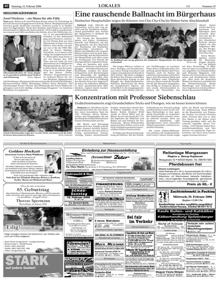 40 LOKALES Samstag, 11. Februar 2006 HERZLICHEN GLÜCKWUNSCH Josef Niederer − ein Mann für alle Fälle Tann (prä). Rektor a.D. Josef Niederer feierte seinen 70. Geburtstag. Er hat sich durch sein Engagement in Schule, Pfarrei, Marktgemeinde und Vereinen große Verdienste erworben. Geboren wurde er in Taufkirchen bei Eggenfelden. Nach dem Studium und Einsatz an mehreren Schulen kam er 1968 an die Tanner Schule. 1974 wurde er zum Konrektor ernannt und 1981 zum Rektor der Schule, die er bis 1994 leitete, bevor er aus gesundheitlichen Gründen in den Ruhestand ging. Josef Niederer, verheiratet mit Christa Ruh aus dem Münstertal, ist Vater von zwei Söhnen. Eine Reihe von Jahren war er für die FWG Mitglied im Tanner Marktgemeinderat, wo er durch seine ruhige Art ausgleichend wirkte. Zehn Jahre lang leitete er mit viel Einsatz den TSV Tann und seit mehr als zwei Jahrzehnten ist er Mitglied im Pfarrgemeinderat, den er viele Jahre führte. Seit der Gründung ist er bewährter RegisOberstudiendirektor Dr. Franz Bogda- seur des Tanner „Thaliany (l.) gratulierte Jubilar Josef Niederer Theaters“. Es gratulierten unzum Geburtstag. (Foto: Aigner) ter anderem Pfarrer Dr. Anton Morhard, Bürgermeister Adi Fürstberger, Pfarrgemeinderatsvorsitzender Konrad Zitzelsberger, Kirchenvorstand Alfons Stranzinger, Rektor Franz Reitmeier und Abordnungen Tanner Vereine. Der Höhepunkt der Feiern bildete der gelungene und recht zünftige „Geburtstags-Hoagarten“ im Gasthaus Wirtsbauer in Langeneck. CS Nummer 35 Eine rauschende Ballnacht im Bürgerhaus Simbacher Hauptschüler zeigen ihr Können von Cha-Cha-Cha bis Walzer beim Abschlussball Simbach (red). Obwohl die Tischreihen schon sehr eng gestellt und die Tanzfläche entsprechend geschmälert war, konnte das Bürgerhaus in Simbach die Besucher kaum fassen. Zur Freude der Tanzschüler hatten sich Eltern, Großeltern, Freunde und Bekannte auf den Weg gemacht, um den Abschluss des Tanzkurses der Simbacher Hauptschüler mitzufeiern. 56 Buben und Mädchen der neunten Klassen hatten sich an dem Tanzkurs beteiligt, den der Elternbeirat der Hauptschule und allen voran die Vorsitzende Eva Petschl für die Jugendlichen organisiert hatte. Dass ein Tanzkurs sich nicht nur auf das Erlernen und Einüben gängiger Schrittkombinationen beschränkt, sondern bei dieser Gelegenheit auch Benimmregeln und Ratschläge für gepflegtes Aussehen vermittelt werden, zeigte sich schon bei der Eröffnung des Abends: Eine reine Augenweide boten die hübschen Mädchen in ihren geschmackvollen Ballkleidern, ergänzt durch wunderschöne Blumensträuße. Abend immer wieder durch interessante Vorführungen ihres erlernten Könnens auf. Sie demonstrierten den klassischen Foxtrott ebenso elegant wie den langsamen Walzer, den BoogieWoogie und den Cha-Cha-Cha. Einen Riesenapplaus erntete In Ballkleid und Anzug glänzten die Simbacher Hauptschüler bei ihrem Tanzkurs-Ab- die Showtanzschlussball. (Foto: red) gruppe „Sensation“ aus Julbach Die jungen Männer wirkten in tere Vorführungen zu wechseln. mit ihrer Tanzeinlage. 15 Mädihren Anzügen und Kombinatio- Nach dieser eindrucksvollen Vor- chen im Alter von zwölf bis 21 Jahnen schon richtig erwachsen und stellung sprach Rektor Karl Farn- ren, angeführt von Claudia Huber zeigten sich gekonnt als Kavaliere hammer, auch im Namen der und Natascha Wagmann, vollalter Schule. Mit Stolz verfolgten zahlreich anwesenden Lehrerkol- führten ein Feuerwerk an tänzeridie Eltern ihre Töchter und Söhne legen, dem Elternbeirat Dank und schen und akrobatischen Einlabeim glanzvollen Einzug zu den den Schülern seine Glückwün- gen. Aber auch die deutschen Klängen des Radetzkymarsches. sche aus. Dann wurde die Tanzflä- Meister im Paartanz und dritte bei Fehlerlos absolvierten die Paare che für alle Besucher freigegeben, der Weltmeisterschaft, Katrin die komplizierten Figuren, um was fleißig in Anspruch genom- Mühlberger und Christoph Peschließlich in die Ausgangspositi- men wurde. Zwischendurch lo- cher, begeisterten mit ihren Showon für den ersten Walzer und wei- ckerten die Tanzschüler den tänzen das gesamte Publikum. Konzentration mit Professor Siebenschlau Gedächtnistrainerin zeigt Grundschülern Tricks und Übungen, wie sie besser lernen können Simbach (cs). Die Klasse 3a der Grundschule hatte für zwei Stunden einen besonderen Gast bei sich: Professor Henry Siebenschlau, eine Fingerpuppe, die auf der Hand der Gedächtnistrainerin Gisela Christina Jobst steckte. Gisela Christina Jobst zeigte der 3 a viele Tricks, mit denen sich die Schüler besser konzentrieren können. (Foto: Schmid) brachte. Anstatt der Lehrerin Tan- stellerübung war Fantasie gefragt Jobst mit Musik und Bewegung ja Wührer begrüßte er die Frau und Reizwörter waren in der rich- für Auflockerung. Tanja Wührer Spürer, Rektor Günther Wöhl tigen Reihenfolge in eine span- ist die Klassleiterin von Tiziana, wurde zu Herrn Möhl und die nende Geschichte zu verpacken. der Tochter von Gisela Christina Klasse 3a war auf einmal die 13 h. Die Gehirnzellen mussten inten- Jobst. Tizianas Idee war es, dass Da begehrten die Mädchen und siv aktiviert werden, denn aus ihre Mama in der Klasse einen Buben auf und lieferten die Ver- Zauberer, Zahnbürste oder Vortrag gestalten sollte und die besserung. „Henry Siebenschlau Springbrunnen einen sinnvollen Lehrerin begrüßte diesen VorMit Musik und Bewegung passieren diese Fehler, weil er sich Ablauf zu gestalten, erforderte tatschlag: „Viele Kinder haben Konmachte diese den Auftakt und die nicht richtig konzentrieren kann“, sächlich Fantasie. zentrationsprobleme und hier Kinder mussten herzlich lachen, erklärte Gisela Christina Jobst. als der Professor, der sich nicht so Mit einem Zahlen-Bildersys- können sie praktische Tipps berichtig konzentrieren konnte, Es folgte eine Konzentrationsü- tem arbeitete die Gedächtnistrai- kommen, die ihnen beim Lernen wichtige Namen durcheinander bung mit Bildern. Bei der Schrift- ne