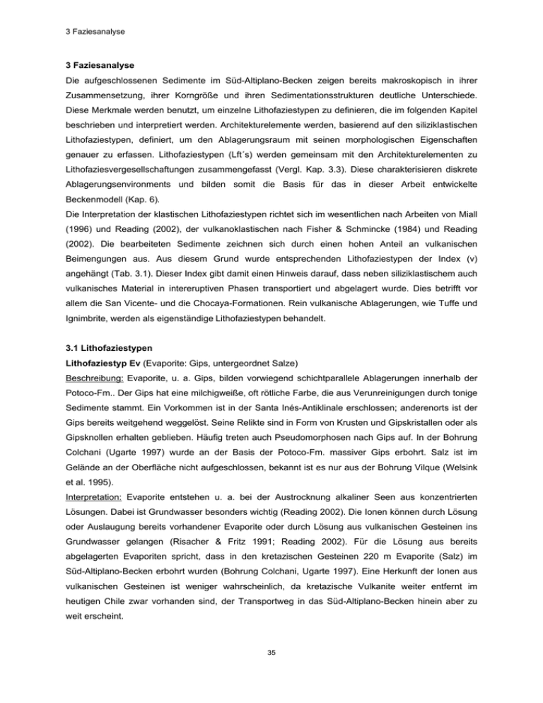 3 Faziesanalyse 3 Faziesanalyse Die aufgeschlossenen Sedimente im Süd-Altiplano-Becken zeigen bereits makroskopisch in ihrer Zusammensetzung, ihrer Korngröße und ihren Sedimentationsstrukturen deutliche Unterschiede. Diese Merkmale werden benutzt, um einzelne Lithofaziestypen zu definieren, die im folgenden Kapitel beschrieben und interpretiert werden. Architekturelemente werden, basierend auf den siliziklastischen Lithofaziestypen, definiert, um den Ablagerungsraum mit seinen morphologischen Eigenschaften genauer zu erfassen. Lithofaziestypen (Lft´s) werden gemeinsam mit den Architekturelementen zu Lithofaziesvergesellschaftungen zusammengefasst (Vergl. Kap. 3.3). Diese charakterisieren diskrete Ablagerungsenvironments und bilden somit die Basis für das in dieser Arbeit entwickelte Beckenmodell (Kap. 6). Die Interpretation der klastischen Lithofaziestypen richtet sich im wesentlichen nach Arbeiten von Miall (1996) und Reading (2002), der vulkanoklastischen nach Fisher & Schmincke (1984) und Reading (2002). Die bearbeiteten Sedimente zeichnen sich durch einen hohen Anteil an vulkanischen Beimengungen aus. Aus diesem Grund wurde entsprechenden Lithofaziestypen der Index (v) angehängt (Tab. 3.1). Dieser Index gibt damit einen Hinweis darauf, dass neben siliziklastischem auch vulkanisches Material in intereruptiven Phasen transportiert und abgelagert wurde. Dies betrifft vor allem die San Vicente- und die Chocaya-Formationen. Rein vulkanische Ablagerungen, wie Tuffe und Ignimbrite, werden als eigenständige Lithofaziestypen behandelt. 3.1 Lithofaziestypen Lithofaziestyp Ev (Evaporite: Gips, untergeordnet Salze) Beschreibung: Evaporite, u. a. Gips, bilden vorwiegend schichtparallele Ablagerungen innerhalb der Potoco-Fm.. Der Gips hat eine milchigweiße, oft rötliche Farbe, die aus Verunreinigungen durch tonige Sedimente stammt. Ein Vorkommen ist in der Santa Inés-Antiklinale erschlossen; anderenorts ist der Gips bereits weitgehend weggelöst. Seine Relikte sind in Form von Krusten und Gipskristallen oder als Gipsknollen erhalten geblieben. Häufig treten auch Pseudomorphosen nach Gips auf. In der Bohrung Colchani (Ugarte 1997) wurde an der Basis der Potoco-Fm. massiver Gips erbohrt. Salz ist im Gelände an der Oberfläche nicht aufgeschlossen, bekannt ist es nur aus der Bohrung Vilque (Welsink et al. 1995). Interpretation: Evaporite entstehen u. a. bei der Austrocknung alkaliner Seen aus konzentrierten Lösungen. Dabei ist Grundwasser besonders wichtig (Reading 2002). Die Ionen können durch Lösung oder Auslaugung bereits vorhandener Evaporite oder durch Lösung aus vulkanischen Gesteinen ins Grundwasser gelangen (Risacher & Fritz 1991; Reading 2002). Für die Lösung aus bereits abgelagerten Evaporiten spricht, dass in den kretazischen Gesteinen 220 m Evaporite (Salz) im Süd-Altiplano-Becken erbohrt wurden (Bohrung Colchani, Ugarte 1997). Eine Herkunft der Ionen aus vulkanischen Gesteinen ist weniger wahrscheinlich, da kretazische Vulkanite weiter entfernt im heutigen Chile zwar vorhanden sind, der Transportweg in das Süd-Altiplano-Becken hinein aber zu weit erscheint. 35 3 Faziesanalyse Code Chemische Sedimente Ev P Beschreibung Interpretation Vorkommen Evaporite: Gips, Salz Paläoböden, z. T. mit Karbonatkonkretionen Evaporation in der Playaebene Bodenbildung Stromatolithe, teils mit Schalenresten Biogenreiches Karbonat mit Fossilien Lagunen- und Seenbildung Lagunen- und Seenbildung Santa Lucía-Fm. San Vicente-Fm. Massive Siltsteine Ablagerung in Überflutungsebenen, Playa Siltsteine in Wechsellagen mit Sandsteinen Überflutungsebenen neben Flussrinnen Santa Lucía-Fm. Potoco-Fm. San Vicente-Fm. Potoco-Fm. Schräggeschichtete Sandsteine Planar schräggeschichtete Sandsteine äolische Dünen San Vicente-Fm. subaquatische 2-D Dünen; Vorkommen auf Überflutungsebenen, an Barren Sr Rippelschräggeschichtete Sandsteine gebildet in flachem, strömenden Wasser Sh, Sh(v) Horizontalgeschichtete Sandsteine Normal gradierter Sandstein Santa Lucía-Fm. Potoco-Fm. San Vicente-Fm. Santa Lucía-Fm. Cayara-Fm. Potoco-Fm. Potoco-Fm. Cstr Cfos Siltsteine F Fl Sandsteine Seod, Seod(v) Sp, Sp(v) Sg, Sg(v) Potoco-Fm. Santa Lucía-Fm. Potoco-Fm. San Vicente-Fm. San Vicente-Fm. in alluvialen Fächern abgelagerte Sandsteine Cayara-Fm. Potoco-Fm. San Vicente-Fm. Santa Lucía-Fm. Potoco-Fm. San Vicente-Fm. Cayara-Fm. Potoco-Fm. San Vicente-Fm. Chocaya-Fm. St, St(v) Sandsteine mit trogförmiger Schrägschichtung Migration von 3-D Dünen Sm, Sm(v) Massige, unsortierte Sandsteine Ablagerung distaler „debris flows” („sheet floods”) Matrixgestützte Konglomerate, gradiert Matrixgestützte Konglomerate, massiv Ablagerung von „debris flows” Klastengestützte Konglomerate, horizontalgeschichtet, imbriziert Trogförmig geschichtete Konglomerate in der Flussrinne abgelagerte Sandkörper („bars”) Rinnenfüllungen kiesdominierter Flüsse Potoco-Fm. San Vicente-Fm. Vulkanite Gvolc Autoklastit San Vicente-Fm. Svf FeinkörnigeTuffe durch vulkanische Aktivität verursachte „debris flows” Ablagerung in Überflutungsebenen; Transport als Suspensionsfracht Svg Grobkörnige Tuffe, kristallreich füllt Relief aus, Rinnenfüllungen, San Vicente-Fm. Chocaya-Fm. Konglomerate Gmg (v) Gmm (v) Gt/h (v) Gt (v) Tab. 3.1 Lithofaziestypen Süd-Altiplano-Becken. der Ablagerung von „debris flows” eozänen bis 36 miozänen Sedimente Potoco-Fm. San Vicente-Fm. Potoco-Fm. San Vicente-Fm. Chocaya-Fm. Santa Lucía-Fm. Cayara-Fm. San Vicente-Fm. Potoco-Fm. San Vicente-Fm. und Vulkanite im 3 Faziesanalyse Lithofaziestyp P (Paläoböden, Miall 1996) Beschreibung: An der Basis der Potoco-Fm. sind in den Siltsteinen weitverbreitet 30 - 40 cm dicke „fleckige” Bereiche zu beobachten. Sie lassen sich im Streichen über mehrere Meter verfolgen. Mehrere einzelne Horizonte übereinander ergeben Gesamtmächtigkeiten von max. 3 m. Die gelb-grün bis hellbraunen, 2 bis 3 cm großen runden bis ovalen „Flecken” heben sich