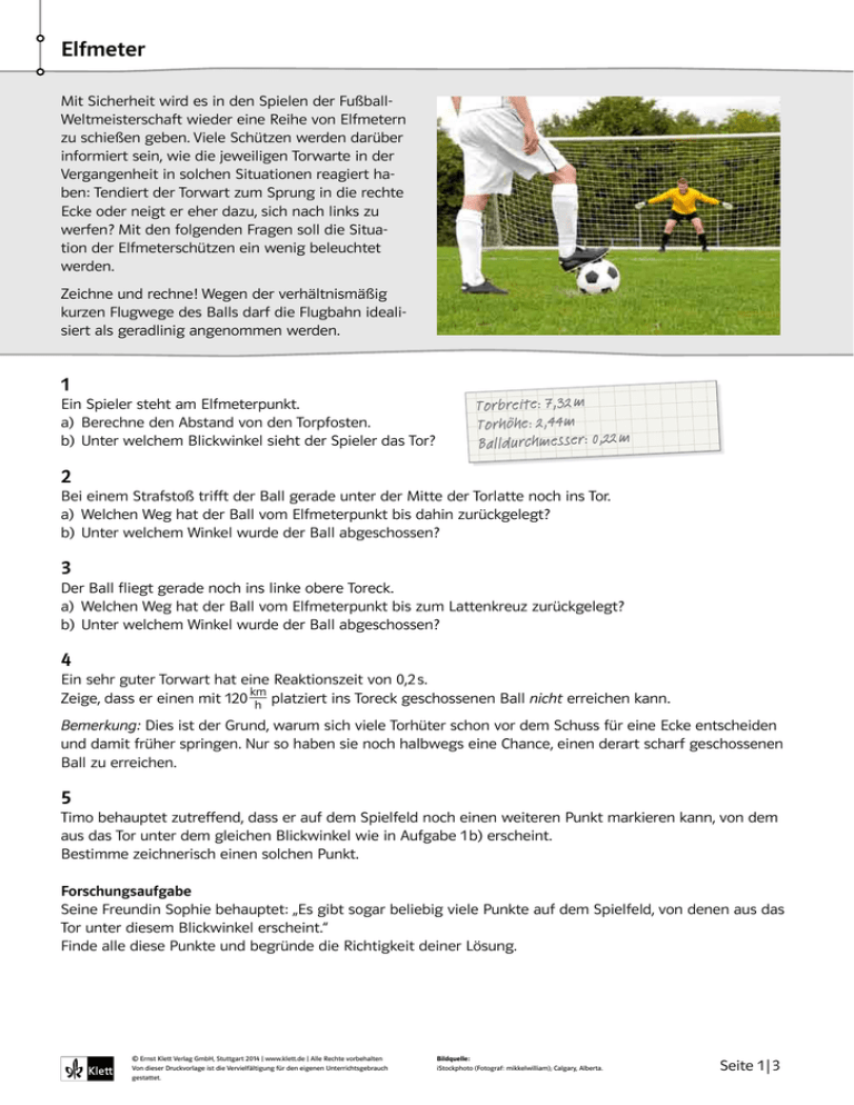 Elfmeter Mit Sicherheit wird es in den Spielen der FußballWeltmeisterschaft wieder eine Reihe von Elf­metern zu schießen geben. Viele Schützen werden darüber informiert sein, wie die jeweiligen Torwarte in der Vergangenheit in solchen Situationen ­reagiert haben: Tendiert der Torwart zum Sprung in die rechte Ecke oder neigt er eher dazu, sich nach links zu werfen? Mit den folgenden Fragen soll die Situation der Elfmeterschützen ein wenig beleuchtet werden. Zeichne und rechne! Wegen der verhältnismäßig kurzen Flugwege des Balls darf die Flugbahn idealisiert als geradlinig angenommen werden. 1 Ein Spieler steht am Elfmeterpunkt. a) Berechne den Abstand von den Torpfosten. b) Unter welchem Blickwinkel sieht der Spieler das Tor? Torbreite: 7,32m Torhöhe: 2,44m Balldurchmesser: 0,22m 2 Bei einem Strafstoß trifft der Ball gerade unter der Mitte der Torlatte noch ins Tor. a) Welchen Weg hat der Ball vom Elfmeterpunkt bis dahin zurückgelegt? b) Unter welchem Winkel wurde der Ball abgeschossen? 3 Der Ball fliegt gerade noch ins linke obere Toreck. a) Welchen Weg hat der Ball vom Elfmeterpunkt bis zum Lattenkreuz zurückgelegt? b) Unter welchem Winkel wurde der Ball abgeschossen? 4 Ein sehr guter Torwart hat eine Reaktionszeit von 0,2 s. km Zeige, dass er einen mit 120 _ platziert ins Toreck geschossenen Ball nicht erreichen kann. h Bemerkung: Dies ist der Grund, warum sich viele Torhüter schon vor dem Schuss für eine Ecke entscheiden und damit früher springen. Nur so haben sie noch halbwegs eine Chance, einen derart scharf geschossenen Ball zu erreichen. 5 Timo behauptet zutreffend, dass er auf dem Spielfeld noch einen weiteren Punkt markieren kann, von dem aus das Tor unter dem gleichen Blickwinkel wie in Aufgabe 1 b) erscheint. Bestimme zeichnerisch einen solchen Punkt. Forschungsaufgabe Seine Freundin Sophie behauptet: „Es gibt sogar beliebig viele Punkte auf dem Spielfeld, von denen aus das Tor unter diesem Blickwinkel erscheint.“ Finde alle diese Punkte und begründe die Richtigkeit deiner Lösung. © Ernst Klett Verlag GmbH, Stuttgart 2014 | www.klett.de | Alle Rechte vorbehalten Von dieser Druckvorlage ist die Vervielfältigung für den eigenen Unterrichtsgebrauch gestattet. Bildquelle: iStockphoto (Fotograf: mikkelwilliam); Calgary, Alberta. Seite 1 | 3 Elfmeter Lösungen Inhalte (ab Klasse 9) Satz von Pythagoras, Trigonometrie, Umfangwinkelsatz 1 Torbreite 3,66m 3,66m a) Mit dem Satz von Pythagoras in einem der beiden rechtwinkligen Dreiecke erhält man 11,00m d2 = (11,00 m)2 + (3,66 m)2 und damit d ≈ 11,59 m. 3,66 m b) Für die Winkelweite α gilt: tan (α) = __ 11,00 m ≈ 0,3327 Daraus folgt: α ≈ 18,4 ° Der Blickwinkel ist doppelt so groß, hat also die Weite von ungefähr 36,8°. d α Elfmeterpunkt 2 a) Der Ballmittelpunkt liegt 0,11 m über dem Elfmeterpunkt und dann 0,11 m unter der Querlatte. Der Ballmittelpunkt überwindet also einen Höhenunterschied von 2,22 m. Mit dem Satz von Pythagoras ergibt sich für den Flugweg d die Bedingung d2 = (11,00 m)2 + (2,22 m)2 und daraus d ≈ 11,22 m. Der Flugweg ist etwa 11,22 m lang. Querlatte Ballmittelpunkt d 2,22m β Ballmittelpunkt 11,00m 2,22 m b) Für die Weite β des Abschusswinkels gilt: tan (β) = __ 11,00 m ≈ 0,2018 Der Abschusswinkel hat demnach etwa die Weite 11,4°. 3 a) Von der Tormitte bis zum Pfosten bewegt sich der Ballmittelpunkt 3,55 m weit. Von diesem Punkt aus muss der Ballmittelpunkt noch 2,22 m senkrecht nach oben bewegt werden, damit der Ball im Tor­eck ist. Zweimalige Anwendung des Satzes von Pythagoras ergibt: Ziel Ballmittelpunkt neben Pfosten 2,22m Tormitte 3,55m f2 = e2 + (2,22 m)2 = (11,00 m)2 + (3,55 m)2 + (2,22 m)2 11,00m e e2 = (11,00 m)2 + (3,55 m)2 f Die Länge f der Flugbahn ist daher näherungsweise 11,77 m. b) Die Winkelweite δ kann z. B. mit dem Sinus ermittelt werden: 2,22 m δ γ 2,22 m sin (δ) = _ f = __ = 0,1886 11,77 m Folglich: δ ≈ 10,9° © Ernst Klett Verlag GmbH, Stuttgart 2014 | www.klett.de | Alle Rechte vorbehalten Von dieser Druckvorlage ist die Vervielfältigung für den eigenen Unterrichtsgebrauch gestattet. Seite 2 | 3 Elfmeter Lösungen 4 s f f 11,77 m 11,77 m Flugzeit des Balls ins Toreck: v = _ t = _t , t = _ v = __ _ = __ ≈ 0,35 s 1000 m km _ 120 h 120 · 3600 s Wegen der Reaktionszeit von 0,2 s bleiben dem Torwart noch 0,15 s, um sich in Richtung Toreck zu bewegen. Der direkte Flugweg von Tormitte auf der Torlinie ins Eck ist etwa 4,3 m lang. Selbst mit ausgestreckten Armen müsste ein großer Torwart ungefähr noch 2 m zurücklegen. Dies erforderte eine Geschwindigkeit von m etwa 13 _ s . Er müsste also schneller sein als ein Weltrekordsprinter. 5 Torbreite 3,66m 3,66m Timo hat recht. Einen solchen Punkt kann er durch Probieren finden. Die Abbildung zeigt ein Beispiel. 37° 37° Elfmeterpunkt Forschungsaufgabe Beweisskizze Die Punkte Q und R seien auf dem Kreis um M ortsfest. Die Dreiecke SQM und RSM sind gleichschenklig. Daher sind die Basiswinkel in jedem dieser Dreiecke gleich weit. Diese Weiten sind mit α 1 und β1 bezeichnet. Nach dem Satz über Außenwinkel im Dreieck gilt: ε1 = 2α1 und ε2 = 2β1 Folglich: ε = ε 1+ ε 2= 2α1+ 2β1 = 2 · (α1+ β 1) Der Mittelpunktswinkel der Weite ε ist also doppelt so weit wie der sogenannte Umfangwinkel mit dem Scheitel S. Da bei fest gewählten Punkten Q und R die Weite des Mittelpunktswinkels unverändert bleibt, ändert sich die Umfangwinkelweite nicht, wenn S auf dem Kreis wandert. Von jedem Punkt S auf diesem Kreisbogen über RQ erscheint daher die Strecke RQ unter demselben Winkel. Dieser Sachverhalt wird als Satz vom Umfangwinkel bezeichnet. R Q β1 ε2 ε1 α1 M β1 α1 S Anmerkungen 1.Wenn sich S weiter auf dem Kreis nach links bewegt, so erkennt man, dass die Argumentation hinsichtlich der Winkel abgeändert werden muss. Führe dies selbst durch. 2.Der Satz vom Umfangwinkel enthält den Satz des Thales als Spezialfall. Lasse S so wandern, dass α1 = 0° gilt! © Ernst Klett Verlag GmbH