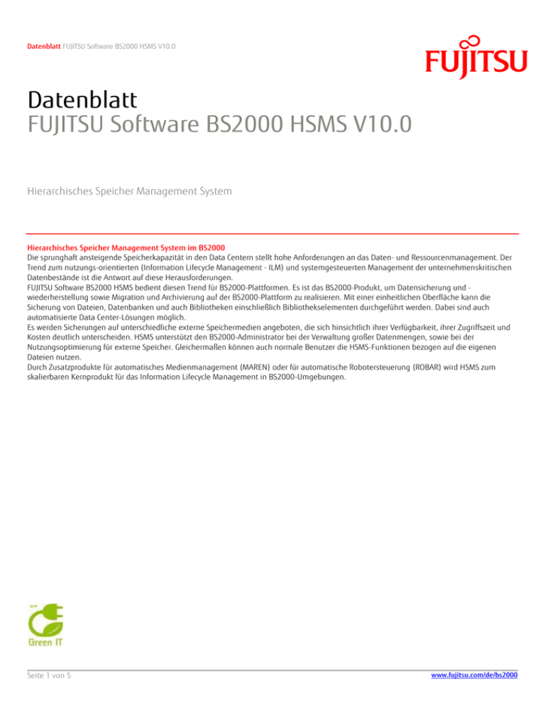 Datenblatt FUJITSU Software BS2000 HSMS V10.0 Datenblatt FUJITSU Software BS2000 HSMS V10.0 Hierarchisches Speicher Management System Hierarchisches Speicher Management System im BS2000 Die sprunghaft ansteigende Speicherkapazität in den Data Centern stellt hohe Anforderungen an das Daten- und Ressourcenmanagement. Der Trend zum nutzungs-orientierten (Information Lifecycle Management - ILM) und systemgesteuerten Management der unternehmenskritischen Datenbestände ist die Antwort auf diese Herausforderungen. FUJITSU Software BS2000 HSMS bedient diesen Trend für BS2000-Plattformen. Es ist das BS2000-Produkt, um Datensicherung und wiederherstellung sowie Migration und Archivierung auf der BS2000-Plattform zu realisieren. Mit einer einheitlichen Oberfläche kann die Sicherung von Dateien, Datenbanken und auch Bibliotheken einschließlich Bibliothekselementen durchgeführt werden. Dabei sind auch automatisierte Data Center-Lösungen möglich. Es werden Sicherungen auf unterschiedliche externe Speichermedien angeboten, die sich hinsichtlich ihrer Verfügbarkeit, ihrer Zugriffszeit und Kosten deutlich unterscheiden. HSMS unterstützt den BS2000-Administrator bei der Verwaltung großer Datenmengen, sowie bei der Nutzungsoptimierung für externe Speicher. Gleichermaßen können auch normale Benutzer die HSMS-Funktionen bezogen auf die eigenen Dateien nutzen. Durch Zusatzprodukte für automatisches Medienmanagement (MAREN) oder für automatische Robotersteuerung (ROBAR) wird HSMS zum skalierbaren Kernprodukt für das Information Lifecycle Management in BS2000-Umgebungen. Seite 1 von 5 www.fujitsu.com/de/bs2000 Datenblatt FUJITSU Software BS2000 HSMS V10.0 Themen Grundfunktionen Datensicherung Unter Datensicherung versteht man das vorbeugende Erstellen und Mitführen von Kopien des Datenbestandes zur Wiederherstellung dieser Daten bei Verlust, sei es auf Grund von Bedienfehlern (z.B. versehentliches Löschen) oder wegen Hardwareausfalls. Langzeit-Archivierung Archivierung ist die langfristige Auslagerung von Dateien und Jobvariablen, die online auf der Verarbeitungsebene nicht mehr benötigt werden. Langzeitarchivierung dient auch der Dokumentation, z.B. wenn Daten wegen rechtlicher Vorschriften über bestimmte Zeiträume hinweg aufbewahrt werden müssen. Die archivierten Daten werden, getrennt von den gesicherten Daten, in eigenen Archiven verwaltet. Verdrängung Mit der Verdrängung bietet HSMS einen Mechanismus, der für eine bessere Ausnutzung der Plattenspeicher sorgt: während des laufenden Betriebes werden Daten, die seit längerer Zeit nicht mehr benötigt wurden, von der Verarbeitungsebene auf eine Hintergrundebene umgeschichtet. Die Verdrängung lässt sich beim Erreichen von Sättigungszuständen auch automatisch anstarten. Verdrängung ist nur für BS2000-Dateien auf öffentlichen Datenträgern möglich. Datentransfer Mit HSMS können Dateien, Jobvariablen und Katalogeinträge (von Dateien auf privaten Datenträgern) auf andere BS2000-Systeme oder auf andere Benutzerkennungen übertragen werden. Sicherungsarten Voll- und Differenzsicherung Bei einer Vollsicherung werden alle angegebenen Dateien in vollem Umfang gesichert, unabhängig davon, ob sie sich seit der letzten Sicherung geändert haben oder nicht. Bei einer Differenzsicherung werden nur Dateien gesichert, deren Inhalt sich seit der letzten Sicherung geändert hat oder die neu angelegt wurden. Dadurch werden der Zeitaufwand und der Speicherplatzbedarf für eine Systemsicherung erheblich vermindert. Teilsicherung Bei einer Differenzsicherung lässt sich der Sicherungsaufwand durch eine Teilsicherung (Partielle Sicherung) weiter verringern. Es werden nur diejenigen Teile einer Datei gesichert, die sich seit der letzten Vollsicherung geändert haben. Concurrent Copy Mit der BS2000-Funktion Concurrent Copy (CCOPY) wird das Backup einer Datenbasis parallel zur Verarbeitung realisiert. Dies bewirkt eine Seite 2 von 5 erhebliche Verbesserung der Verfügbarkeit. Nur für die Initialisierung der Sicherung müssen die betroffenen Anwendungen gestoppt werden. Unterstützte Dateisysteme Mit HSMS können Dateien des BS2000-Betriebssystems einschließlich Dateien auf Net-Storage bearbeitet werden. Zusätzlich ist das Sichern, Restaurieren und Archivieren von Dateien eines UNIX-Dateisystems (UFS) möglich. Diese Dateien können im lokalen BS2000-UFS liegen oder auf einem remote Knoten im NFS-Netzwerk. Spezielle Funktionen Produktvarianten HSMS kann flexibel an unterschiedliche Data Center-Strukturen angepasst werden. Neben HSMS läuft aber auch parallel – bei Bedarf wie bisher ARCHIVE. Dadurch wird ein gleitender Übergang von ARCHIVE auf HSMS bezüglich der Sicherungsfunktionen ermöglicht. Eine EXPORT/IMPORT-Funktion erlaubt den Datenaustausch von Bändern/Kassetten zwischen BS2000-Installationen. Die Funktion ist kompatibel mit der entsprechenden ARCHIVE-Funktion, d.h. es können mittels HSMS auch ARCHIVE-Bänder exportiert oder importiert werden. System Managed Storage HSMS ist wesentlicher Bestandteil des System Managed Storage Konzepts (SMS). SMS bezeichnet ein Konzept für Datenmanagement durch das System. Ziel ist die Vereinfachung der Datenverwaltungsmaßnahmen sowohl für den Systemadministrator als auch für den Endbenutzer. Wichtiger Bestandteil im System Managed Storage Konzept ist das Produkt HSMS zur Verwaltung der Speicherebenen. Flexibilisierung des Ablageortes von Sicherungsdateien Die bisherige Philosophie in HSMS lautete, je seltener auf eine Datei zugegriffen wird, desto „entfernter“ ist der Ablageort. Dieser starre Ansatz wird mit HSMS V10.0 aufgeweicht, um unabhängiger vom Ablageort zu werden. Von Bedeutung für die Sicherung von Daten mittels HSMS ist eigentlich nur, welches System auf die Daten Zugriff haben soll, welche Performance erforderlich ist und welche Kapazität verfügbar ist. Um eine einfache Verlagerung auf andere Medien zu ermöglichen, ist die Sicherungsdatei weitgehend transparent vom Ablageort