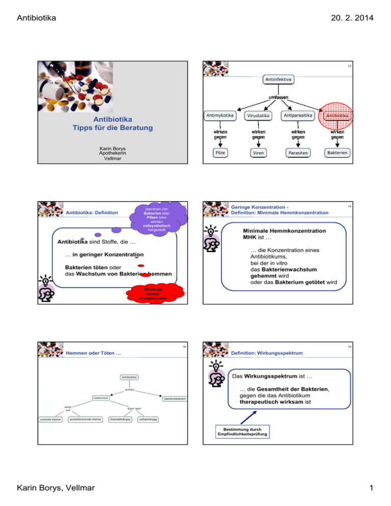Antibiotika 20. 2. 2014 12 Antibiotika Tipps für die Beratung Karin Borys Apothekerin Vellmar 13 Antibiotika: Definition stammen stammenvon von Bakterien Bakterienoder oder Pilzen Pilzenoder oder werden werden vollsynthetisch vollsynthetisch hergestellt hergestellt Geringe Konzentration Definition: Minimale Hemmkonzentration 14 Minimale Hemmkonzentration MHK ist … Antibiotika sind Stoffe, die … … die Konzentration eines Antibiotikums, bei der in vitro das Bakterienwachstum gehemmt wird oder das Bakterium getötet wird … in geringer Konzentration Bakterien töten oder das Wachstum von Bakterien hemmen Minimale Minimale HemmHemmkonzentration konzentration 18 Hemmen oder Töten … 19 Definition: Wirkungsspektrum Das Wirkungsspektrum ist … … die Gesamtheit der Bakterien, gegen die das Antibiotikum therapeutisch wirksam ist Bestimmung durch Empfindlichkeitsprüfung Karin Borys, Vellmar 1 Antibiotika 20. 2. 2014 20 Wirkmechanismen 21 Resistenz: Definition Resistenz liegt vor, wenn die MHK höher liegt als die höchste nicht toxische in vivo erreichbare Konzentration erworben (sekundär) natürlich (primär) schnell 22 Resistenzen: Mechanismen langsam Resistenzen vermeiden … Therapierichtlinien 23 So wenig wie möglich, so oft wie notwendig Enzyme, die Antibiotikum inaktivieren Nur bei bakteriellen Infektionen Zellpermeabilität ist verändert Erstellung von Antibiogramm oder kalkulierte Therapie Ausschleusen des Antibiotikums aus der Zelle Bindefähigkeit an Zielstruktur nimmt ab Ausreichende Dosierung Ausreichende Dauer der Therapie Richtige Einnahme 24 Begriffe … 25 Begriffe … Postantibiotischer Effekt Wirkung unterhalb MHK Kreuzresistenz Kreuzresistenz Bei miteinander verwandten Stoffen Bei miteinander verwandten Stoffen Multiresistenz Gegen unterschiedliche Stoffe Persistenz Multiresistenz Gegen unterschiedliche Stoffe Überleben trotz Empfindlichkeit Postantibiotischer Effekt Wirkung unterhalb MHK Persistenz Überleben trotz Empfindlichkeit Karin Borys, Vellmar 2 Antibiotika 20. 2. 2014 Antibiotikatherapie Nebenwirkungen allgemein 26 27 AAD-Diarrhöen Antibiotika-assoziierte Diarrhö (AAD) Superinfektionen Infektionen durch geschädigte Standortflora Direkte Wirkung auf Darm (prokinetisch) Vorkommen von AAD Cefixim 15 … 20 % Ampicillin 5 … 10 % Aminopenicilline plus Lactamasehemmer 10 … 25 % Diarrhöen: Ursache Toxische allergische Wirkung Erscheinung harmlos bis schwere Kolitiden Störung des Gleichgewichtes der Dickdarmflora 28 Clostridium difficile-AAD 29 Therapie der AAD Vorkommen Therapie fortsetzen … Bei 5 % der gesunden Bevölkerung Bei 20 … 40 % der Krankenhauspatienten Elektrolyte Probiotika Infektion mit CD … oder Abbruch Harmlos … lebensbedrohlich Allergie-Verdacht Schwere Form Therapie Kontraindikation in der Selbstmedikation Metronidazol Vancomycin Fidaxomicin (Dificlir®) Loperamid Racecadotril 30 Diarrhöen, Vorbeugung Probiotika Vorbeugung – Therapie 31 Vorbeugung bei Saccharomyces Patienten, die AAD hatten Risikopatienten Parallel zur Therapie, möglichst zeitversetzt … bis 2 Wochen nach Antibiotikatherapie Lactobacillus Karin Borys, Vellmar SSii nnnn vvoo llll ? ??? ?? Bifidobakterien durch Probiotika Zur Therapie eventuell höher dosieren 3 Antibiotika 20. 2. 2014 32 Antibiotikatherapie Wechselwirkungen allgemein Regeneration Vaginalflora Milchsäurebakterien 33 Wechselwirkungen Beginn 2 … 3 Tage nach Therapieende Mit Kontrazeptiva - Döderlein® - Vagiflor® - Symbiovag® - Durchfall - Enterohepatischer Kreislauf - Enzyminduktion - 7-Tage-Regel Alkohol Ansäuernde Präparate Während und nach der Therapie - Vaigsan® Milchsäure - Eubiolac® - Vagi C® 34 35 Antibiotikatherapie in der Schwangerschaft Einnahme Kontraindiziert während Schwangerschaft und Stillzeit Wann? Tetracycline Gyrasehemmer Metronidazol (nur in Frühschwangerschaft) Nüchtern Zum Essen Unabhängig vom Essen Einsatz möglich Womit? Penicilline Cephalosporine Erythromycin Großes Glas Wasser Womit nicht? … Sonst abwägen Dosierungsintervall Gute Informationsquelle: www.embryotox.de Wie lange? Alle 6 … 8 … 12 Stunden Richtwerte: 2 … 3 Tage nach Abklingen der Symptome Keine Besserung nach 3 … 4 Tagen: Arzt 36 β-Lactam-Antibiotika Wirkung Sir Alexander Fleming 37 Wirkmechanismus Eingriff in Zellwandsynthese PBP: Penicillin-bindende Proteine Alexander Fleming * 1881 Darvel, Schottland, UK † 1955 London Briefmarke der Färöer-Inseln von 1983 Wirkung Bakterizid auf proliferierende Keime Zeitabhängige Bakterizidie 1928: Entdeckung des Penicillins 1945: Nobelpreis für Physiologie und Medizin „für die Entdeckung des Penicillins und seiner heilenden Wirkung bei verschiedenen Infektionskrankheiten“ (Wikipedia 2014) Karin Borys, Vellmar 4 Antibiotika 20. 2. 2014 38 Resistenzen bedingt durch … 39 Penicilline β-Lactamase-Bildung Wirkstoffe Penicillinasen Cephalosporinasen Breitspektrum-β-Lactamasen Phenoxymethylpenicillin (Penicillin V) Amoxicillin Flucloxacillin - Gruppen- und Individualschutz Unempfindliches PBP Methicillinresistenter Staph. aureus Membranveränderungen (Brodt et al. 2013) 40 Penicilline: Nebenwirkungen 41 Penicillin-Allergie Allergie Gastrointestinale Beschwerden Schleimhautentzündungen Geschmacksveränderungen Mundtrockenheit Verlängerung der Blutungszeit Blutbildveränderungen Zahnverfärbungen Häufigkeit je nach Stoff: 1 … 10% Anaphylaktischer Schock sehr selten (< 0,01 %) Konsequenz Erhöhtes Risiko bei Atopikern 42 Penicilline: Wechselwirkungen Keine lokale Applikation Erhöhtes Risiko bei Allopurinol Phenoxymethylpenicillin – Penicillin V 43 Indikationen Antikoagulantien, Cumarin-Typ Methotrexat Acetylcystein - ist jedoch fraglich bei HNO-Infektionen, Angina, Scharlach, Erysipel, Zahninfektionen Präparate: Isocillin®, Arcasin®, Megacillin®, … Dosierung Ab12 Jahre: 1,5 … 6 Mio. I.E. in 3 ED 1 Stunde vor dem Essen alle 8 Stunden Kinder unter 12 Jahre: 50.000 … 100.000 I.E. pro kgKG in 3 ED Phenoxymethylpenicil