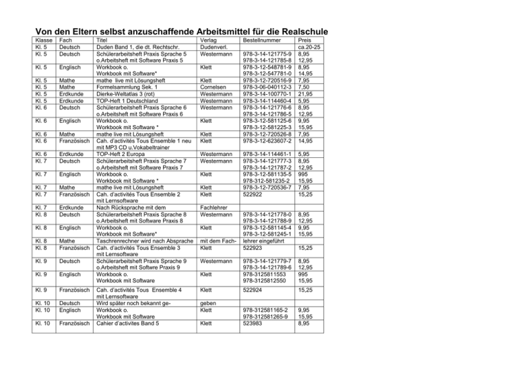 Von den Eltern selbst anzuschaffende Arbeitsmittel für die Realschule Klasse Kl. 5 Kl. 5 Fach Deutsch Deutsch Kl. 5 Englisch Kl. 5 Kl. 5 Kl. 5 Kl. 5 Kl. 6 Mathe Mathe Erdkunde Erdkunde Deutsch Kl. 6 Englisch Kl. 6 Kl. 6 Mathe Französisch Kl. 6 Kl. 7 Erdkunde Deutsch Kl. 7 Englisch Kl. 7 Kl. 7 Mathe Französisch Kl. 7 Kl. 8 Erdkunde Deutsch Kl. 8 Englisch Kl. 8 Kl. 8 Mathe Französisch Kl. 9 Deutsch Kl. 9 Englisch Kl. 9 Französisch Kl. 10 Kl. 10 Deutsch Englisch Kl. 10 Französisch Titel Duden Band 1, die dt. Rechtschr. Schülerarbeitsheft Praxis Sprache 5 o.Arbeitsheft mit Software Praxis 5 Workbook o. Workbook mit Software* mathe live mit Lösungsheft Formelsammlung Sek. 1 Dierke-Weltatlas 3 (rot) TOP-Heft 1 Deutschland Schülerarbeitsheft Praxis Sprache 6 o.Arbeitsheft mit Software Praxis 6 Workbook o. Workbook mit Software * mathe live mit Lösungsheft Cah. d’activités Tous Ensemble 1 neu mit MP3 CD u.Vokabeltrainer TOP-Heft 2 Europa Schülerarbeitsheft Praxis Sprache 7 o.Arbeitsheft mit Software Praxis 7 Workbook o. Workbook mit Software * mathe live mit Lösungsheft Cah. d’activités Tous Ensemble 2 mit Lernsoftware Nach Rücksprache mit dem Schülerarbeitsheft Praxis Sprache 8 o.Arbeitsheft mit Software Praxis 8 Workbook o. Workbook mit Software* Taschrenrechner wird nach Absprache Cah. d’activités Tous Ensemble 3 mit Lernsoftware Schülerarbeitsheft Praxis Sprache 9 o.Arbeitsheft mit Softwre Praxis 9 Workbook o. Workbook mit Software Verlag Dudenverl. Westermann Cah. d’activités Tous Ensemble 4 mit Lernsoftware Wird später noch bekannt geWorkbook o. Workbook mit Software Cahier d’activites Band 5 Klett Klett Klett Cornelsen Westermann Westermann Westermann Klett Klett Klett Westermann Westermann Klett Klett Klett Fachlehrer Westermann Klett mit dem FachKlett Westermann Klett geben Klett Klett Bestellnummer 978-3-14-121775-9 978-3-14-121785-8 978-3-12-548781-9 978-3-12-547781-0 978-3-12-720516-9 978-3-06-040112-3 978-3-14-100770-1 978-3-14-114460-4 978-3-14-121776-6 978-3-14-121786-5 978-3-12-581125-6 978-3-12-581225-3 978-3-12-720526-8 978-3-12-623607-2 Preis ca.20-25 8,95 12,95 8,95 14,95 7,95 7,50 21,95 5,95 8,95 12,95 9,95 15,95 7,95 14,95 978-3-14-114461-1 978-3-14-121777-3 978-3-14-121787-2 978-3-12-581135-5 978-312-581235-2 978-3-12-720536-7 522922 5,95 8,95 12,95 995 15,95 7,95 15,25 978-3-14-121778-0 978-3-14-121788-9 978-3-12-581145-4 978-3-12-581245-1 lehrer eingeführt 522923 8,95 12,95 9,95 15,95 978-3-14-121779-7 978-3-14-121789-6 978-3125811553 978-3125812550 8,95 12,95 995 15,95 522924 15,25 978-312581165-2 978-312581265-9 523983 9,95 15,95 8,95 15,25