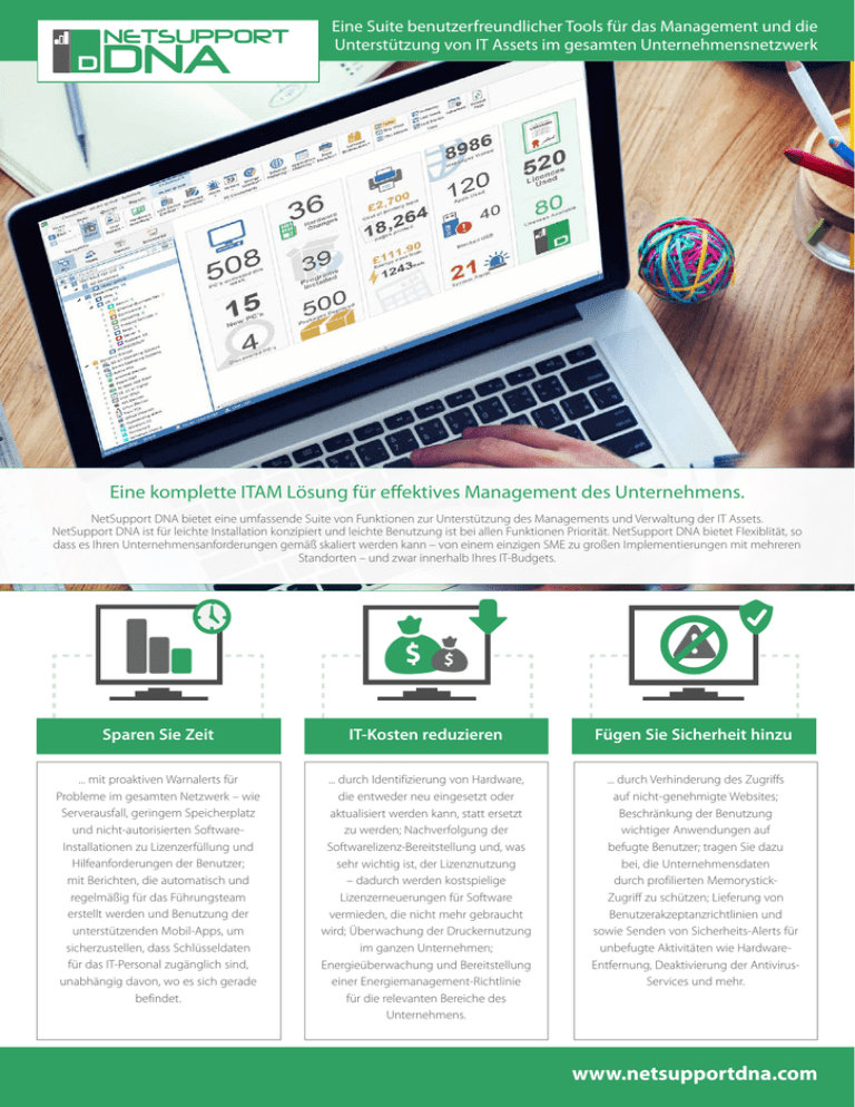 Eine Suite benutzerfreundlicher Tools für das Management und die Unterstützung von IT Assets im gesamten Unternehmensnetzwerk Eine komplette ITAM Lösung für effektives Management des Unternehmens. NetSupport DNA bietet eine umfassende Suite von Funktionen zur Unterstützung des Managements und Verwaltung der IT Assets. NetSupport DNA ist für leichte Installation konzipiert und leichte Benutzung ist bei allen Funktionen Priorität. NetSupport DNA bietet Flexiblität, so dass es Ihren Unternehmensanforderungen gemäß skaliert werden kann – von einem einzigen SME zu großen Implementierungen mit mehreren Standorten – und zwar innerhalb Ihres IT-Budgets. Sparen Sie Zeit IT-Kosten reduzieren Fügen Sie Sicherheit hinzu ... mit proaktiven Warnalerts für Probleme im gesamten Netzwerk – wie Serverausfall, geringem Speicherplatz und nicht-autorisierten SoftwareInstallationen zu Lizenzerfüllung und Hilfeanforderungen der Benutzer; mit Berichten, die automatisch und regelmäßig für das Führungsteam erstellt werden und Benutzung der unterstützenden Mobil-Apps, um sicherzustellen, dass Schlüsseldaten für das IT-Personal zugänglich sind, unabhängig davon, wo es sich gerade befindet. ... durch Identifizierung von Hardware, die entweder neu eingesetzt oder aktualisiert werden kann, statt ersetzt zu werden; Nachverfolgung der Softwarelizenz-Bereitstellung und, was sehr wichtig ist, der Lizenznutzung – dadurch werden kostspielige Lizenzerneuerungen für Software vermieden, die nicht mehr gebraucht wird; Überwachung der Druckernutzung im ganzen Unternehmen; Energieüberwachung und Bereitstellung einer Energiemanagement-Richtlinie für die relevanten Bereiche des Unternehmens. ... durch Verhinderung des Zugriffs auf nicht-genehmigte Websites; Beschränkung der Benutzung wichtiger Anwendungen auf befugte Benutzer; tragen Sie dazu bei, die Unternehmensdaten durch profilierten MemorystickZugriff zu schützen; Lieferung von Benutzerakzeptanzrichtlinien und sowie Senden von Sicherheits-Alerts für unbefugte Aktivitäten wie HardwareEntfernung, Deaktivierung der AntivirusServices und mehr. www.netsupportdna.com Software-Inventar und Lizenzierung Das Software-Modul ist dafür ausgelegt, Schulen beim Management der Lizenzeinhaltung zu helfen, SoftwareÜberschreitungen durch Meldung der installierten Software zu reduzieren und proaktiv PCs zu identifizieren, deren Software wenig oder gar nicht benutzt wird. Leichte Installation Nach der Installation des Servermoduls (das benutzt wird, um die DNA Datenbank zu verwalten und Informationen hinzuzufügen), erkennt und installiert das Bereitstellungstool automatisch den DNA Client auf den Ziel-Geräten. Die DNA Konsole (die vom IT-Techniker installiert wird) bietet volle DNA Systemsteuerung mit reichlichen Bildschirminformationen und EchtzeitBerichterstattung. Hardware-Inventar Das NetSupport DNA Softwarelizenz-Modul unterstützt das kontinuierliche Management aller Softwarelizenzen für alle Abteilungen und erfasst die Lieferanten, Einkaufsund Rechnungsdetails, Abteilungs- und Kostenstellenzuweisung und Nachverfolgung der Wartungsverträge. Anonymisiertes AnwendungsMetering Das anonymisierte Anwendungs-Metering Modul berichtet über alle Anwendungen, einschließlich der Zeiten, zu denen die Anwendungen geöffnet und geschlossen wurden, sowie die tatsächlichen Zeiten, in denen sie aktiv waren. Listen mit genehmigten und eingeschränkten Anwendungen zusammen mit den Zeiten, zu denen die Einschränkungen gelten, können zentral erstellt und durchgesetzt werden. Anwendungs-Metering ermöglicht es dem Unternehmen, die gegenwärtigen Lizenznutzungsraten für alle installierten Anwendungen zu überwachen und zu melden und sicherzustellen, dass die Anwendungsnutzung den Richtlinien des Unternehmens entspricht. NetSupport DNA bietet eines der umfassendsten und detailliertesten HardwareInventar- Module im gegenwärtigen Markt. Inventarberichte können entweder für einen einzelnen PC, eine gewählte Abteilung, für bedingungsbasierte „Dynamische Gruppen“ oder für das gesamte Unternehmen angezeigt werden. Hardware-Inventar-Aktualisierungen können dafür konfiguriert werden, zu verschiedenen Zeitintervallen im Laufe des Tages oder beim Einschalten zu laufen und können bei Bedarf auch sofort ausgeführt werden. Es steht eine eigenständige Inventarkomponente zur Verfügung, die auf Nicht-Netzwerkund Mobilgeräten eingesetzt werden kann. Zusätzlich können hochwertige Peripheriegeräte einem Gerät zugeordnet und erfasst werden. SNMP Geräteermittlung Die SNMP Ermittlungansicht ermöglicht es, NetSupport DNA dafür zu konfigurieren, eine Reihe von Netzwerkadressen zu scannen und alle geeigneten ermittelten Geräte zu melden, wie Drucker und Zugriffspunkte. Diese Posten können dann in DNA gespeichert werden, und die Echtzeitdaten (wie Tinte- oder Tonerstand) können von der Konsole aus überwacht werden. Unternehmens-Alerting NetSupport DNA bietet ein extrem leistungsstarkes Alerting-Modul, mit dem das System die Operatoren automatisch benachrichtigen kann, wenn verschiedene Änderungen irgendwo im Unternehmen auftreten. Alert-Benachrichtigungen können an vorgegebene Emailempfänger und/oder aktive Konsolenbenutzer geleitet werden (und zwar pro Alert, so dass die Art des Alerts entscheiden kann, welche Operatoren zu benachrichtigen sind). Außerdem werden ausstehende Alerts für die entsprechenden PCs in der HauptunternehmenshierarchieStrukturansicht identifiziert. Wenn Alerts identifiziert worden sind, kann ein Operator Notizen hinzufügen. Ein voller Verlauf aller Alerts steht über die Verlauf-Funktion zur Verfügung. Softwareverteilung NetSupport DNA bietet eine Mehrfachzustellungsoption für Softwareverteilung. Ein Softwareverteilungspaket wird erstellt, indem man entweder Parameter auf eine Sammlung von Dateien oder Ordnern anwendet oder den DNA App-Objekt-Manager benutzt, der die Eingabeaufforderungen, Tastaturanschläge und Mausklicks aufzeic
