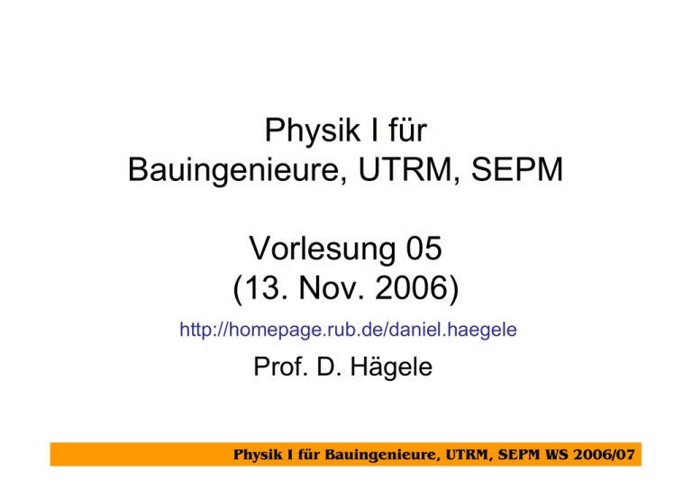 Physik I für Bauingenieure, UTRM, SEPM Vorlesung 05 (13. Nov. 2006) http://homepage.rub.de/daniel.haegele Prof. D. Hägele Physik I für Bauingenieure, UTRM, SEPM WS 2006/07 Inhalt • Bonuspunkte für UTRM, SEPM •Newtonsche Axiome • Elastische Verformung Physik I für Bauingenieure, UTRM, SEPM WS 2006/07 Bonuspunkt für Klausur 65 % Übungspunkte 50 % Übungspunkte => => Bonus 10 % Klausurpunkte Bonus 5 % Klausurpunkte Klausur ist bestanden bei 50% der erreichbaren Klausurpunkte. Physik I für Bauingenieure, UTRM, SEPM WS 2006/07 1.5 Dynamik der geradlinigen Bewegung Bisher: Bewegung nur beschrieben. Jetzt: Ursache der Bewegung. Anstoßen: Gleichförmige Bewegung oder Stillstand. Physik I für Bauingenieure, UTRM, SEPM WS 2006/07 1. Newtonsches Axiom Ohne äußere Kraft bleibt ein Körper in Ruhe oder bewegt sich geradlinig mit v = konst. (Trägheitsprinzip) Physik I für Bauingenieure, UTRM, SEPM WS 2006/07 Was ist Kraft? z.B. Gewichtskraft ist die Anziehung von Masse durch die Erde. Physik I für Bauingenieure, UTRM, SEPM WS 2006/07 Messen von Kraft F Federwaage, Einheit ist [F] = kg m s-2 = N (Newton) Physik I für Bauingenieure, UTRM, SEPM WS 2006/07 Zusammenhang von Kraft, Beschleunigung und Masse Physik I für Bauingenieure, UTRM, SEPM WS 2006/07 Beschleunigung von Massen Versuch: Beschleunigung von unterschiedlich schweren Massen. Auswertung ergibt: agrün = 2 aschwarz arot = 1/2 aschwarz Physik I für Bauingenieure, UTRM, SEPM WS 2006/07 Zusammenhang von Kraft, Beschleunigung und Masse a proportional zu proportional zu => a = F/m F 1/m 2. Newtonsches Axiom F = ma Einheit: [F] = kg m s-2 = N (Newton) Physik I für Bauingenieure, UTRM, SEPM WS 2006/07 Spezialfall von F = ma: Gewichtskraft FG FG = m g g: Erdbeschleunigung => Massenbestimmung durch Gewichtsbestimmung Physik I für Bauingenieure, UTRM, SEPM WS 2006/07 Richtung von Kräften Gesamtkraft erhält man durch Vektoraddition So genanntes „Kräfteparallelogramm“ Physik I für Bauingenieure, UTRM, SEPM WS 2006/07 Spezialfall: Körper bleibt in Ruhe, wenn Physik I für Bauingenieure, UTRM, SEPM WS 2006/07 Aufteilung von Kräften Wiederum „Kräfteparallelogramm“ Die Summe der Beträge von F2 und F3 ist größer als der Betrag von F1. Physik I für Bauingenieure, UTRM, SEPM WS 2006/07 Versuch: Kraft und Gegenkraft Experimentell: Bei m1 = m2 => v1 = - v2, d.h. F1 = - F2 (Betrag der Kräfte ist gleich) Bei m1 ∫ m2 => m1 v1 = - m2 v2 => m1 v1 + m2 v2 = 0 (Impulserhaltung) Physik I für Bauingenieure, UTRM, SEPM WS 2006/07 Kraft bewirkt Gegenkraft 3. Newtonsches Axiom actio = reactio Impulserhaltung Physik I für Bauingenieure, UTRM, SEPM WS 2006/07 Anwendung und Präzisierung der Newtonschen Axiome 1.5.1 Elastische Verformung (Feder) Linearer Zusammenhang F = D*s (Hooksches Gesetz) Federkonstante D. D spezifisch für jede Feder. D = F/s. harte Feder => kleines s => großes D. Physik I für Bauingenieure, UTRM, SEPM WS 2006/07 Federkraft in 1. Newtonsches Axion Gewicht in Ruhe => 1. Newtonsches Axiom FF = - FG Federkraft ist Gegenkraft zur Gewichtskraft. Physik I für Bauingenieure, UTRM, SEPM WS 2006/07 Anordnungen von zwei Federn Parallelschaltung: Federkraft verstärkt sich! Physik I für Bauingenieure, UTRM, SEPM WS 2006/07 Anordnungen von zwei Federn Reihenschaltung: Federkraft wird kleiner ! Physik I für Bauingenieure, UTRM, SEPM WS 2006/07