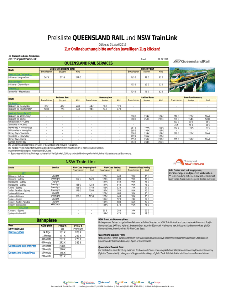 Preisliste QUEENSLAND RAIL und NSW TrainLink Gültig ab 01. April 2017 Zur Onlinebuchung bitte auf den jeweiligen Zug klicken! <> Preis gilt in beide Richtungen alle Preise pro Person in EUR Stand: 19.04.2017 QUEENSLAND RAIL SERVICES Single/Twin Sleeping Berth Erwachsener Student Kind Route Erwachsener Economy Seat Student Kind Erwachsener Railbed Fares Student Kind Erwachsener - - - - - - - - - - - - - - - Spirit of The Outback** Westlander** Inlander** Route Erwachsener Business Seat Student Kind Erwachsener Economy Seat Student Kind Tilt Train** Brisbane <> Hervey Bay Brisbane <> Rockhampton - Spirit of Queensland** Brisbane <> Whitsundays Brisbane <> Cairns Whitsundays <> Cairns Townsville <> Cairns Hervey Bay > Whitsundays Whitsundays > Hervey Bay Hervey Bay > Townsville Townsville > Hervey Bay Hervey Bay > Cairns Cairns > Hervey Bay Die Single/Twin Sleeper Preise im Spirit of the Outback sind inklusive Mahlzeiten. Die Railbed Preise im Spirit of Queensland sind inklusive Mahlzeiten (Anzahl variiert je nach gebuchter Strecke). Studentenermäßigung nur mit gültiger ISIC Karte. ** Sparpreise erhältlich auf Anfrage: vorbehaltlich Verfügbarkeit, Zahlung sofort bei Buchung erforderlich, keine Rückerstattung bei Stornierung. Premium Economy Student Kind NSW Train Link Route Service First Class Sleeping Berth Erwachsener Kind XPT Daylight Overnight Daylight Overnight Overnight Overnight Daylight Overnight Daylight Daylight XPT/Coach - - - - - - - - - - First Class Seating Erwachsener Kind Economy Class Seating Erwachsener Kind Veränderungen sind jederzeit vorbehalten. ** in Verbindung mit einem Erwachsenenticket zum vollen Preis zahlen eigene Kinder nur $1 je XPLORER Bahnpässe Pass NSW TrainLink Discovery Pass Queensland Explorer Pass Queensland Coastal Pass Gültigkeit Eco 14 Tage 1 Monat 3 Monate 6 Monate 1 Monate 2 Monate 1 Monate 2 Monate Premium NSW TrainLink Discovery Pass Unbegrenztes Fahren im gebuchten Zeitraum auf allen Strecken im NSW TrainLink rail and coach network (Bahn und Bus) in Economy Class. (XPT und Xplorer). Dazu gehören auch die Züge nach Melbourne bzw. Brisbane. Der Economy Pass gilt für Economy Seats, Premium Pass für First Class Seats. Queensland Explorer Pass: Unbegrenztes Fahren auf allen Strecken von Queensland Rail (inklusive bestimmten Busanschlüssen) auf Sitzplätzen in Economy oder Premium Economy (Spirit of Queensland). Queensland Coastal Pass: Für die Fahrt in einer Richtung zwischen Brisbane und Cairns oder umgekehrt auf Sitzplätzen in Economy Premium Economy (Spirit of Queensland). Unbegrenzte Stopps auf dem Weg möglich. Zusätzlich beinhaltet sind bestimmte Busanschlüsse. hm touristik GmbH Co. KG | Lindberghstraße 13, 82178 Puchheim | Tel.: +49 (0) 89 339 8087-700 | E-Mail: info@hm-touristik.com Fahrplan QUEENSLAND RAIL SERVICES Route Zug Spirit of Queensland So Mo Di Mi Fr Sa Brisbane nach Airlie Beach Mo Di Mi Fr Sa 1545 0642+1 Proserpine* Brisbane nach Townsville Brisbane nach Cairns Townsville nach Cairns Cairns nach Brisbane Cairns nach Townsville Airlie Beach nach Cairns Cairns nach Airlie Beach Hervey Bay (Transit Centre) nach Cairns Hervey Bay (Transit Centre) nach Cairns Cairns nach Maryborough West Mo Mo Di Di Di Mi Mi Mi Mi Mi Mi Mi Mi Fr Fr Sa Sa Sa Fr 1545 1545 912 900 900 435 900 1820 1755 900 0902+1 1605+1 1605 0920+1 1509 1605 1905 1605+1 1605+1 0502+1 Proserpine* Proserpine* Maryborough West* Maryborough West* ^^ Fr 1820 0902+1 Maryborough West* So So So So So Mo Mo Di Mo Mo Di Do Do Do Do Do Do Fr Fr Sa Fr Fr Sa So Hervey Bay (Transit Centre) nach Townsville Mo Mo Mi Di Do Mi Hervey Bay (Transit Centre) nach Townsville Townsville nach Maryborough West Hervey Bay (Transit Centre) nach Airlie Beach Hervey Bay (Transit Centre) nach Airlie Beach Airlie Beach nach Maryborough West Tilt Train Sa So Mo Mo Brisbane nach Hervey Bay (Transit Centre) Brisbane nach Hervey Bay (Transit Centre) 1 Brisbane nach Hervey Bay (Transit Centre) Mo So Mi Di So Mo Mo So Di Mi Di Mi Do Do 0902+1 Maryborough West* 1519 0502+1 Fr 1820 0642+1 1755 0642+1 1720 0502+1 ^^ Maryborough West* Proserpine * Maryborough West* Proserpine * Proserpine*, ^^ 1100 1710 Maryborough West* Fr 1620 2215 Maryborough West* Fr 1100 1545 Maryborough West* 1655 2125 Maryborough West* Sa Sa 1100 710 730 1845 / 2125 1455 1750 Sa Hervey Bay (Transit Centre) nach Brisbane 1 So 1 Di Fr Mi 945 1455 Maryborough West* Fr 448 950 Maryborough West* Fr 1125 1745 Maryborough West* 505 1140 Maryborough West* 1810 1915+1 1355 1000 1535+1 1200+1 1915 1145+1 1815 1125+1 1240 0935+1 1330 1010+1 Do Sa Di Brisbane nach Longreach Longreach nach Brisbane Sa Mo Brisbane nach Charleville Do Di Charleville nach Brisbane Townsville nach Mt Isa Sa Fr Mo Brisbane nach Longreach Fr Do Di Do Mi Fr So Mt Isa nach Townsville Do Mo Umsteigen 1755 Do Mo Hervey Bay (Transit Centre) nach Brisbane 1 2 3 Mi Mo Hervey Bay (Transit Centre) nach Brisbane The Inlander Do Ankunft Fr Do Di So Brisbane nach Rockhampton ² Rockhampton nach Brisbane Rockhampton nach Brisbane ³ The Westlander Mi Mo Brisbane nach Hervey Bay (Transit Centre) Spirit of The Outback Di Do Sa So 1 Hervey Bay (Transit Centre) nach Brisbane Mi Abfahrt Fr traditioneller Ersatzzug mit Dieselantrieb (längere Fahrzeiten, nicht geeignet für Rollstuhlfahrer, Bordbistro anstelle von Trolleyservice, keine 1. Klasse verfügbar) Mo, Do, Sa traditioneller Ersatzzug mit Dieselantrieb (längere Fahrzeiten, nicht geeignet für Rollstuhlfahrer, Bordbistro anstelle von Trolleyservice, keine 1. Klasse verfügbar) Di, Mi, Fr, So traditioneller Ersatzzug mit Dieselantrieb (längere Fahrzeiten, nicht geeignet für Rollstuhlfahrer, Bordbistro anstelle von Trolleyservice, keine 1. Klasse verfügbar) * Teile der Reise sind Busverbindungen ^^ Transfer mit Bus von Maryborough West nach Hervey Bay auf eigene Kosten NSW TRAIN LINK Zug XPT XPLORER Strecke Brisbane nach Sydney (Daylight) ** Brisbane nach Sydney (Overnight) ** Melbourne nach Sydney (Daylight) Melbo