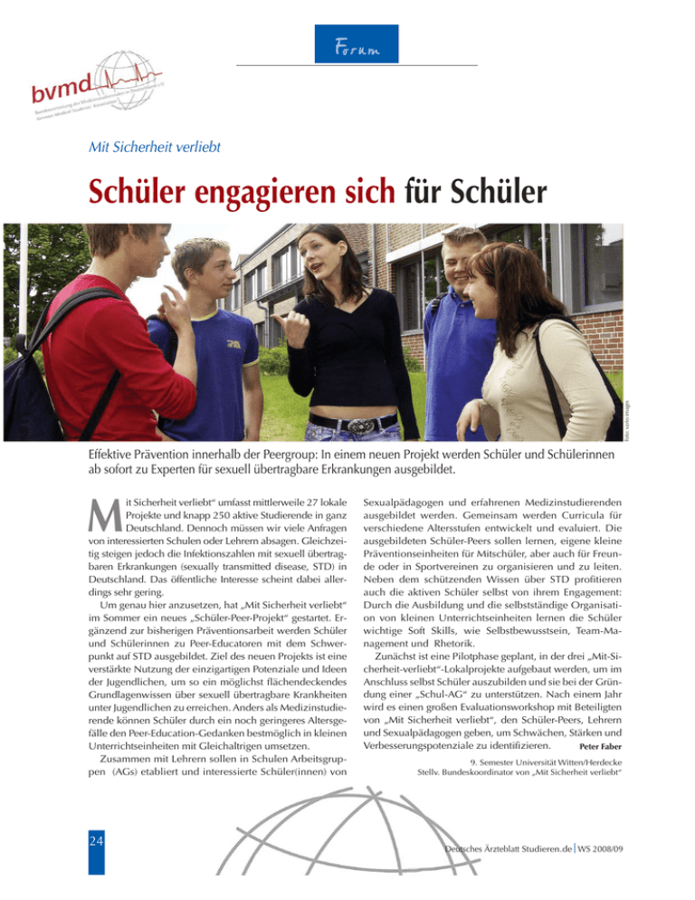 Fo r u m Mit Sicherheit verliebt Foto: vario images Schüler engagieren sich für Schüler Effektive Prävention innerhalb der Peergroup: In einem neuen Projekt werden Schüler und Schülerinnen ab sofort zu Experten für sexuell übertragbare Erkrankungen ausgebildet. M it Sicherheit verliebt“ umfasst mittlerweile 27 lokale Projekte und knapp 250 aktive Studierende in ganz Deutschland. Dennoch müssen wir viele Anfragen von interessierten Schulen oder Lehrern absagen. Gleichzeitig steigen jedoch die Infektionszahlen mit sexuell übertragbaren Erkrankungen (sexually transmitted disease, STD) in Deutschland. Das öffentliche Interesse scheint dabei allerdings sehr gering. Um genau hier anzusetzen, hat „Mit Sicherheit verliebt“ im Sommer ein neues „Schüler-Peer-Projekt“ gestartet. Ergänzend zur bisherigen Präventionsarbeit werden Schüler und Schülerinnen zu Peer-Educatoren mit dem Schwerpunkt auf STD ausgebildet. Ziel des neuen Projekts ist eine verstärkte Nutzung der einzigartigen Potenziale und Ideen der Jugendlichen, um so ein möglichst flächendeckendes Grundlagenwissen über sexuell übertragbare Krankheiten unter Jugendlichen zu erreichen. Anders als Medizinstudierende können Schüler durch ein noch geringeres Altersgefälle den Peer-Education-Gedanken bestmöglich in kleinen Unterrichtseinheiten mit Gleichaltrigen umsetzen. Zusammen mit Lehrern sollen in Schulen Arbeitsgruppen (AGs) etabliert und interessierte Schüler(innen) von 24 Sexualpädagogen und erfahrenen Medizinstudierenden ausgebildet werden. Gemeinsam werden Curricula für verschiedene Altersstufen entwickelt und evaluiert. Die ausgebildeten Schüler-Peers sollen lernen, eigene kleine Präventionseinheiten für Mitschüler, aber auch für Freunde oder in Sportvereinen zu organisieren und zu leiten. Neben dem schützenden Wissen über STD profitieren auch die aktiven Schüler selbst von ihrem Engagement: Durch die Ausbildung und die selbstständige Organisation von kleinen Unterrichtseinheiten lernen die Schüler wichtige Soft Skills, wie Selbstbewusstsein, Team-Management und Rhetorik. Zunächst ist eine Pilotphase geplant, in der drei „Mit-Sicherheit-verliebt“-Lokalprojekte aufgebaut werden, um im Anschluss selbst Schüler auszubilden und sie bei der Gründung einer „Schul-AG“ zu unterstützen. Nach einem Jahr wird es einen großen Evaluationsworkshop mit Beteiligten von „Mit Sicherheit verliebt“, den Schüler-Peers, Lehrern und Sexualpädagogen geben, um Schwächen, Stärken und Verbesserungspotenziale zu identifizieren. Peter Faber 9. Semester Universität Witten/Herdecke Stellv. Bundeskoordinator von „Mit Sicherheit verliebt“ ⏐ WS 2008/09 Deutsches Ärzteblatt Studieren.de⏐
