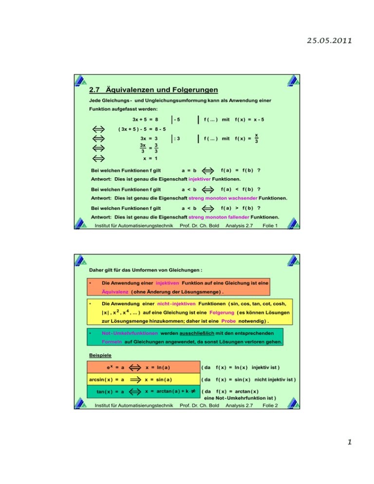 25.05.2011 2.7 Äquivalenzen und Folgerungen Jede Gleichungs - und Ungleichungsumformung kann als Anwendung einer Funktion aufgefasst werden: 3x + 5 = 8 -5 f ( ... ) mit f ( x) = x - 5 :3 f ( ... ) mit f ( x) = ( 3x + 5 ) - 5 = 8 - 5 3x = 3 3x 3 = 3 3 x 3 x = 1 Bei welchen Funktionen f gilt f( a) = f ( b) ? a = b Antwort: Dies ist genau die Eigenschaft injektiver Funktionen. Bei welchen Funktionen f gilt f( a) < f ( b) ? a < b Antwort: Dies ist genau die Eigenschaft streng monoton wachsender Funktionen. Bei welchen Funktionen f gilt f( a) > f ( b) ? a < b Antwort: Dies ist genau die Eigenschaft streng monoton fallender Funktionen. Institut für Automatisierungstechnik Prof. Dr. Ch. Bold Analysis 2.7 Folie 1 Daher gilt für das Umformen von Gleichungen : • Die Anwendung einer injektiven Funktion auf eine Gleichung ist eine Äquivalenz ( ohne Änderung der Lösungsmenge) . • Die Anwendung einer nicht - injektiven Funktionen ( sin, cos, tan, cot, cosh, | x | , x 2 , x 4 , ... ) auf eine Gleichung ist eine Folgerung ( es können Lösungen zur Lösungsmenge hinzukommen; daher ist eine Probe notwendig) . • Not - Umkehrfunktionen werden ausschließlich mit den entsprechenden Formeln auf Gleichungen angewendet, da sonst Lösungen verloren gehen. Beispiele ex = a arcsin ( x ) = a tan ( x ) = a x = ln ( a ) ( da f ( x ) = ln ( x ) injektiv ist ) x = sin ( a ) ( da f ( x ) = sin ( x ) nicht injektiv ist ) x = arctan ( a ) + k . π Institut für Automatisierungstechnik ( da f ( x) = arctan ( x ) eine Not - Umkehrfunktion ist ) Prof. Dr. Ch. Bold Analysis 2.7 Folie 2 1 25.05.2011 Übersicht über alle Formeln zum Umformen einer Gleichung mit Not - Umkehrfunktionen cosh ( x ) = a x = + arcosh ( a ) x = arcsin ( a ) + k . 2π sin ( x ) = a x = π - arcsin ( a ) + k . 2π cos ( x ) = a x = + tan ( x ) = a x = arctan ( a ) + k . π cot ( x ) = a x = arccot ( a ) + k . π |x| = a x = + x2 = a x = + x4 = a x = + arccos ( a ) + k . 2π a a 4 a Institut für Automatisierungstechnik Prof. Dr. Ch. Bold Analysis 2.7 Folie 3 Für das Umformen von Ungleichungen gilt: • Die Anwendung einer monoton wachsenden Funktion auf eine Ungleichung ist eine Äquivalenz ; das Relationszeichen bleibt unverändert. Beispiel: - 3x + 5 > 8 -5 Anwendung der streng monoton - 3x > 3 • wachsenden Funktion f ( x ) = x - 5 Die Anwendung einer monoton fallenden Funktion auf eine Ungleichung ist ebenfalls eine Äquivalenz ; das Relationszeichen wird umgedreht. Beispiel: - 3x > 3 : (- 3) x < -1 • Anwendung der streng monoton x fallenden Funktion f ( x ) = -3 Nicht monotone Funktionen dürfen nicht auf Ungleichungen angewandt werden ! Beispiel: 5 > -3 x Kehrwertbildung ist verboten, da die 1 Funktion f ( x) = x Institut für Automatisierungstechnik Prof. Dr. Ch. Bold nicht monoton ist. Analysis 2.7 Folie 4 2 25.05.2011 Bemerkung Ob eine Funktion injektiv bzw. monoton ist, hängt ggf. vom Definitionsbereich ab. So ist z.B. f ( x ) = x 2 • nicht injektiv und nicht monoton über R • injektiv und streng monoton fallend für x < 0 • injektiv und streng monoton wachsend für x > 0 Daher gilt: ( ... ) 2 1.) |x - 1| > x 2.) - |x - 1| > > x R+ >0 >0 (| x - 1 |) 2 ( ... ) 2 x - x+1 R- <0 <0 (- | x - 1 |) 2 < ( x - x+1 ) 2 ( ... ) 2 3.) x- 2 < ? x Diese Ungleichung darf allgemein nicht quadriert werden ! Um sie zu lösen, ist daher eine Fallunterscheidung notwendig. < 0 oder > 0 ? Institut für Automatisierungstechnik x- 2 < 1. Fall: D = R x x < 2 , also D1 = x- 2 < <0 x >0 Prof. Dr. Ch. Bold Analysis 2.7 Folie 5 >0 0;2 wegen D = R >0 Die linke Seite der Ungleichung ist also negativ und die rechte Seite ist positiv ( Quadrieren verboten ! ) . Die Ungleichung ist daher für alle x ε D1 erfüllt : L1 = D1 = 2. Fall: x >2 x- 2 < >0 , also D2 = R x 0;2 . >2 R+ N.R.: (x - 2)2 < x x=1 x2 - 5x + 4 < 0 >0 Ergebnis: L = >2 x=4 y f ( x ) = x2 - 5x + 4 1<x<4 Wegen D2 = R x2- 5x + 4 = 0 1 gilt daher L2 = 2;4 1 0;4 Institut für Automatisierungstechnik . Prof. Dr. Ch. Bold Analysis 2.7 4 x Folie 6 3