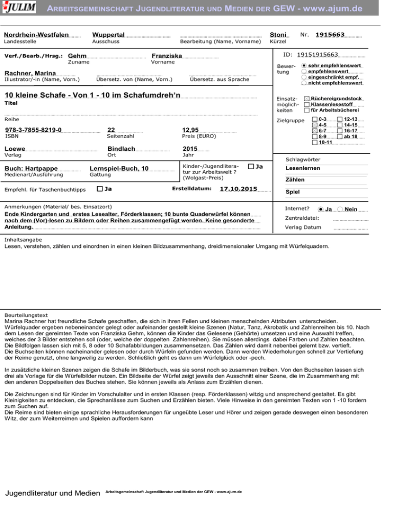 ARBEITSGEMEINSCHAFT JUGENDLITERATUR UND MEDIEN DER GEW - www.ajum.de Nordrhein-Westfalen Wuppertal Landesstelle Ausschuss Verf./Bearb./Hrsg.: Stoni Bearbeitung (Name, Vorname) Gehm Franziska Zuname Vorname Nr. 1915663 Kürzel ID: 19151915663 Bewertung sehr empfehlenswert empfehlenswert eingeschränkt empf. nicht empfehlenswert Titel Einsatzmöglichkeiten Büchereigrundstock Klassenlesestoff für Arbeitsbücherei Reihe Zielgruppe Rachner, Marina Illustrator/-in (Name, Vorn.) Übersetz. von (Name, Vorn.) Übersetz. aus Sprache 10 kleine Schafe - Von 1 - 10 im Schafumdreh’n 978-3-7855-8219-0 22 12,95 ISBN Seitenzahl Preis (EURO) Loewe Bindlach 2015 Verlag Ort Jahr 0-3 4-5 6-7 8-9 10-11 12-13 14-15 16-17 ab 18 Schlagwörter Buch: Hartpappe Medienart/Ausführung Lernspiel-Buch, 10 Gattung Bilderwürfel Empfehl. für Taschenbuchtipps Ja Kinder-/Jugendliteratur zur Arbeitswelt ? (Wolgast-Preis) Erstelldatum: Ja 17.10.2015 Anmerkungen (Material/ bes. Einsatzort) Ende Kindergarten und erstes Lesealter, Förderklassen; 10 bunte Quaderwürfel können nach dem (Vor)-lesen zu Bildern oder Reihen zusammengefügt werden. Keine gesonderte Anleitung. Lesenlernen Zählen Spiel Internet? Ja Nein Zentraldatei: Verlag Datum Inhaltsangabe Lesen, verstehen, zählen und einordnen in einen kleinen Bildzusammenhang, dreidimensionaler Umgang mit Würfelquadern. Beurteilungstext Marina Rachner hat freundliche Schafe geschaffen, die sich in ihren Fellen und kleinen menschelnden Attributen unterscheiden. Würfelquader ergeben nebeneinander gelegt oder aufeinander gestellt kleine Szenen (Natur, Tanz, Akrobatik und Zahlenreihen bis 10. Nach dem Lesen der gereimten Texte von Franziska Gehm, können die Kinder das Gelesene (Gehörte) umsetzen und eine Auswahl treffen, welches der 3 Bilder entstehen soll (oder, welche der doppelten Zahlenreihen). Sie müssen allerdings dabei Farben und Zahlen beachten. Die Bildfolgen lassen sich mit 5, 8 oder 10 Schafabbildungen zusammensetzen. Das Zählen wird damit nebenbei gelernt bzw. vertieft. Die Buchseiten können nacheinander gelesen oder durch Würfeln gefunden werden. Dann werden Wiederholungen schnell zur Vertiefung der Reime genutzt, ohne langweilig zu werden. Schließlich geht es dann um Würfelglück oder -pech. In zusätzliche kleinen Szenen zeigen die Schafe im Bilderbuch, was sie sonst noch so zusammen treiben. Von den Buchseiten lassen sich drei als Vorlage für die Würfelbilder nutzen. Ein Bildseite der Würfel zeigt jeweils den Ausschnitt einer Szene, die im Zusammenhang mit den anderen Doppelseiten des Buches stehen. Sie können jeweils als Anlass zum Erzählen dienen. Die Zeichnungen sind für Kinder im Vorschulalter und in ersten Klassen (resp. Förderklassen) witzig und ansprechend gestaltet. Es gibt Kleinigkeiten zu entdecken, die Sprechanlässe zum Suchen und Erzählen bieten. Viele Hinweise in den gereimten Texten von 1 -10 fordern zum Suchen auf. Die Reime sind bieten einige sprachliche Herausforderungen für ungeübte Leser und Hörer und zeigen gerade deswegen einen besonderen Witz, der zum Weiterreimen und Spielen auffordern kann Jugendliteratur und Medien Arbeitsgemeinschaft Jugendliteratur und Medien der GEW - www.ajum.de ARBEITSGEMEINSCHAFT JUGENDLITERATUR UND MEDIEN DER GEW - www.ajum.de Nordrhein-Westfalen Eschweiler Landesstelle Ausschuss Verf./Bearb./Hrsg.: Anmq Bearbeitung (Name, Vorname) 1915914 ID: 19151915914 Zöller, Elisabeth; Uebe, Zuname Nr. Kürzel Vorname Bewertung sehr empfehlenswert empfehlenswert eingeschränkt empf. nicht empfehlenswert Titel Einsatzmöglichkeiten Büchereigrundstock Klassenlesestoff für Arbeitsbücherei Reihe Zielgruppe Harvey, Franziska; Illustrator/-in (Name, Vorn.) Übersetz. von (Name, Vorn.) Übersetz. aus Sprache 24 Geschichten zur Weihnachtszeit 978-3-7855-8267-1 157 8,95 ISBN Seitenzahl Preis (EURO) Loewe Bindlach 2015 Verlag Ort Jahr 0-3 4-5 6-7 8-9 10-11 12-13 14-15 16-17 ab 18 Schlagwörter Buch: Hardcover Anthologie Medienart/Ausführung Gattung Empfehl. für Taschenbuchtipps Ja Kinder-/Jugendliteratur zur Arbeitswelt ? (Wolgast-Preis) Erstelldatum: Ja 25.10.2015 Anmerkungen (Material/ bes. Einsatzort) Adventskalender Weihnachten Märchen Familie Internet? Ja Nein Zentraldatei: Verlag Datum Inhaltsangabe Der Band enthält 24 Geschichten zum Thema Weihnachten aus 24 unterschiedlichen Büchern von zehn zeitgenössischen Autoren. Es gibt Geschichten um den Weihnachtsmann, Weihnachten der Tiere, eine Verbrecherjagd, ein Backrezept, Geschichten um Freundschaft, Arbeitslosigkeit und warum der Weihnachtsmann auch Nikolaus heißt. Der Clou ist der Einband, der als Adventskalender gestaltet ist mit 24 Fensterchen, die zu den Erzählungen passende Zeichnungen enthalten. Beurteilungstext Mit seinen 24 Geschichten zur Weihnachtszeit hat der Loewe-Verlag sicher einen Volltreffer gelandet. Passend zu den Erzählungen gibt es im Einband 24 Türchen, so dass jede Geschichte mit dem Öffnen eines Türchens verbunden werden kann. Der Einbandrücken ist als Klappe gestaltet, mit der man markieren kann, bis zu welcher Geschichte man gelesen hat. Es gibt Geschichten von wenigen Seiten, die auch ungeübtere Leser schon lesen können, da zudem der Druck groß und in klaren schwarzen Druckbuchstaben ist und alle Erzählungen von ansprechenden farbigen Zeichnungen ergänzt werden, die Figuren und Stimmungen veranschaulichen. Neben einer Geschichte mit einem Rezept für Weihnachtsplätzchen zum Nachbacken (Weihnachtsbäckerei) und einer Geschichte mit der Bastelanleitung für ein Adventsspiel (Das Adventsspiel) gibt es sogar eine kleine Detektivgeschichte (Heimlichkeiten), Abenteuergeschichten (Unter dem Eis, Der böse Theodor), Geschichten um Freundschaft (Tobys Geheimnis, Streit um den Nikolaus, Michis Geheimnis, Verhext und Zugenäht), um Familie (Stefans Weihnachtswunsch, Warum das Christkind später kommt, Die Waldweihnacht, Eisiger Geburtstag), eine Geschichte vom streikenden Weihnachtsmann (Schokoküsse für alle), eine vo