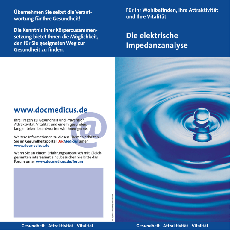 Übernehmen Sie selbst die Verantwortung für Ihre Gesundheit! Für Ihr Wohlbefinden, Ihre Attraktivität und Ihre Vitalität Die Kenntnis Ihrer Körperzusammensetzung bietet Ihnen die Möglichkeit, den für Sie geeigneten Weg zur Gesundheit zu finden. Die elektrische Impedanzanalyse www.docmedicus.de @ Ihre Fragen zu Gesundheit und Prävention, Attraktivität, Vitalität und einem gesunden, langen Leben beantworten wir Ihnen gerne. Weitere Informationen zu diesen Themen erhalten Sie im Gesundheitsportal DocMedicus unter www.docmedicus.de BIA 04.2008 – designed by www.cmxs.de Wenn Sie an einem Erfahrungsaustausch mit Gleichgesinnten interessiert sind, besuchen Sie bitte das Forum unter www.docmedicus.de/forum Gesundheit · Attraktivität · Vitalität Gesundheit · Attraktivität · Vitalität Übernehmen Sie selbst die Verantwortung für Ihre Gesundheit! Die elektrische Impedanzanalyse hilft Ihnen auf Ihrem Weg zu mehr Wohlbefinden, Attraktivität und Leistungsfähigkeit. Die elektrische Impedanzanalyse dient der Messung Ihrer Körperzusammensetzung. Das wissenschaftlich anerkannte Messverfahren wird in der Ernährungs-, Sport- und Anti-Aging-Medizin eingesetzt. Die elektrische Impedanzanalyse ermöglicht eine umfassende Bestimmung Ihrer Körperzusammensetzung Körperfett Muskel- und Organmasse Blut- und Gewebeflüssigkeit Gesamtkörperwasser Über vier Hautklebeelektroden, von denen jeweils zwei an der Hand und zwei am Fuß derselben Körperseite befestigt werden, wird ein elektrisches Feld im Körper erzeugt, ohne dass Sie davon etwas spüren. Grundlage dieser Messung ist die Tatsache, dass das Körperfett – im Gegensatz zu Körperwasser und Muskulatur – den Strom nur wenig weiterleitet, sondern ihm einen erheblichen Widerstand entgegensetzt. Dieser Widerstand wird mittels der elektrischen Impedanzanalyse gemessen. Des Weiteren werden Ihre Körpergröße, Ihr Körpergewicht und Ihr Geschlecht berücksichtigt. Anhand der Messergebnisse wird Ihre individuelle Körperzusammensetzung berechnet. Durch regelmäßige Verlaufsuntersuchungen können Sie selbst verfolgen, wie sich Ihre Körperzusammensetzung durch ein verändertes Essverhalten – zum Beispiel im Rahmen einer Gewichtsreduktion – oder durch ein individuelles Fitness-Programm verbessert. Die elektrische Impedanzanalyse gibt Ihnen Antworten auf folgende Fragen Wie viel Körperfett haben Sie? Wie ist Ihr Ernährungszustand? Falls Sie an einem Abnehmprogramm teilnehmen: - Wie viel Körperfett haben Sie seit der letzten Messung abgenommen? - Haben Sie gleichzeitig Ihre Muskulatur erhalten können? Ein Verlust von Muskulatur sollte beim Abnehmen vermieden werden! Ist Ihre Muskulatur ausreichend entwickelt? Falls Sie Sport treiben: Wie ist Ihr Trainingszustand? Was ist Ihr Vitalitätsoptimum? Sie erhalten einen schriftlichen Befund Ihrer Körperzusammensetzung sowie individuelle Ernährungs-, Vitalstoff- und Fitness-Empfehlungen. Sprechen Sie uns an und erfahren Sie mehr über Ihren Körper und das, was er für mehr Wohlbefinden und Vitalität benötigt.