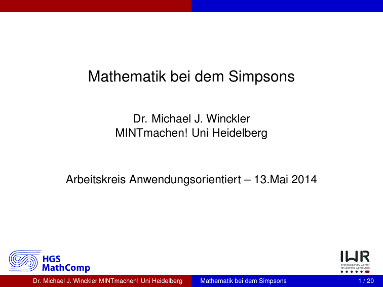 Mathematik bei dem Simpsons Dr. Michael J. Winckler MINTmachen! Uni Heidelberg Arbeitskreis Anwendungsorientiert – 13.Mai 2014 Dr. Michael J. Winckler MINTmachen! Uni Heidelberg Mathematik bei dem Simpsons 1 / 20 Die Simpsons und Mathematik Agenda - Visit at IWR 1 Die Simpsons und Mathematik 2 Mathematik Erste-Hilfe-Kasten 3 Homerun für die Liebe 4 Zwei weitere Beispiele Dr. Michael J. Winckler MINTmachen! Uni Heidelberg Mathematik bei dem Simpsons 2 / 20 Die Simpsons und Mathematik Die Simpsons Wir wissen alles über Mathe! Homer Marge Bart Lisa Maggie Dr. Michael J. Winckler MINTmachen! Uni Heidelberg Mathematik bei dem Simpsons 3 / 20 Die Simpsons und Mathematik Das Autorenteam Geballtes Mathewissen ... J.Stewart Burns, MSc Maths Berkeley David X Cohen, MSc Info Berkeley Al Jean, BSc Maths Harvard Ken Keeler, PhD Maths Harvard Jeff Westbrook, PhD Info Princeton ... und 118 andere Dr. Michael J. Winckler MINTmachen! Uni Heidelberg Mathematik bei dem Simpsons 4 / 20 Die Simpsons und Mathematik Das Autorenteam Geballtes Mathewissen ... J.Stewart Burns, MSc Maths Berkeley David X Cohen, MSc Info Berkeley Al Jean, BSc Maths Harvard Ken Keeler, PhD Maths Harvard Jeff Westbrook, PhD Info Princeton ... und 118 andere Dr. Michael J. Winckler MINTmachen! Uni Heidelberg Mathematik bei dem Simpsons 4 / 20 Mathematik Erste-Hilfe-Kasten Agenda - Visit at IWR 1 Die Simpsons und Mathematik 2 Mathematik Erste-Hilfe-Kasten 3 Homerun für die Liebe 4 Zwei weitere Beispiele Dr. Michael J. Winckler MINTmachen! Uni Heidelberg Mathematik bei dem Simpsons 5 / 20 Mathematik Erste-Hilfe-Kasten Bevor wir uns das ansehen ... Ein Erste-Hilfe-Kasten Mathematik 47 ∗ 43 = 410 d|a und d|b → d|(a − b) 210 = 1024 ≈ 1000 = 103 log(n) ≈ (Anzahl Stellen von n) -1 log(3524562) ≈6.54711 27 + 23 = 128 + 8 = 136 = 10001000bin (a + b)(a − b) = a2 − b2 Dr. Michael J. Winckler MINTmachen! Uni Heidelberg Mathematik bei dem Simpsons 6 / 20 Mathematik Erste-Hilfe-Kasten Bevor wir uns das ansehen ... Ein Erste-Hilfe-Kasten Mathematik 47 ∗ 43 = 410 d|a und d|b → d|(a − b) 210 = 1024 ≈ 1000 = 103 log(n) ≈ (Anzahl Stellen von n) -1 log(3524562) ≈6.54711 27 + 23 = 128 + 8 = 136 = 10001000bin (a + b)(a − b) = a2 − b2 Dr. Michael J. Winckler MINTmachen! Uni Heidelberg Mathematik bei dem Simpsons 6 / 20 Mathematik Erste-Hilfe-Kasten Bevor wir uns das ansehen ... Ein Erste-Hilfe-Kasten Mathematik 47 ∗ 43 = 410 d|a und d|b → d|(a − b) 210 = 1024 ≈ 1000 = 103 log(n) ≈ (Anzahl Stellen von n) -1 log(3524562) ≈6.54711 27 + 23 = 128 + 8 = 136 = 10001000bin (a + b)(a − b) = a2 − b2 Dr. Michael J. Winckler MINTmachen! Uni Heidelberg Mathematik bei dem Simpsons 6 / 20 Mathematik Erste-Hilfe-Kasten Bevor wir uns das ansehen ... Ein Erste-Hilfe-Kasten Mathematik 47 ∗ 43 = 410 d|a und d|b → d|(a − b) 210 = 1024 ≈ 1000 = 103 log(n) ≈ (Anzahl Stellen von n) -1 log(3524562) ≈6.54711 27 + 23 = 128 + 8 = 136 = 10001000bin (a + b)(a − b) = a2 − b2 Dr. Michael J. Winckler MINTmachen! Uni Heidelberg Mathematik bei dem Simpsons 6 / 20 Mathematik Erste-Hilfe-Kasten Bevor wir uns das ansehen ... Ein Erste-Hilfe-Kasten Mathematik 47 ∗ 43 = 410 d|a und d|b → d|(a − b) 210 = 1024 ≈ 1000 = 103 log(n) ≈ (Anzahl Stellen von n) -1 log(3524562) ≈6.54711 27 + 23 = 128 + 8 = 136 = 10001000bin (a + b)(a − b) = a2 − b2 Dr. Michael J. Winckler MINTmachen! Uni Heidelberg Mathematik bei dem Simpsons 6 / 20 Mathematik Erste-Hilfe-Kasten Bevor wir uns das ansehen ... Ein Erste-Hilfe-Kasten Mathematik 47 ∗ 43 = 410 d|a und d|b → d|(a − b) 210 = 1024 ≈ 1000 = 103 log(n) ≈ (Anzahl Stellen von n) -1 log(3524562) ≈6.54711 27 + 23 = 128 + 8 = 136 = 10001000bin (a + b)(a − b) = a2 − b2 Dr. Michael J. Winckler MINTmachen! Uni Heidelberg Mathematik bei dem Simpsons 6 / 20 Mathematik Erste-Hilfe-Kasten Bevor wir uns das ansehen ... Ein Erste-Hilfe-Kasten Mathematik 47 ∗ 43 = 410 d|a und d|b → d|(a − b) 210 = 1024 ≈ 1000 = 103 log(n) ≈ (Anzahl Stellen von n) -1 log(3524562) ≈6.54711 27 + 23 = 128 + 8 = 136 = 10001000bin (a + b)(a − b) = a2 − b2 Dr. Michael J. Winckler MINTmachen! Uni Heidelberg Mathematik bei dem Simpsons 6 / 20 Mathematik Erste-Hilfe-Kasten Bevor wir uns das ansehen ... Ein Erste-Hilfe-Kasten Mathematik 47 ∗ 43 = 410 d|a und d|b → d|(a − b) 210 = 1024 ≈ 1000 = 103 log(n) ≈ (Anzahl Stellen von n) -1 log(3524562) ≈6.54711 27 + 23 = 128 + 8 = 136 = 10001000bin (a + b)(a − b) = a2 − b2 Dr. Michael J. Winckler MINTmachen! Uni Heidelberg Mathematik bei dem Simpsons 6 / 20 Mathematik Erste-Hilfe-Kasten Bevor wir uns das ansehen ... Ein Erste-Hilfe-Kasten Mathematik 47 ∗ 43 = 410 d|a und d|b → d|(a − b) 210 = 1024 ≈ 1000 = 103 log(n) ≈ (Anzahl Stellen von n) -1 log(3524562) ≈6.54711 27 + 23 = 128 + 8 = 136 = 10001000bin (a + b)(a − b) = a2 − b2 Dr. Michael J. Winckler MINTmachen! Uni Heidelberg Mathematik bei dem Simpsons 6 / 20 Mathematik Erste-Hilfe-Kasten Bevor wir uns das ansehen ... Ein Erste-Hilfe-Kasten Mathematik 47 ∗ 43 = 410 d|a und d|b → d|(a − b) 210 = 1024 ≈ 1000 = 103 log(n) ≈ (Anzahl Stellen von n) -1 log(3524562) ≈6.54711 27 + 23 = 128 + 8 = 136 = 10001000bin (a + b)(a − b) = a2 − b2 Dr. Michael J. Winckler MINTmachen! Uni Heidelberg Mathematik bei dem Simpsons 6 / 20 Mathematik Erste-Hilfe-Kasten Bevor wir uns das ansehen ... Ein Erste-Hilfe-Kasten Mathematik 47 ∗ 43 = 410 d|a und d|b → d|(a − b) 210 = 1024 ≈ 1000 = 103 log(n) ≈ (Anzahl Stellen von n) -1 log(3524562) ≈6.54711 27 + 23 = 128 + 8 = 136 = 10001000bin (a + b)(a − b) = a2 − b2 Dr. Michael J. Winckler MINTmachen! Uni Heidelberg Mathematik bei dem Simpsons 6 / 20 Mathematik Erste-Hilfe-Kasten Bevor wir uns das ansehen ... Ein Erste-Hilfe-Kasten Mathematik 47 ∗ 43 = 410 d|a und d|b → d|(a − b) 210 = 1024 ≈ 1000 = 103 log(n) ≈ (Anzahl Stellen von n) -1 log(3524562) ≈6.54711 27 + 23 = 128 + 8 = 136 = 10001000bin (a + b)(