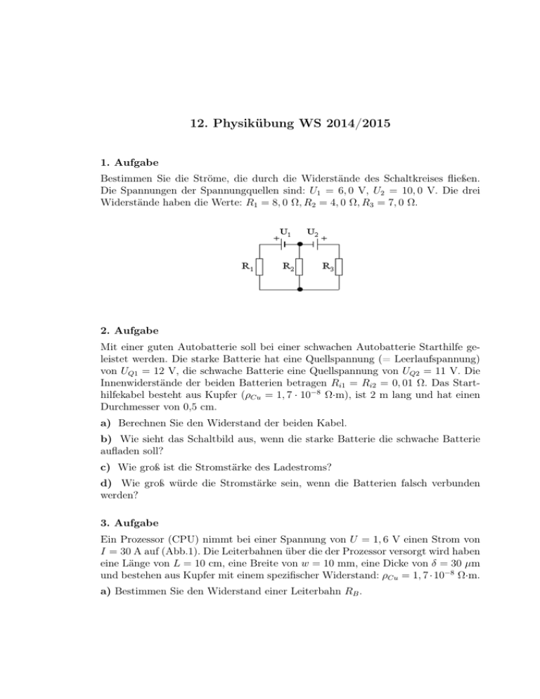 12. Physikübung WS 2014/2015 1. Aufgabe Bestimmen Sie die Ströme, die durch die Widerstände des Schaltkreises fließen. Die Spannungen der Spannungquellen sind: U1 = 6, 0 V, U2 = 10, 0 V. Die drei Widerstände haben die Werte: R1 = 8, 0 Ω, R2 = 4, 0 Ω, R3 = 7, 0 Ω. 2. Aufgabe Mit einer guten Autobatterie soll bei einer schwachen Autobatterie Starthilfe geleistet werden. Die starke Batterie hat eine Quellspannung (= Leerlaufspannung) von UQ1 = 12 V, die schwache Batterie eine Quellspannung von UQ2 = 11 V. Die Innenwiderstände der beiden Batterien betragen Ri1 = Ri2 = 0, 01 Ω. Das Starthilfekabel besteht aus Kupfer (ρCu = 1, 7 · 10−8 Ω·m), ist 2 m lang und hat einen Durchmesser von 0,5 cm. a) Berechnen Sie den Widerstand der beiden Kabel. b) Wie sieht das Schaltbild aus, wenn die starke Batterie die schwache Batterie aufladen soll? c) Wie groß ist die Stromstärke des Ladestroms? d) Wie groß würde die Stromstärke sein, wenn die Batterien falsch verbunden werden? 3. Aufgabe Ein Prozessor (CPU) nimmt bei einer Spannung von U = 1, 6 V einen Strom von I = 30 A auf (Abb.1). Die Leiterbahnen über die der Prozessor versorgt wird haben eine Länge von L = 10 cm, eine Breite von w = 10 mm, eine Dicke von δ = 30 µm und bestehen aus Kupfer mit einem spezifischer Widerstand: ρCu = 1, 7 · 10−8 Ω·m. a) Bestimmen Sie den Widerstand einer Leiterbahn RB . Abbildung 1: Schematisches Schaltbild eines Prozessors. b) Berechnen Sie U der Spannungsquelle, damit der Prozessor mit 1, 6 V versorgt wird. c) Berechnen Sie die Leistung, die in den Leiterbahnen verloren geht. d) Berechnen Sie die vom Prozessor aufgenommene Leistung. 4. Aufgabe Die Kappazität des in der Abbildung dargestellten Schaltkreises ist C = 0, 3 µF, der Gesamtwiderstand 20 kΩ und die Quellspannung der Batterie 12 V. Bestimmen Sie a) die Zeitkonstante, b) die maximale Ladung, die der Kondensator aufnehmen kann, c) die erforderliche Zeit, um 99% dieses Wertes zu erreichen, d) den Strom I für die Hälfte des Maximalwertes der Ladung e) den maximalen Strom und f ) die Ladung Q, wenn der Strom den 0,2 fachen Wert seines Maximums hat. D. Samm 12. Physikübung, WS 2014/2015 2