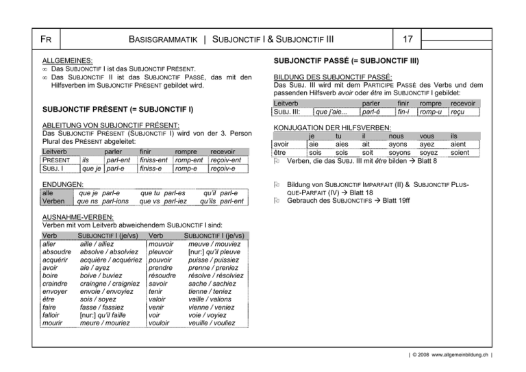 FR BASISGRAMMATIK | SUBJONCTIF I & SUBJONCTIF III ALLGEMEINES: • Das SUBJONCTIF I ist das SUBJONCTIF PRÉSENT. • Das SUBJONCTIF II ist das SUBJONCTIF PASSÉ, das mit den Hilfsverben im SUBJONCTIF PRÉSENT gebildet wird. ABLEITUNG VON SUBJONCTIF PRÉSENT: Das SUBJONCTIF PRÉSENT (SUBJONCTIF I) wird von Plural des PRÉSENT abgeleitet: Leitverb parler finir rompre PRÉSENT ils parl-ent finiss-ent romp-ent SUBJ. I que je parl-e finiss-e romp-e ENDUNGEN: alle que je parl-e Verben que ns parl-ions SUBJONCTIF PASSÉ (= SUBJONCTIF III) BILDUNG DES SUBJONCTIF PASSÉ: Das SUBJ. III wird mit dem PARTICIPE PASSÉ des Verbs und dem passenden Hilfsverb avoir oder être im SUBJONCTIF I gebildet: Leitverb SUBJ. III: SUBJONCTIF PRÉSENT (= SUBJONCTIF I) der 3. Person recevoir reçoiv-ent reçoiv-e qu’il parl-e qu’ils parl-ent que j’aie... parler parl-é finir fin-i rompre romp-u KONJUGATION DER HILFSVERBEN: je tu il nous vous avoir aie aies ait ayons ayez être sois sois soit soyons soyez Verben, die das SUBJ. III mit être bilden Blatt 8 que tu parl-es que vs parl-iez 17 recevoir reçu ils aient soient Bildung von SUBJONCTIF IMPARFAIT (II) & SUBJONCTIF PLUSQUE-PARFAIT (IV) Blatt 18 Gebrauch des SUBJONCTIFS Blatt 19ff AUSNAHME-VERBEN: Verben mit vom Leitverb abweichendem SUBJONCTIF I sind: Verb SUBJONCTIF I (je/vs) Verb SUBJONCTIF I (je/vs) aller aille / alliez mouvoir meuve / mouviez absoudre absolve / absolviez pleuvoir [nur:] qu’il pleuve acquérir acquière / acquériez pouvoir puisse / puissiez avoir aie / ayez prendre prenne / preniez boire boive / buviez résoudre résolve / résolviez craindre craingne / craigniez savoir sache / sachiez envoyer envoie / envoyiez tenir tienne / teniez être sois / soyez valoir vaille / valions faire fasse / fassiez venir vienne / veniez falloir [nur:] qu’il faille voir voie / voyiez mourir meure / mouriez vouloir veuille / vouliez | © 2008 www.allgemeinbildung.ch |