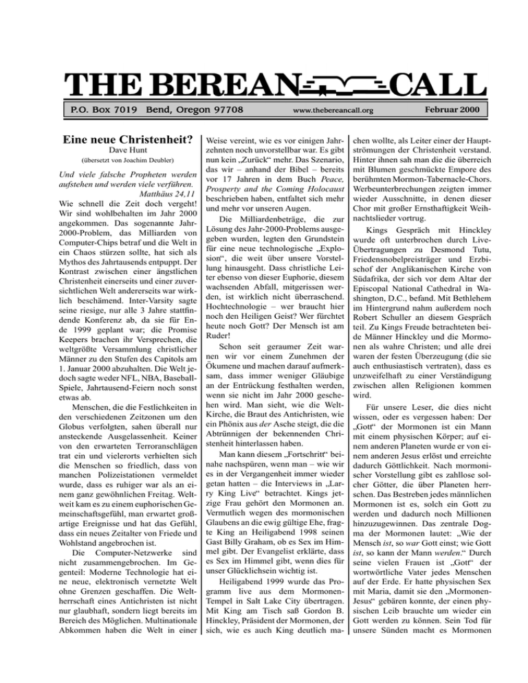 Eine neue Christenheit? Dave Hunt (übersetzt von Joachim Deubler) Und viele falsche Propheten werden aufstehen und werden viele verführen. Matthäus 24,11 Wie schnell die Zeit doch vergeht! Wir sind wohlbehalten im Jahr 2000 angekommen. Das sogenannte Jahr2000-Problem, das Milliarden von Computer-Chips betraf und die Welt in ein Chaos stürzen sollte, hat sich als Mythos des Jahrtausends entpuppt. Der Kontrast zwischen einer ängstlichen Christenheit einerseits und einer zuversichtlichen Welt andererseits war wirklich beschämend. Inter-Varsity sagte seine riesige, nur alle 3 Jahre stattfindende Konferenz ab, da sie für Ende 1999 geplant war; die Promise Keepers brachen ihr Versprechen, die weltgrößte Versammlung christlicher Männer zu den Stufen des Capitols am 1. Januar 2000 abzuhalten. Die Welt jedoch sagte weder NFL, NBA, BaseballSpiele, Jahrtausend-Feiern noch sonst etwas ab. Menschen, die die Festlichkeiten in den verschiedenen Zeitzonen um den Globus verfolgten, sahen überall nur ansteckende Ausgelassenheit. Keiner von den erwarteten Terroranschlägen trat ein und vielerorts verhielten sich die Menschen so friedlich, dass von manchen Polizeistationen vermeldet wurde, dass es ruhiger war als an einem ganz gewöhnlichen Freitag. Weltweit kam es zu einem euphorischen Gemeinschaftsgefühl, man erwartet großartige Ereignisse und hat das Gefühl, dass ein neues Zeitalter von Friede und Wohlstand angebrochen ist. Die Computer-Netzwerke sind nicht zusammengebrochen. Im Gegenteil: Moderne Technologie hat eine neue, elektronisch vernetzte Welt ohne Grenzen geschaffen. Die Weltherrschaft eines Antichristen ist nicht nur glaubhaft, sondern liegt bereits im Bereich des Möglichen. Multinationale Abkommen haben die Welt in einer Weise vereint, wie es vor einigen Jahrzehnten noch unvorstellbar war. Es gibt nun kein Zurück“ mehr. Das Szenario, ” das wir – anhand der Bibel – bereits vor 17 Jahren in dem Buch Peace, Prosperty and the Coming Holocaust beschrieben haben, entfaltet sich mehr und mehr vor unseren Augen. Die Milliardenbeträge, die zur Lösung des Jahr-2000-Problems ausgegeben wurden, legten den Grundstein für eine neue technologische Explo” sion“, die weit über unsere Vorstellung hinausgeht. Dass christliche Leiter ebenso von dieser Euphorie, diesem wachsenden Abfall, mitgerissen werden, ist wirklich nicht überraschend. Hochtechnologie – wer braucht hier noch den Heiligen Geist? Wer fürchtet heute noch Gott? Der Mensch ist am Ruder! Schon seit geraumer Zeit warnen wir vor einem Zunehmen der Ökumene und machen darauf aufmerksam, dass immer weniger Gläubige an der Entrückung festhalten werden, wenn sie nicht im Jahr 2000 geschehen wird. Man sieht, wie die WeltKirche, die Braut des Antichristen, wie ein Phönix aus der Asche steigt, die die Abtrünnigen der bekennenden Christenheit hinterlassen haben. Man kann diesem Fortschritt“ bei” nahe nachspüren, wenn man – wie wir es in der Vergangenheit immer wieder getan hatten – die Interviews in Lar” ry King Live“ betrachtet. Kings jetzige Frau gehört den Mormonen an. Vermutlich wegen des mormonischen Glaubens an die ewig gültige Ehe, fragte King an Heiligabend 1998 seinen Gast Billy Graham, ob es Sex im Himmel gibt. Der Evangelist erklärte, dass es Sex im Himmel gibt, wenn dies für unser Glücklichsein wichtig ist. Heiligabend 1999 wurde das Programm live aus dem MormonenTempel in Salt Lake City übertragen. Mit King am Tisch saß Gordon B. Hinckley, Präsident der Mormonen, der sich, wie es auch King deutlich ma- chen wollte, als Leiter einer der Hauptströmungen der Christenheit verstand. Hinter ihnen sah man die die überreich mit Blumen geschmückte Empore des berühmten Mormon-Tabernacle-Chors. Werbeunterbrechungen zeigten immer wieder Ausschnitte, in denen dieser Chor mit großer Ernsthaftigkeit Weihnachtslieder vortrug. Kings Gespräch mit Hinckley wurde oft unterbrochen durch LiveÜbertragungen zu Desmond Tutu, Friedensnobelpreisträger und Erzbischof der Anglikanischen Kirche von Südafrika, der sich vor dem Altar der Episcopal National Cathedral in Washington, D.C., befand. Mit Bethlehem im Hintergrund nahm außerdem noch Robert Schuller an diesem Gespräch teil. Zu Kings Freude betrachteten beide Männer Hinckley und die Mormonen als wahre Christen; und alle drei waren der festen Überzeugung (die sie auch enthusiastisch vertraten), dass es unzweifelhaft zu einer Verständigung zwischen allen Religionen kommen wird. Für unsere Leser, die dies nicht wissen, oder es vergessen haben: Der Gott“ der Mormonen ist ein Mann ” mit einem physischen Körper; auf einem anderen Planeten wurde er von einem anderen Jesus erlöst und erreichte dadurch Göttlichkeit. Nach mormonischer Vorstellung gibt es zahllose solcher Götter, die über Planeten herrschen. Das Bestreben jedes männlichen Mormonen ist es, solch ein Gott zu werden und dadurch noch Millionen hinzuzugewinnen. Das zentrale Dogma der Mormonen lautet: Wie der ” Mensch ist, so war Gott einst; wie Gott ist, so kann der Mann werden.“ Durch seine vielen Frauen ist Gott“ der ” wortwörtliche Vater jedes Menschen auf der Erde. Er hatte physischen Sex mit Maria, damit sie den Mormonen” Jesus“ gebären konnte, der einen physischen Leib brauchte um wieder ein Gott werden zu können. Sein Tod für unsere Sünden macht es Mormonen möglich, ihre eigene Erlösung zu verdienen. Diese Erlösung stellt nichts anderes dar als ihre Erhöhung zur Gottheit durch gute Werke, geheime Tempel-Rituale und andere Initiationsriten nach ihrem leiblichen Tod. Auf diese Weise erhöht, gelangt jeder – so ihre Meinung – dahin, seine eigene neue Erde mit ihrem eigenen neuen Adam und einer neuen Eva zu erschaffen. Ein neuer Luzifer wird einen neuen Sündenfall verursachen und ein neuer Jesus wird ebenso am Kreuz sterben, damit wiederum Menschen zu neuen Göttern erhöht werden können. Vor diesem Hintergrund folgen nun – versehen mit Kommentaren – e