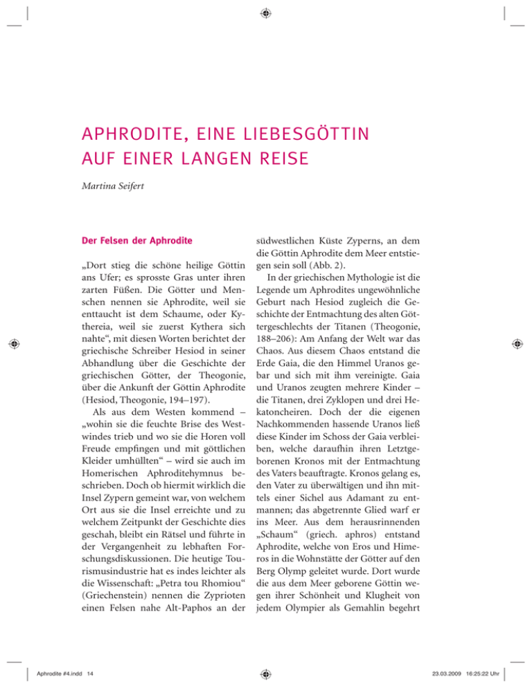 APHRODITE, EINE LIEBESGÖTTIN AUF EINER LANGEN REISE Martina Seifert Der Felsen der Aphrodite „Dort stieg die schöne heilige Göttin ans Ufer; es sprosste Gras unter ihren zarten Füßen. Die Götter und Menschen nennen sie Aphrodite, weil sie enttaucht ist dem Schaume, oder Kythereia, weil sie zuerst Kythera sich nahte“, mit diesen Worten berichtet der griechische Schreiber Hesiod in seiner Abhandlung über die Geschichte der griechischen Götter, der Theogonie, über die Ankunft der Göttin Aphrodite (Hesiod, Theogonie, 194–197). Als aus dem Westen kommend – „wohin sie die feuchte Brise des Westwindes trieb und wo sie die Horen voll Freude empfingen und mit göttlichen Kleider umhüllten“ – wird sie auch im Homerischen Aphroditehymnus beschrieben. Doch ob hiermit wirklich die Insel Zypern gemeint war, von welchem Ort aus sie die Insel erreichte und zu welchem Zeitpunkt der Geschichte dies geschah, bleibt ein Rätsel und führte in der Vergangenheit zu lebhaften Forschungsdiskussionen. Die heutige Tourismusindustrie hat es indes leichter als die Wissenschaft: „Petra tou Rhomiou“ (Griechenstein) nennen die Zyprioten einen Felsen nahe Alt-Paphos an der Aphrodite #4.indd 14 südwestlichen Küste Zyperns, an dem die Göttin Aphrodite dem Meer entstiegen sein soll (Abb. 2). In der griechischen Mythologie ist die Legende um Aphrodites ungewöhnliche Geburt nach Hesiod zugleich die Geschichte der Entmachtung des alten Göttergeschlechts der Titanen (Theogonie, 188–206): Am Anfang der Welt war das Chaos. Aus diesem Chaos entstand die Erde Gaia, die den Himmel Uranos gebar und sich mit ihm vereinigte. Gaia und Uranos zeugten mehrere Kinder – die Titanen, drei Zyklopen und drei Hekatoncheiren. Doch der die eigenen Nachkommenden hassende Uranos ließ diese Kinder im Schoss der Gaia verbleiben, welche daraufhin ihren Letztgeborenen Kronos mit der Entmachtung des Vaters beauftragte. Kronos gelang es, den Vater zu überwältigen und ihn mittels einer Sichel aus Adamant zu entmannen; das abgetrennte Glied warf er ins Meer. Aus dem herausrinnenden „Schaum“ (griech. aphros) entstand Aphrodite, welche von Eros und Himeros in die Wohnstätte der Götter auf den Berg Olymp geleitet wurde. Dort wurde die aus dem Meer geborene Göttin wegen ihrer Schönheit und Klugheit von jedem Olympier als Gemahlin begehrt 23.03.2009 16:25:22 Uhr APHRODITE, EINE LIEBESGÖTTIN AUF EINER LANGEN REISE 15 und ging schliesslich eine eheliche Verbindung mit dem verkrüppelten Schmiedegott Hephaistos ein. Das Glück war jedoch nicht von Dauer, denn sie betrog diesen später u. a. mit dem Kriegsgott Ares. Als der Sonnengott Helios die beiden Ehebrecher beobachtete und Hephaistos über Aphrodites Untreue unterrichtete, fing dieser das nackte Liebespaar mit einem unsichtbaren Netz und rief die anderen Götter herbei. Auf diese Weise gab Hephaistos die treulose Gattin mit ihrem Liebhaber vor aller Augen der Lächerlichkeit preis. Bei Homer wird eine andere Geschichte über Aphrodites Herkunft erzählt, der zufolge Aphrodite die Tochter des Göttervaters Zeus und der Dione war und somit seit ihrer Geburt zum Kreis der Olympischen Götter gehörte (Homer, Ilias 5, 370–417). Zu diesen zählen in diesem Kontext neben Aphrodite und dem Göttervater Zeus dessen Gemahlin Hera sowie Poseidon, Demeter, Apollon, Artemis, Athena, Hephaistos, Ares, Dionysos und Hermes. Da jede Gottheit gesellschaftliche Wertvorstellungen verkörperte – Tugenden wie Laster –, boten die Götterkulte den Griechen notwendige Identifikationsmöglichkeiten und schufen ein Regelsystem für angemessenes menschliches Verhalten. Die Heiligtümer, in denen die meisten Götterkulte angesiedelt waren, lagen in den innerstädtischen (urbanen), randstädtischen (sub-urbanen) und außerstädtischen (extra-urbanen) Gebieten und boten neben ihrer religiösen Funktion eine wichtige soziale Anlaufstationen. Interessant ist nun die Rolle, welche die Göttin Aphrodite im Kreise der Olympier spielte. Griechische Darstellungen von Aphrodite in Gesellschaft der Olympischen Götter kennen wir aus der Vasenmalerei, aber auch durch den Figurenschmuck des Parthenons auf der Athener Akropolis. Der im 5. Jh. v. Chr. geschaffene und im Tempelinneren (griech. Cella) herumlaufende Fries des Parthenons bildet den Festumzug des Panathenäenfestes zu Ehren der Stadtgöttin Athena ab: Die Olympischen Götter, und unter ihnen Aphrodite, sind herbeigekommen, um das Treiben der Menschen zu beobachten. Aphrodite wird auf dem Parthenonfries nicht durch besondere physische Merkmale, erklärende Beigaben oder explizites Verhalten charakterisiert, sie erscheint vielmehr im Stil der Zeit als eine der olympischen Göttinnen. Detailliertere Informationen über ihr Wesen gewinnen wir durch die mythische Überlieferung: Dort verkörperte sie die Weiblichkeit in all ihrer Zweideutigkeit, den verführerischen Liebreiz und die Anmut – von den Griechen als „Charis“ Nachfolgende Doppelseite: Abb. 2 Der als „Felsen der Aphrodite“ bezeichnete „Petra tou Rhomiou“ befindet sich in der Nähe von Alt-Paphos an der Südküste Zyperns. Er ist heute noch eine Touristen-Attraktion. Das Bild gibt den Küstenabschnitt in der Nähe des Aphroditefelsens wieder. Aphrodite #4.indd 15 23.03.2009 16:25:22 Uhr 16 Aphrodite #4.indd 16 23.03.2009 16:25:22 Uhr 17 Aphrodite #4.indd 17 23.03.2009 16:25:23 Uhr MARTINA SEIFERT 18 Die Olympischen Götter Im antiken Griechenland war die Religion ein integraler Bestandteil des Lebens und der Kult der Götter eine öffentliche und gemeinschaftliche Aktivität, die vorwiegend in Heiligtümern ausgeübt wurde. Die griechischen Götter besaßen eine Reihe von Eigenschaften, die sie von den Menschen unterschieden: Sie waren unsterblich und in ihren Adern floss kein Blut. Sie ernährten sich von Nektar und Ambrosia sowie vom Opferrauch, der von den Altären der Menschen in den Heiligtümern aufstieg. Als ihre Wohnstatt galt der sagenhafte Berg Olymp – 