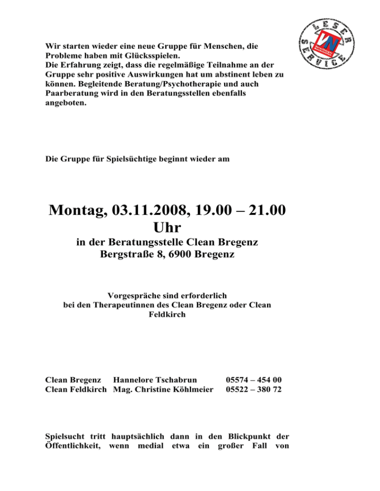 Wir starten wieder eine neue Gruppe für Menschen, die Probleme haben mit Glücksspielen. Die Erfahrung zeigt, dass die regelmäßige Teilnahme an der Gruppe sehr positive Auswirkungen hat um abstinent leben zu können. Begleitende Beratung/Psychotherapie und auch Paarberatung wird in den Beratungsstellen ebenfalls angeboten. Die Gruppe für Spielsüchtige beginnt wieder am Montag, 03.11.2008, 19.00 – 21.00 Uhr in der Beratungsstelle Clean Bregenz Bergstraße 8, 6900 Bregenz Vorgespräche sind erforderlich bei den Therapeutinnen des Clean Bregenz oder Clean Feldkirch Clean Bregenz Hannelore Tschabrun Clean Feldkirch Mag. Christine Köhlmeier 05574 – 454 00 05522 – 380 72 Spielsucht tritt hauptsächlich dann in den Blickpunkt der Öffentlichkeit, wenn medial etwa ein großer Fall von Unterschlagung berichtet wird und der Hintergrund mit Spielsucht erklärt wird. Dass viele Menschen davon betroffen sind, die ganz gewöhnlich ihr Geld verdienen, ist für die meisten nicht vorstellbar. Menschen, die spielsüchtig sind, haben noch sehr mit Vorurteilen zu kämpfen. Das Bewusstsein, dass es sich um eine Krankheit handelt, ist hier bei weitem noch nicht so weit fortgeschritten wie bei Alkohol- oder Drogensucht. Es ist auch lange eine sehr stille Sucht, weil man den Menschen – Frauen, Männern, Jugendlichen – das Problem nicht ansieht. Unglaublich lange lässt es sich vertuschen, es gibt so viele Möglichkeiten, warum das Geld nicht reicht. Wer denkt denn da gleich an Probleme mit dem Spielen? Die Folgen der Spielsucht sind sehr ähnlich jener wie bei anderen Süchten: Depression, Schlaflosigkeit, Schulden, Verlust von Arbeitsplatz, Zerbrechen von Beziehungen, von Familien und Suizidversuche. Die persönlichen Folgen münden auch hier - wie bei anderen Süchten - immer in Folgen für die Allgemeinheit: Krankenstände, körperliche und seelische Beschwerden (Schlaflosigkeit, MagenDarmerkrankungen, Herzerkrankungen, Depressionen, Suizidalität) Finanzielle Folgen der Spielsucht aufgrund der Schulden für die Allgemeinheit: Konkurse, Arbeitsunfähigkeit, Gruppe Eine Gruppe bietet die Möglichkeit mehr Menschen zu erreichen und andererseits es ergeben sich andere Inhalte und Lerneffekte. So kann es sinnvoll sein, an der Gruppe in Ergänzung zu anderen Angeboten teilzunehmen oder auch nur ausschließlich dieses Angebot anzunehmen. Zum Aufnahmeprozedere der Gruppe gehören auf jeden Fall zwei Einzelgespräche, in denen mit den Betroffenen das für sie entsprechende Angebot gesucht wird. Die Gruppenteilnahme ist nicht an die Abstinenz vom Spielen gebunden. Der Vorteil einer gemischten Gruppe (abstinent und nicht abstinent) ist es, dass die TeilnehmerInnen voneinander lernen und sich gegenseitig konfrontieren. Dadurch ergibt sich ein anderer Lerneffekt. Gleichzeitig ist durch die professionelle Gruppenleitung gesichert, dass es nicht zu einer Verherrlichung des Spielens kommt. Mögliche Inhalte der Gruppe Ein wichtiges Thema in der Gruppe sind aus Erfahrung die einzelnen Notfallmaßnahmen, die die Gruppenmitglieder entwickeln und die gegenseitige Motivation solche Maßnahmen zu setzen: Bankomatkarten zurückzugegeben, sich im Casino sperren zu lassen, sich festzulegen wen man anruft, wenn es eng wird etc. Langfristige Maßnahmen: Die TeilnehmerInnen lernen, dass sie langfristig daran arbeiten müssen, um einen Gegenpol und eine gesunde Basis aufzubauen. Alternativen werden aufgebaut: Sport, Vereinstätigkeit, Schreiben, sinnvolle Tätigkeiten suchen. Lebensgeschichtliche Themen: Auch in der Gruppe können, je nach Offenheit und Vertrautheit persönliche lebensgeschichtliche Themen zur Sprache kommen und aufgearbeitet werden. Es ist unbedingt erforderlich, dass unabhängig zur Behandlung des direkt Betroffenen ein Angebot für Angehörige angeboten wird. Das Mitbetroffensein führt zu Verzweiflung und oft zu Depressionen. Viele Angehörige „fallen aus allen Wolken“, wenn sie mit der Spielsucht ihres Partners, ihrer Kinder konfrontiert werden. Sie verstehen die Situation einfach nicht, und dass es Sucht ist, schon gar nicht. Vortäuschungen und Lügen können nur schwer als Teil der Sucht gesehen werden, sondern nur als Vertrauensbruch. Alles andere der Beziehung wird dadurch für sie in Frage gestellt. Angehörige spielen beim Ausstieg eine ganz wichtige Rolle. Manchmal sind sie die ersten, die den Kreislauf unterbrechen, indem sie nicht mehr zuschauen, nicht mehr schweigen. Oft sind sie in ein Co - Verhalten gelangt, indem sie Schulden bezahlen, Fehlen bei der Arbeit oder sonstigen Verpflichtungen entschuldigen. Gespräche und Versprechungen hat es oft zur Genüge gegeben. Sie können oft selber nicht mehr schlafen, scheuen den Kontakt mit Menschen, aus Angst vor Fragen und möglichen Ausflüchten. Angehörige schämen sich, fühlen sich schuldig und leiden unter Depressionen. Der/die Therapeutin unterstützt sie im Suchen und Finden von Möglichkeiten, mit denen sie selber wieder mehr Lebensqualität erreichen können und auch den Betroffenen dadurch einen Weg weisen können, ihr Leben wieder zu verändern. Es gibt auch die Möglichkeit anonym via internet mit uns Kontakt aufzunehmen sowohl als Angehörige als auch für die Spielsüchtigen selbst. clean.feldkirch@mariaebene.at ZAHLEN UND FAKTEN ZUR SPIELSUCHT Die Österreicher zählen zu den fleißigsten Spielern in Europa In Österreich belaufen sich die durchschnittlichen Spiel- und Wetteinsätze pro Haushalt auf 3.122 € im Jahr. Nur die Briten (4.044 €) und Finnen (3.431 €) spielen noch mehr. Im vergleich liegt Deutschland im unteren Mittelfeld bei durchschnittlich 850 €. 2006 wurden insgesamt mehr als 10,3 Mrd. Euro verspielt und verwettet. Vor allem das Online-Glückspiel und das Automaten-Spiel boomen. Online wurde im Jahr 2006 um 1,3 Mrd. Euro gespielt d.h. um ein Drittel mehr als im Jahr davor. Die Summe der Automatenspiele beläuft sich 2006 auf ca. € 3,3 Mrd., das ist ein Plus von 36 % zu 2005. 2006 wurden in Österreic
