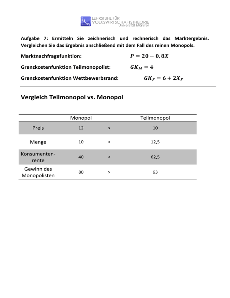 Aufgabe 7: Ermitteln Sie zeichnerisch und rechnerisch das Marktergebnis. Vergleichen Sie das Ergebnis anschließend mit dem Fall des reinen Monopols. Marktnachfragefunktion: , Grenzkostenfunktion Teilmonopolist: Grenzkostenfunktion Wettbewerbsrand: Vergleich Teilmonopol vs. Monopol Monopol Teilmonopol Preis 12 > 10 Menge 10 < 12,5 Konsumenten‐ rente 40 < 62,5 Gewinn des Monopolisten 80 > 63 Anwendung der Leibnitz‐Regel zur Herleitung der Ramsey‐Regel (1) Wofür eignet sich die Leibnitz‐Regel? Die Leibnitz‐Regel ist eine „Abkürzung“ bei der Differentiation von Integralen, die von einer Variablen abhängen und differenzierbar sind. , Beispiel: Interessant ist nun der Einfluss von s, d.h. die Frage, was passiert, wenn s geringfügig verändert wird. Graphisch lässt sich das noch relativ einfach zeigen: Eine Variation von s wirkt sich demnach an drei Stellen auf das Integral aus. In der Graphik wird s geringfügig erhöht, dadurch verkleinert sich das Integral an der linken und oberen Seite [(2) und (3)] und vergrößert sich auf der rechten Seite (1). Um diese Variation nun konkret auszurechnen, müsste man eigentlich das Integral berechnen und anschließend ableiten. Hier kommt nun die Leibnitz‐Regel als einfacherer und weniger aufwendigerer Lösungsweg ins Spiel: , (1) , , (2) (3) (2) Beispielhafter Vergleich der Leibnitz‐Regel und des herkömmlichen Lösungswegs ² Ausgangssituation: 0 a) herkömmlicher Lösungsweg ³ Zuerst muss das Integral berechnet werden: 2 5 216 27 ² b) Anwendung der Leibnitz‐Regel , einsetzen, umformen, ausrechnen: 5 5 36 ² 5 9 ² 2 180 ² 18 ² 164 ² 5 164 ² 36 ² ² 2 2 2 2 1 2 5 2 2 9 ² 2 ² ³ 3 Jetzt ableiten: , 6 63 ³ , (3) Welche Relevanz hat die Leibnitz‐Regel bei der Herleitung der Ramsey‐Preis‐Regel? Mit der Ramsey‐Preis‐Regel soll eine wohlfahrtsoptimale Preissetzung im natürlichen Monopol erreicht werden. Die Wohlfahrtsoptimalität bezieht sich dabei darauf, bei Durchschnittskostenpreissetzung den geringsten Verlust an Konsumentenrente (über alle Konsumentengruppen!) zu erreichen. Oder andersherum formuliert, Ziel ist die über alle Konsumentengruppen maximale Konsumentenrente nach den Preisaufschlägen. Dieses Vorhaben lässt sich in eine Zielfunktion bringen: , ! Die Vorgabe der Durchschnittskostenpreissetzung wird über eine Nebenbedingung abgebildet (es wird gefordert, dass der Gewinn null sein muss): , , 0 Dieses Maximierungsproblem lässt sich über den Lagrange‐Ansatz lösen. Die Lagrange‐ Funktion lautet: , , Statt s sind nun P1 und P2 die Variablen (vgl. obige Zielfunktion), deren Einfluss man herausfinden möchte. Ansonsten gibt es aber keine Unterschiede, weshalb man nun auch hier zur Lösung die Leibnitz‐Regel als „Abkürzung“ anwenden kann. (4) Herleitung der Ramsey‐Preis‐Regel (analog zum Skript S.16/17) Modellcharakteristika Ö Öffentliches Unternehmen produziert 2 Güter, wobei gilt , Ö Subadditivität der Kosten, es handelt sich um ein natürliches Monopol Ö Die Nachfrage ist durch bzw. spezifiziert Ö Gewinnfunktion des Unternehmens , , Modellansatz („Maximale Wohlfahrt bei kostenneutralen Preisen!“) , Zielfunktion: , Nebenbedingung: , Lagrangefunktion: gesucht: , , , , , , Modellcharakteristika: Nachfrage gegeben durch Berücksichtigung der Preiselastizität der Nachfrage Die Rechnung bis hier gilt analog für die zweite Gleichung Gleichungen dividieren ergibt die Ramsey‐Preis‐Regel Der Preisaufschlag auf die Grenzkostenpreise sollte also dem umgekehrten Verhältnis der jeweiligen Preiselastizitäten entsprechen.