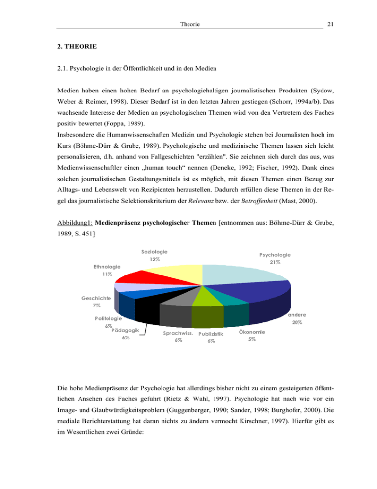Theorie 21 2. THEORIE 2.1. Psychologie in der Öffentlichkeit und in den Medien Medien haben einen hohen Bedarf an psychologiehaltigen journalistischen Produkten (Sydow, Weber & Reimer, 1998). Dieser Bedarf ist in den letzten Jahren gestiegen (Schorr, 1994a/b). Das wachsende Interesse der Medien an psychologischen Themen wird von den Vertretern des Faches positiv bewertet (Foppa, 1989). Insbesondere die Humanwissenschaften Medizin und Psychologie stehen bei Journalisten hoch im Kurs (Böhme-Dürr & Grube, 1989). Psychologische und medizinische Themen lassen sich leicht personalisieren, d.h. anhand von Fallgeschichten "erzählen". Sie zeichnen sich durch das aus, was Medienwissenschaftler einen „human touch“ nennen (Deneke, 1992; Fischer, 1992). Dank eines solchen journalistischen Gestaltungsmittels ist es möglich, mit diesen Themen einen Bezug zur Alltags- und Lebenswelt von Rezipienten herzustellen. Dadurch erfüllen diese Themen in der Regel das journalistische Selektionskriterium der Relevanz bzw. der Betroffenheit (Mast, 2000). Abbildung1: Medienpräsenz psychologischer Themen [entnommen aus: Böhme-Dürr & Grube, 1989, S. 451] Soziologie Psychologie 12% 21% Ethnologie 11% Geschichte 7% andere Politologie 6% Pädagogik 6% 20% Sprachwiss. Publizistik 6% 6% Ökonomie 5% Die hohe Medienpräsenz der Psychologie hat allerdings bisher nicht zu einem gesteigerten öffentlichen Ansehen des Faches geführt (Rietz & Wahl, 1997). Psychologie hat nach wie vor ein Image- und Glaubwürdigkeitsproblem (Guggenberger, 1990; Sander, 1998; Burghofer, 2000). Die mediale Berichterstattung hat daran nichts zu ändern vermocht Kirschner, 1997). Hierfür gibt es im Wesentlichen zwei Gründe: Theorie 22 1. Lediglich 3% der psychologiehaltigen Berichterstattung wird im Ressort Wissenschaft veröffentlicht. Aus diesem Grund ist es für Rezipienten kaum möglich, das wissenschaftliche Fundament der Profession Psychologie zu erkennen (s. Schorr, 1994a/b). 2. Obgleich psychologische Themen in vielen (Fernseh- und Hörfunk-)Formaten bzw. in vielen Print- Ressorts vorkommen, wird das Fach in der medialen Berichterstattung zumeist auf seinen klinisch-therapeutischen Aspekt verengt. Deshalb ist es für Rezipienten kaum möglich, ein umfassendes und realistisches Bild vom Forschungsfeld Psychologie zu entwickeln (s. Böhme-Dürr & Grube, 1989). Das medial vermittelte öffentliche Bild der Wissenschaft Psychologie und ihrer Vertreter weicht erheblich vom Selbstbild der Profession ab. Dieser Zustand erzeugt nach Ansicht von Schorr (1994a) bei Psychologinnen und Psychologen kognitive Dissonanz. So beklagen wissenschaftlich tätige Psychologinnen und Psychologen denn auch die mangelhafte Güte psychologiehaltiger Berichterstattung. Sie sehen in der fehlenden Fachkompetenz von Journalisten den Hauptgrund für die als unbefriedigend wahrgenommene Berichterstattung (Jaeggi, 1997). Folgt man den Forschungsergebnissen von McCall (1988), so kann das Verhältnis zwischen Journalisten und Psychologie-Experten als ein kritisch- distanziertes beschrieben werden, das durch wechselseitige Vorbehalte gekennzeichnet ist. Die Haltung wissenschaftlich tätiger Psychologinnen und Psychologen gegenüber den Medien ist alles andere als untypisch. Denn das Verhältnis von Wissenschaftlern und Journalisten ist nach den Erkenntnissen von Haller (1987; 1992) und Hömberg (1990; 1992) prekär, spannungsreich und von zahlreichen wechselseitigen Missverständnissen geprägt. Allerdings hat Peters (1995) nachweisen können, dass sich das Verhältnis zwischen den beiden Funktionssystemen Wissenschaft und Medien in den letzten Jahren verbessert hat. Abbildung2: Die Qualität der Wissenschaftsberichterstattung aus Sicht von Wissenschaftlern [entnommen aus den Materialien des Medientrainings v. Peters & Göpfert] 37% 26% 44% 53% 53% 52% 39% 42% 4% 8% 4% FZ Jülich (1997) FU Berlin (1997) Experten (1993) 49% 53% 10% U Mainz 26% KFA Jülich (1984) Eher gut Teils, teils Eher schlecht Theorie 23 Wissenschaftler weisen immer wieder auf die Unzulänglichkeiten des Journalismus hin (Krüger, 1987; Reschenberg, 1989). Sie vertreten mehrheitlich die Auffassung, dass der Journalismus kaum imstande sei, wissenschaftlich fundierte Sachverhalte präzise und korrekt darzustellen. Ferner versage der Journalismus vollends, wenn es darum gehe, wissenschaftliche Erkenntnisse zu bewerten und einzuschätzen. Umgekehrt weisen Journalisten darauf hin, dass sich der Journalismus nicht nach wissenschaftlichen Kriterien beurteilen lasse, sondern über eigene - eben journalistische Bewertungskriterien verfüge (Hömberg, 1987, 1990; Kastner, 1994). Zwar stimmen Wissenschaftler und Journalisten darin überein, dass die Berichterstattung über Wissenschaft primär dazu dienen sollte, Fakten zu vermitteln und praktische Ratschläge (Orientierungshilfen) zu erteilen; die Notwendigkeit, über wissenschaftliche Themen kritisch bzw. investigativ zu berichten, wird jedoch nur von den Journalisten gesehen, nicht aber von den Wissenschaftlern. Nur 38 Prozent der Wissenschaftler billigen dem Wissenschaftsjournalismus eine Kontrollfunktion zu (Krüger, 1987, S. 48). Aus Sicht von Journalisten sind Wissenschaftler nicht befugt, die publizistische Qualität journalistischer Produkte zu beurteilen, da sie die Aufgaben des Journalismus auf "Wissenstransfer" und "Aufklärung" reduziert sehen wollen, ohne dabei zu erkennen, dass Journalisten darüber hinaus die Aufgabe zukommt, das System Wissenschaft zu kontrollieren und zu kritisieren (Haux, 1989; Bader, 1993). Wissenschaftler und Journalisten verfolgen demnach unterschiedliche Ziele. Diese unterschiedliche Prioritätensetzung ist interessensbedingt und lässt sich nicht so ohne weiteres auflösen. Sie erklärt sich aus der Struktur der beiden Systeme und ist folglich mehr als nur ein Kommunikationsproblem, worauf z. B. Göpfert & Peters (1995) hinweisen. Gleichwohl müsste es möglich sein, zwischen Wissenschaftlern und Journalisten eine