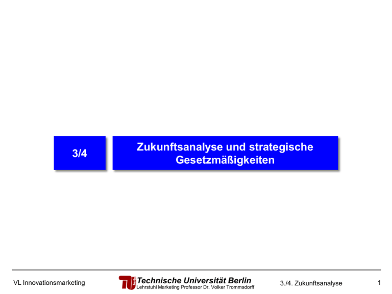 3/4 VL Innovationsmarketing Zukunftsanalyse und strategische Gesetzmäßigkeiten Technische Universität Berlin Lehrstuhl Marketing Professor Dr. Volker Trommsdorff 3./4. Zukunftsanalyse 1 Lernziele Zunächst sollen zwei konfliktäre Erkenntnisse verinnerlicht werden: Erstens sind für strategische Innovationsentscheidungen zwingend Einsichten über zukünftige Verhältnisse notwendig, weil deren Auswirkungen erst sehr lange nach dieser Entscheidung eintreten. Zweitens ist es unmöglich, das Verhalten komplexer Systeme (wie Produktinnovationen) langfristig richtig (quantitativ, exakt) vorherzusagen, was an vielen Beispielen zu demonstrieren ist und was auch theoretisch (Chaostheorie) gestützt ist. Die Studierenden sollen dieses Dilemma erkennen und daraus lernen, dass man den Gurus, der sogenannten Trendforschung und der statistischen Extrapolation von Vergangenheitsdaten skeptisch gegenüberstehen muss. Sie sollen aber auch lernen, dass es hilfreiche alternative, weiche, aufs Grobe und Relative beschränkte Theorien und Methoden gibt, die helfen, menschliche Denkbarrieren zu überwinden, Überraschendes zu antizipieren und durch „überzeugende“ Ergebnisse einen Beitrag zur selbsterfüllenden Innovationsstrategie zu leisten. VL Innovationsmarketing Technische Universität Berlin Lehrstuhl Marketing Professor Dr. Volker Trommsdorff 3./4. Zukunftsanalyse 2 Inhalt VL 3/4: Zukunftsanalyse und strategische Gesetzmäßigkeiten 1. Strategische Gesetzmäßigkeiten 1.1 Erfahrungskurve als Beispiel einer formalisierten Gesetzmäßigkeit 1.2 PLZ, S-Kurven und weitere strategische Gesetzmäßigkeiten 2. Prognosen/Zukunftsanalyse 2.1 Fehlprognosen und die Unmöglichkeit von Langfristprognosen 2.2 Szenarioanalyse, Delphi-Technik, Information Acceleration 2.3 Trendmanagement VL Innovationsmarketing Technische Universität Berlin Lehrstuhl Marketing Professor Dr. Volker Trommsdorff 3./4. Zukunftsanalyse 3 Mit der SWOT1-Analyse kann der Wettbewerbsvorteil systematisch erfasst werden Potentialanalyse • • • • Unternehmensressourcen (Marketing, Finanzen, Personal, ...) Unternehmensperformance (Marktziele, Ertragsziele, ...) Innovationspotentiale ... Konkurrenzanalyse • idealtypischer Weise werden die Wettbewerber auf denselben Dimensionen analysiert wie das eigene Unternehmen Marktanalyse • • • • Umfeldanalyse Branchenentwicklung Kundenanalysen (Struktur, Bedarf, Zufriedenheit, ...) Wettbewerbsanalyse ... • • • • • Stärken-SchwächenAnalyse Gesetzliche Rahmenbedingungen Politische Entwicklungen Technologische Entwicklungen s.a. PEST (political, economical, social, technological) ... Chance-RisikenAnalyse Wettbewerbsposition 1: SWOT = Strengthes and Weaknesses, Opportunities and Threats VL Innovationsmarketing Technische Universität Berlin Lehrstuhl Marketing Professor Dr. Volker Trommsdorff 3./4. Zukunftsanalyse 4 Untersuchungsobjekte strategischer Zukunfts-Marktforschung Singuläre Aussagen Aktuell erheben, situativ, „Praxis“ Generelle Gesetzmäßigkeiten Literatur lesen, verallgemeinernd, „Theorie“ Zukunftsanalyse • Kundenprobleme, Marktpotentiale • kritische Erfolgsfaktoren • Wettbewerberverhalten • Innovationstiming • Technologie-Markt-Entwicklungen • sensitive Zeit versus Kosten • Umfeldentwicklungen • usw. • usw. VL Innovationsmarketing Technische Universität Berlin Lehrstuhl Marketing Professor Dr. Volker Trommsdorff 3./4. Zukunftsanalyse 5 1. VL Innovationsmarketing Strategische Gesetzmäßigkeiten Technische Universität Berlin Lehrstuhl Marketing Professor Dr. Volker Trommsdorff 3./4. Zukunftsanalyse 6 Gesetzmäßigkeiten wären als Strategiegrundlage ideal beschreiben – erklären – vorhersagen – handeln Beschränkungen: • Gültigkeit • Präzision • Allgemeinheitsgrad • Komplexität der Realität VL Innovationsmarketing Technische Universität Berlin Lehrstuhl Marketing Professor Dr. Volker Trommsdorff 3./4. Zukunftsanalyse 7 Erfahrung verkürzt die Produktionsdauer – Beispiel Airbus Airbus Kumulierte Stückzahl 1 100 460 VL Innovationsmarketing Montagestunden 340.000 65.000 40.000 Technische Universität Berlin Lehrstuhl Marketing Professor Dr. Volker Trommsdorff Jahr 1976 1980 1989 3./4. Zukunftsanalyse 8 Beispiele Produktgruppe Integrierte Schaltkreise Polypropylen Polyethylen Gas-Herde Großklimaanlagen Elektrorasierer Kühlschränke Spülmaschinen Wäschetrockner Farbfernseher VL Innovationsmarketing Erfahrungsrate 20 % 15 % 21 % 17 % 20 % 23 % 7% 12 % 13 % 7% Technische Universität Berlin Lehrstuhl Marketing Professor Dr. Volker Trommsdorff 3./4. Zukunftsanalyse 9 Preis-Erfahrungskurve – Beispiel Solare Energeisystem-Flachmodule Quelle: Fraunhofer, Hocheffiziente Photovoltaik – Stand und´Potenziale2006, PSE 2006 VL Innovationsmarketing Technische Universität Berlin Lehrstuhl Marketing Professor Dr. Volker Trommsdorff 3./4. Zukunftsanalyse 10 Die Erfahrungskurve ist eine Langfrist-Gesetzmäßigkeit potenzielle reale Wertschöpfungs-Stückkosten Definition Mit jeder Verdoppelung der kumulierten Produktionsmenge eines Produkts sinken die potenziellen realen WertschöpfungsStückkosten um 20-30% kumulierte Produktionsmenge Ursachen: Lernen (Handhabung, Fehlervermeidung,Technische Prozessinnovationen) Überlagerung: Größendegressionseffekt (Fixkostenverteilung), Preiszugeständnisse der Lieferanten Wirkungen: Steigerung der Wettbewerbsfähigkeit, Wechselwirkungen mit EF "Marktanteil„ Kritik: Keine Falsifizierungsmöglichkeit, Operationalisierungsprobleme, Vernachlässigung anderer Erfolgsfaktoren VL Innovationsmarketing Technische Universität Berlin Lehrstuhl Marketing Professor Dr. Volker Trommsdorff 3./4. Zukunftsanalyse 11 Erfahrungskurve – Erläuterungen • Geltung für verschiedene Aggregationsniveaus – Branchen – Technologien – Produkte (inkl. Dienstleistungen) • "potenziell": Kostensenkungspotenziale treten nicht automatisch ein, sondern müssen durch Management realisiert werden • "real"