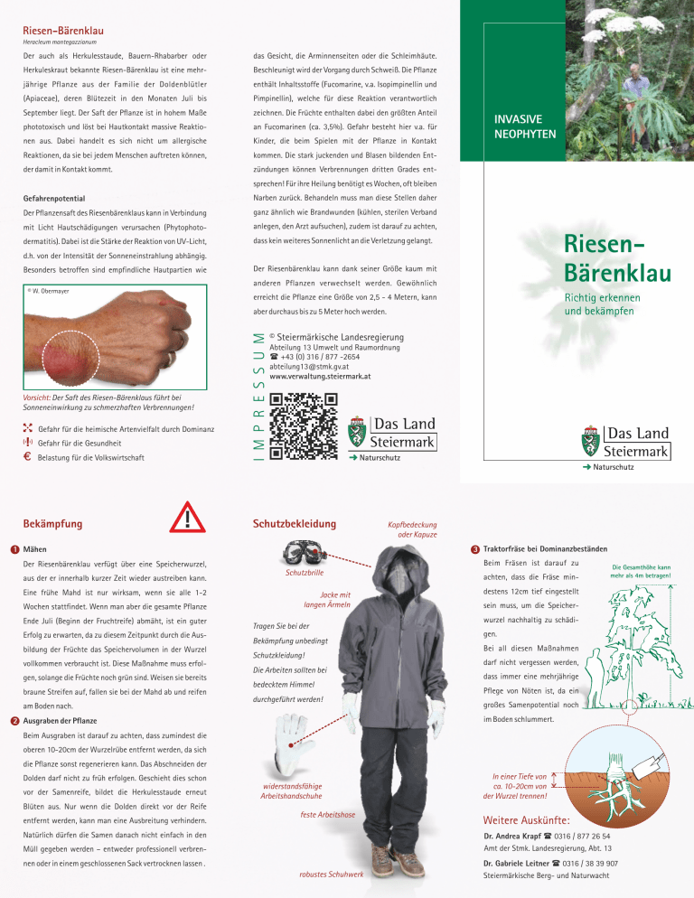 Riesen-Bärenklau Heracleum mantegazzianum Der auch als Herkulesstaude, Bauern-Rhabarber oder das Gesicht, die Arminnenseiten oder die Schleimhäute. Herkuleskraut bekannte Riesen-Bärenklau ist eine mehr- Beschleunigt wird der Vorgang durch Schweiß. Die Pflanze jährige Pflanze aus der Familie der Doldenblütler enthält Inhaltsstoffe (Fucomarine, v.a. Isopimpinellin und (Apiaceae), deren Blütezeit in den Monaten Juli bis Pimpinellin), welche für diese Reaktion verantwortlich September liegt. Der Saft der Pflanze ist in hohem Maße zeichnen. Die Früchte enthalten dabei den größten Anteil phototoxisch und löst bei Hautkontakt massive Reaktio- an Fucomarinen (ca. 3,5%). Gefahr besteht hier v.a. für nen aus. Dabei handelt es sich nicht um allergische Kinder, die beim Spielen mit der Pflanze in Kontakt Reaktionen, da sie bei jedem Menschen auftreten können, kommen. Die stark juckenden und Blasen bildenden Ent- der damit in Kontakt kommt. zündungen können Verbrennungen dritten Grades ent- INVASIVE NEOPHYTEN sprechen! Für ihre Heilung benötigt es Wochen, oft bleiben Gefahrenpotential Narben zurück. Behandeln muss man diese Stellen daher Der Pflanzensaft des Riesenbärenklaus kann in Verbindung ganz ähnlich wie Brandwunden (kühlen, sterilen Verband mit Licht Hautschädigungen verursachen (Phytophoto- anlegen, den Arzt aufsuchen), zudem ist darauf zu achten, dermatitis). Dabei ist die Stärke der Reaktion von UV-Licht, dass kein weiteres Sonnenlicht an die Verletzung gelangt. RiesenBärenklau d.h. von der Intensität der Sonneneinstrahlung abhängig. Besonders betroffen sind empfindliche Hautpartien wie Der Riesenbärenklau kann dank seiner Größe kaum mit anderen Pflanzen verwechselt werden. Gewöhnlich © W. Obermayer Richtig erkennen und bekämpfen erreicht die Pflanze eine Größe von 2,5 - 4 Metern, kann Vorsicht: Der Saft des Riesen-Bärenklaus führt bei Sonneneinwirkung zu schmerzhaften Verbrennungen! Gefahr für die heimische Artenvielfalt durch Dominanz Gefahr für die Gesundheit Belastung für die Volkswirtschaft I M P R E S S U M aber durchaus bis zu 5 Meter hoch werden. © Steiermärkische Landesregierung Abteilung 13 Umwelt und Raumordnung ( +43 (0) 316 / 877 -2654 abteilung13@stmk.gv.at www.verwaltung.steiermark.at Naturschutz Naturschutz Bekämpfung Schutzbekleidung 3 Traktorfräse bei Dominanzbeständen 1 Mähen Beim Fräsen ist darauf zu Der Riesenbärenklau verfügt über eine Speicherwurzel, aus der er innerhalb kurzer Zeit wieder austreiben kann. Eine frühe Mahd ist nur wirksam, wenn sie alle 1-2 Wochen stattfindet. Wenn man aber die gesamte Pflanze Ende Juli (Beginn der Fruchtreife) abmäht, ist ein guter Erfolg zu erwarten, da zu diesem Zeitpunkt durch die Ausbildung der Früchte das Speichervolumen in der Wurzel vollkommen verbraucht ist. Diese Maßnahme muss erfolgen, solange die Früchte noch grün sind. Weisen sie bereits braune Streifen auf, fallen sie bei der Mahd ab und reifen am Boden nach. Kopfbedeckung oder Kapuze Schutzbrille Jacke mit langen Ärmeln Tragen Sie bei der Bekämpfung unbedingt Schutzkleidung! Die Arbeiten sollten bei bedecktem Himmel durchgeführt werden! achten, dass die Fräse min- Die Gesamthöhe kann mehr als 4m betragen! destens 12cm tief eingestellt sein muss, um die Speicherwurzel nachhaltig zu schädigen. Bei all diesen Maßnahmen darf nicht vergessen werden, dass immer eine mehrjährige Pflege von Nöten ist, da ein großes Samenpotential noch im Boden schlummert. 2 Ausgraben der Pflanze Beim Ausgraben ist darauf zu achten, dass zumindest die oberen 10-20cm der Wurzelrübe entfernt werden, da sich die Pflanze sonst regenerieren kann. Das Abschneiden der Dolden darf nicht zu früh erfolgen. Geschieht dies schon vor der Samenreife, bildet die Herkulesstaude erneut widerstandsfähige Arbeitshandschuhe In einer Tiefe von ca. 10-20cm von der Wurzel trennen! Blüten aus. Nur wenn die Dolden direkt vor der Reife entfernt werden, kann man eine Ausbreitung verhindern. feste Arbeitshose Natürlich dürfen die Samen danach nicht einfach in den Weitere Auskünfte: Dr. Andrea Krapf ( 0316 / 877 26 54 Amt der Stmk. Landesregierung, Abt. 13 Müll gegeben werden – entweder professionell verbrennen oder in einem geschlossenen Sack vertrocknen lassen . robustes Schuhwerk Dr. Gabriele Leitner ( 0316 / 38 39 907 Steiermärkische Berg- und Naturwacht Die Grundblätter sind lappig und können bis 50cm lang werden. Die bis zu 60cm langen, elliptischen Blätter sind am Rand fein gezähnt. Wiesen-Bärenklau Wald-Engelwurz Riesen-Bärenklau Heracleum sphondylium Angelica sylvestris Heracleum mantegazzianum Diese heimische, ausdauernde Pflanze weist Wuchshöhen bis zu 1,5 Metern auf und kommt bis 2.200m Seehöhe vor. Die Blätter sind behaart und ähneln Tierfüßen – daher der Name „Bärenklau, Bärentatze“. Der Stängel ist kantig gefurcht, meist behaart und verzweigt. Nach dem Berühren können Rötungen und Schwellungen der Haut auftreten („Wiesen-Dermatitis“)! Diese bis zu 2 Metern hohe Pflanze kommt in Seehöhen bis 1700m vor. Die wechselständigen Blätter sind auf der Unterseite behaart und mehrfach gefiedert. Der fein gerillte Stängel ist hohl, unbehaart und weißlich bereift. Er ist an der Basis rötlich-braun und wird nach oben hin grün. Die Wald-Engelwurz blüht nur einmal und stirbt danach ab. Der Saft der Pflanze kann bei Sonneneinstrahlung Hautreizungen (Hautausschläge) auslösen. Der bis zu 5 Meter hohe Riesen-Bärenklau stammt aus dem Kaukasus und kommt dort in Höhen bis zu 2.300 Metern vor. Generell bevorzugt er feuchte, nährstoffreiche Böden. Der Stängel ist hohl und v.a. im unteren Bereich rötlich gefleckt. Die Blätter werden bis zu 1 Meter lang, sind tief eingeschnitten und stark gezähnt. Je Pflanze können jährlich bis zu 40.000 Samen ausgebildet werden, die bis zu sieben Jahre keimfähig bleiben. Der Saft dieser Pflanze führt unter UVEinstrahlung zu überaus schmerzhaften Verbrennungen! Hauptblüte: J