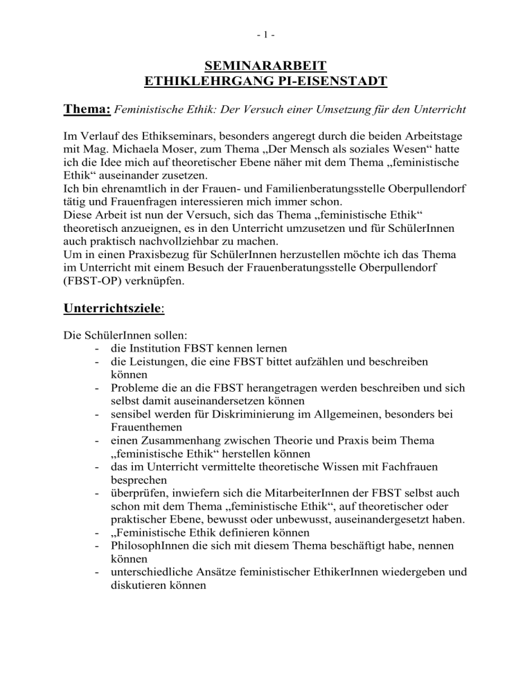 -1- SEMINARARBEIT ETHIKLEHRGANG PI-EISENSTADT Thema: Feministische Ethik: Der Versuch einer Umsetzung für den Unterricht Im Verlauf des Ethikseminars, besonders angeregt durch die beiden Arbeitstage mit Mag. Michaela Moser, zum Thema „Der Mensch als soziales Wesen“ hatte ich die Idee mich auf theoretischer Ebene näher mit dem Thema „feministische Ethik“ auseinander zusetzen. Ich bin ehrenamtlich in der Frauen- und Familienberatungsstelle Oberpullendorf tätig und Frauenfragen interessieren mich immer schon. Diese Arbeit ist nun der Versuch, sich das Thema „feministische Ethik“ theoretisch anzueignen, es in den Unterricht umzusetzen und für SchülerInnen auch praktisch nachvollziehbar zu machen. Um in einen Praxisbezug für SchülerInnen herzustellen möchte ich das Thema im Unterricht mit einem Besuch der Frauenberatungsstelle Oberpullendorf (FBST-OP) verknüpfen. Unterrichtsziele: Die SchülerInnen sollen: - die Institution FBST kennen lernen - die Leistungen, die eine FBST bittet aufzählen und beschreiben können - Probleme die an die FBST herangetragen werden beschreiben und sich selbst damit auseinandersetzen können - sensibel werden für Diskriminierung im Allgemeinen, besonders bei Frauenthemen - einen Zusammenhang zwischen Theorie und Praxis beim Thema „feministische Ethik“ herstellen können - das im Unterricht vermittelte theoretische Wissen mit Fachfrauen besprechen - überprüfen, inwiefern sich die MitarbeiterInnen der FBST selbst auch schon mit dem Thema „feministische Ethik“, auf theoretischer oder praktischer Ebene, bewusst oder unbewusst, auseinandergesetzt haben. - „Feministische Ethik definieren können - PhilosophInnen die sich mit diesem Thema beschäftigt habe, nennen können - unterschiedliche Ansätze feministischer EthikerInnen wiedergeben und diskutieren können -2- THEORETISCHE AUSEINANDERSETZUNG Die Frage nach der feministischen Ethik: Immer auch ein Stück weit eine offene Diskussion! 1.Definitionen 1.1 Otfried Höffe definiert Ethik folgt: „Ethik (griech. ethos: gewohnter Ort des Lebens, Sitte, Charakter) geht als philosophische Disziplin und als Disziplintitel auf Aristoteles zurück. [...] Dort, wo überkommene Lebensweisen und Institutionen ihre selbstverständliche Geltung verlieren, sucht die philosophische Ethik, von der Idee eines sinnvollen menschlichen Lebens geleitet, auf methodischem Weg und ohne letzte Berufung auf politische und religiöse Autoritäten oder auf das von alters her Gewohnte und Bewährte allgemeine gültige Aussagen über das gute und gerechte Handeln. Bei Aristoteles und in der von ihm begründeten Tradition hat die Ethik neben der engen auch eine umfassende Bedeutung, nach der die Ökonomie und die Politik mit zu ihr zählen. Ethik ist dann gleichbedeutend mit praktischer Philosophie.“ 1 1.2 Zu „feministischer Ethik“ heißt es bei Otfried Höffe: „Feministische Ethik bestreitet die Möglichkeit einer geschlechtsneutralen ethischen Theorie (und daher auch einer unparteilich- objektiven ethischen Praxis). Sie deutet den Universalitätsanspruch neuzeitlicher Ethik im Sinn einer Vernachlässigung der Geschlechterdifferenz; die spezifisch weibliche Sichtweise werde damit unterschlagen.“ 2 1.3 Bei Saskia Wendel hingegen findet sich folgende Definition: „Feministische Ethik ist Reflexion gelingender Lebensführung unter besonderer Berücksichtigung der Geschlechterperspektive, und dabei wiederum unter der Perspektive von Frauen. [...] Das tut der Universalität feministischer Ethik keinerlei Abbruch.“ 3 Weiters meint sie. „Dennoch stellt gerade die feministische Ethik heraus, dass der universale und normative Anspruch der Ethik nicht zwangsläufig mit der Einnahme eines neutralen moralischen Standpunkts verbunden ist. Jede ethische Reflexion ist – wie jede philosophische Reflexion – von erkenntnisleitenden Interessen bestimmt, die den Reflexionsgang zugrunde liegen, und feministische Ethikerinnen legen ihr erkenntnisleitendes Interesse offen. Ausgehend von der Lebenserfahrung von Frauen, nehmen sie eine parteiliche Perspektive für Frauen ein und vertreten dabei ein herrschaftskritisches Interesse, geleiten von der Überzeugung, dass Herrschaftsverhältnisse gelingendes Leben nicht fördern sondern verhindern. [...]; sie will Perspektiven -3- für ein Handeln aufzeigen, das Herrschaftsverhältnisse überwinden und so zu gelingendem Leben beitragen kann.“ 4 2. Feministische Ethik als Ethik die ihr erkenntnisleitendes Interesse und ihren Standpunkt offen legt. Verfolgt man die unterschiedlichen Positionen und Kontroversen innerhalb der feministischen Ethik, z.B. um die Frage nach der Begründung ethischer Urteile oder ob feministische Ethik eine Ethik der Gleichheit oder eine Ethik der sexuellen Differenz sein soll oder die Debatte um eine „weibliche Moral“, dann lassen sich nach Saskia Wendel folgende Schlüsse ziehen: „Feministische Ethik hat sich als ein Projekt erwiesen, das nicht neben einer sogenannten traditionellen Ethik zu verorten und von dieser abzugrenzen ist, sondern das zu einem selbst schon Argumente aus der ethischen Tradition voraussetzt, mit denen es sich kritisch auseinander setzt oder die es – feministisch modifiziert aufnimmt.“ 5 Gerade das, also dieser kritische Blickwinkel treibt nach Wendel die allgemeine ethische Diskussion voran. Damit erweist sich für sie feministische Ethik aber auch nicht als „weibliche Sondermoral“ noch als „neue“ oder „andere“ Form von Ethik. Ebenso wenig wie es ein spezifisch „weibliches“ Denken gibt, existiert eine „weibliche“ Ethik. Ethische Argumentationsstrukturen sind weder genuin „weiblich“ noch genuin „männlich“. Sie sind vielmehr konsistent oder inkonsistent. Allerdings können sie ideologisch missbraucht werden, wenn sie zur Legitimation bestimmter Herrschaftsverhältnisse eingesetzt werden z.B. zwischen den Geschlechtern. „Der einzige Unterschied zwischen feministischen Ethiken und traditi