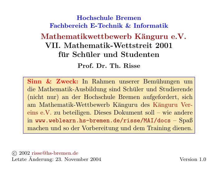 Bei Kangourou 2001 handelt es sich um den jährlichen MathematikWettbewerb des Känguru Vereins e.V., Berlin, den es für unterschiedliche Altersgruppen gibt. Die vorliegenden Aufgaben sind für Schüler