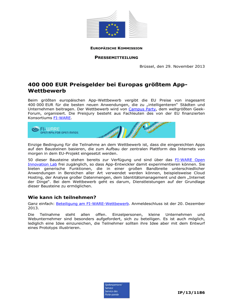 EUROPÄISCHE KOMMISSION PRESSEMITTEILUNG Brüssel, den 29. November 2013 400 000 EUR Preisgelder bei Europas größtem AppWettbewerb Beim größten europäischen App-Wettbewerb vergibt die EU Preise von insgesamt 400 000 EUR für die besten neuen Anwendungen, die zu „intelligenteren“ Städten und Unternehmen beitragen. Der Wettbewerb wird von Campus Party, dem weltgrößten GeekForum, organisiert. Die Preisjury besteht aus Fachleuten des von der EU finanzierten Konsortiums FI-WARE. Einzige Bedingung für die Teilnahme an dem Wettbewerb ist, dass die eingereichten Apps auf den Bausteinen basieren, die zum Aufbau der zentralen Plattform des Internets von morgen in dem EU-Projekt eingesetzt werden. 50 dieser Bausteine stehen bereits zur Verfügung und sind über das FI-WARE Open Innovation Lab frei zugänglich, so dass App-Entwickler damit experimentieren können. Sie bieten generische Funktionen, die in einer großen Bandbreite unterschiedlicher Anwendungen in Bereichen aller Art verwendet werden können, beispielsweise Cloud Hosting, der Analyse großer Datenmengen, dem Identitätsmanagement und dem „Internet der Dinge“. Bei dem Wettbewerb geht es darum, Dienstleistungen auf der Grundlage dieser Bausteine zu ermöglichen. Wie kann ich teilnehmen? Ganz einfach: Beteiligung am FI-WARE-Wettbewerb. Anmeldeschluss ist der 20. Dezember 2013. Die Teilnahme steht allen offen. Einzelpersonen, kleine Unternehmen und Webunternehmer sind besonders aufgefordert, sich zu beteiligen. Es ist auch möglich, lediglich eine Idee einzureichen, die Teilnehmer sollten ihre Idee aber mit dem Entwurf eines Prototyps illustrieren. IP/13/1186 Wettbewerbskategorien Apps für intelligente Städte Apps für intelligente Unternehmen Industrie Werkzeuge, die zu effizienteren öffentlichen Dienstleistungen beitragen oder Städte dabei unterstützen, innovative Dienste für die Bürger bereitzustellen. Nutzenbeispiele hier. und Apps, die – insbesondere kleineren – Unternehmen helfen können, sich besser zu managen. Von besseren Prozessen für die Lieferkette oder die Produktion bis hin zur Gewinnung neuer Kunden oder der Erbringung innovativer Dienstleistungen für kleine Unternehmen. Preisgelder Ausgeschrieben sind Preisgelder von insgesamt 400 000 EUR, die auf die beiden Kategorien Apps für intelligente Städte und Apps für intelligente Unternehmen aufgeteilt sind. In der ersten Runde werden bis zu 20 Preise von je 2800 EUR verliehen, verbunden mit der Möglichkeit, an der Campus Party 2014 in Sao Paulo, Brasilien, teilzunehmen, um sich für folgende Preise zu bewerben: Erster Preis: 75 000 EUR Zweiter Preis: 40 000 EUR Dritter Preis: 20 000 EUR Sonderpreis für junge Entwickler: 5 000 EUR Sonderpreis für die innovativste App: 5 000 EUR Hintergrund Die europäische App-Wirtschaft beschäftigt bereits 529 000 Menschen und stützt insgesamt 794 000 Arbeitsplätze. Sie erwirtschaftet einen Jahresumsatz von 10 Mrd. EUR, was 22 % des Umsatzes der App-Wirtschaft weltweit ausmacht. Andere zukunftsträchtige Dienste wie das Cloud Computing könnten im Jahr 2020 250 Mrd. EUR zum BIP der EU beitragen. Eine Jury aus technischen Fachleuten des Konsortiums FI-WARE bewertet alle als Wettbewerbsbeitrag eingereichten Ideen. Die Jurymitglieder sind von der Teilnahme am Wettbewerb ausgeschlossen. Der Wettbewerb wurde zuvor bereits einmal in diesem Jahr ausgerichtet. Die Preisträger wurden auf der Campus Party London im September 2013 bekanntgegeben. Die bei diesem Wettbewerb prämierten Anwendungen auf der Grundlage von FI-LAB zeigten, wie die Technologien genutzt werden können, die Entwicklern kostenlos für Versuche zur Verfügung stehen. 2 Nützliche Links Video zu FI-WARE Über Campus Party Hashtags: #FIWARE800K, #fiware, #CampusParty2014, #CampusParty, Twitter-Konto: @FIware Neelie Kroes Ansprechpartner E-Mail: comm-kroes@ec.europa.eu Tel.: +32.229.57361 Twitter: @RyanHeathEU 3