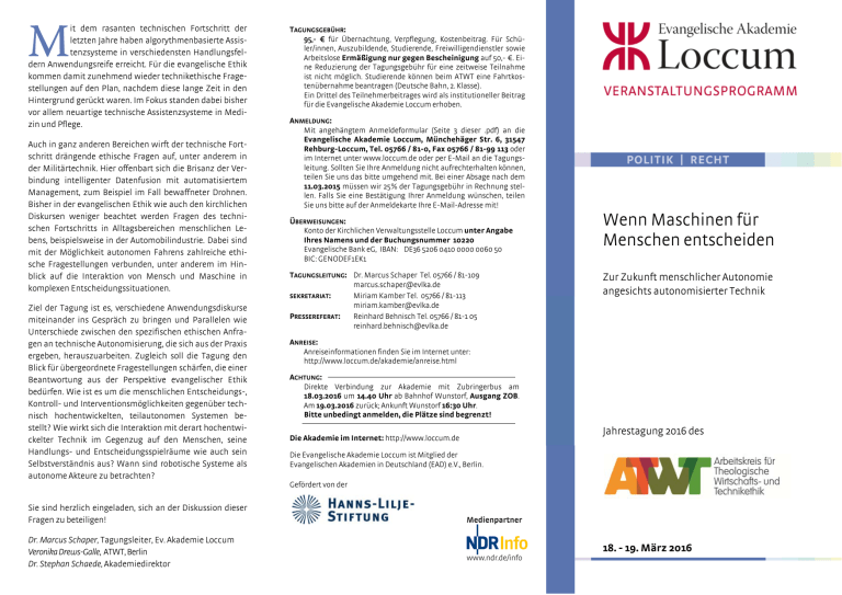 M it dem rasanten technischen Fortschritt der letzten Jahre haben algorythmenbasierte Assistenzsysteme in verschiedensten Handlungsfeldern Anwendungsreife erreicht. Für die evangelische Ethik kommen damit zunehmend wieder technikethische Fragestellungen auf den Plan, nachdem diese lange Zeit in den Hintergrund gerückt waren. Im Fokus standen dabei bisher vor allem neuartige technische Assistenzsysteme in Medizin und Pflege. Auch in ganz anderen Bereichen wirft der technische Fortschritt drängende ethische Fragen auf, unter anderem in der Militärtechnik. Hier offenbart sich die Brisanz der Verbindung intelligenter Datenfusion mit automatisiertem Management, zum Beispiel im Fall bewaffneter Drohnen. Bisher in der evangelischen Ethik wie auch den kirchlichen Diskursen weniger beachtet werden Fragen des technischen Fortschritts in Alltagsbereichen menschlichen Lebens, beispielsweise in der Automobilindustrie. Dabei sind mit der Möglichkeit autonomen Fahrens zahlreiche ethische Fragestellungen verbunden, unter anderem im Hinblick auf die Interaktion von Mensch und Maschine in komplexen Entscheidungssituationen. Ziel der Tagung ist es, verschiedene Anwendungsdiskurse miteinander ins Gespräch zu bringen und Parallelen wie Unterschiede zwischen den spezifischen ethischen Anfragen an technische Autonomisierung, die sich aus der Praxis ergeben, herauszuarbeiten. Zugleich soll die Tagung den Blick für übergeordnete Fragestellungen schärfen, die einer Beantwortung aus der Perspektive evangelischer Ethik bedürfen. Wie ist es um die menschlichen Entscheidungs-, Kontroll- und Interventionsmöglichkeiten gegenüber technisch hochentwickelten, teilautonomen Systemen bestellt? Wie wirkt sich die Interaktion mit derart hochentwickelter Technik im Gegenzug auf den Menschen, seine Handlungs- und Entscheidungsspielräume wie auch sein Selbstverständnis aus? Wann sind robotische Systeme als autonome Akteure zu betrachten? TAGUNGSGEBÜHR: 95,- € für Übernachtung, Verpflegung, Kostenbeitrag. Für Schüler/innen, Auszubildende, Studierende, Freiwilligendienstler sowie Arbeitslose Ermäßigung nur gegen Bescheinigung auf 50,- €. Eine Reduzierung der Tagungsgebühr für eine zeitweise Teilnahme ist nicht möglich. Studierende können beim ATWT eine Fahrtkostenübernahme beantragen (Deutsche Bahn, 2. Klasse). Ein Drittel des Teilnehmerbeitrages wird als institutioneller Beitrag für die Evangelische Akademie Loccum erhoben. ANMELDUNG: Mit angehängtem Anmeldeformular (Seite 3 dieser .pdf) an die Evangelische Akademie Loccum, Münchehäger Str. 6, 31547 Rehburg-Loccum, Tel. 05766 / 81-0, Fax 05766 / 81-99 113 oder im Internet unter www.loccum.de oder per E-Mail an die Tagungsleitung. Sollten Sie Ihre Anmeldung nicht aufrechterhalten können, teilen Sie uns das bitte umgehend mit. Bei einer Absage nach dem 11.03.2015 müssen wir 25% der Tagungsgebühr in Rechnung stellen. Falls Sie eine Bestätigung Ihrer Anmeldung wünschen, teilen Sie uns bitte auf der Anmeldekarte Ihre E-Mail-Adresse mit! ÜBERWEISUNGEN: Konto der Kirchlichen Verwaltungsstelle Loccum unter Angabe Ihres Namens und der Buchungsnummer 10220 Evangelische Bank eG, IBAN: DE36 5206 0410 0000 0060 50 BIC: GENODEF1EK1 TAGUNGSLEITUNG: Dr. Marcus Schaper Tel. 05766 / 81-109 marcus.schaper@evlka.de SEKRETARIAT: Miriam Kamber Tel. 05766 / 81-113 miriam.kamber@evlka.de Reinhard Behnisch Tel. 05766 / 81-1 05 PRESSEREFERAT: reinhard.behnisch@evlka.de Wenn Maschinen für Menschen entscheiden Zur Zukunft menschlicher Autonomie angesichts autonomisierter Technik ANREISE: Anreiseinformationen finden Sie im Internet unter: http://www.loccum.de/akademie/anreise.html ACHTUNG: Direkte Verbindung zur Akademie mit Zubringerbus am 18.03.2016 um 14.40 Uhr ab Bahnhof Wunstorf, Ausgang ZOB. Am 19.03.2016 zurück; Ankunft Wunstorf 16:30 Uhr. Bitte unbedingt anmelden, die Plätze sind begrenzt! Die Akademie im Internet: http://www.loccum.de Jahrestagung 2016 des Die Evangelische Akademie Loccum ist Mitglied der Evangelischen Akademien in Deutschland (EAD) e.V., Berlin. Gefördert von der = Sie sind herzlich eingeladen, sich an der Diskussion dieser Fragen zu beteiligen! Dr. Marcus Schaper, Tagungsleiter, Ev. Akademie Loccum Veronika Drews-Galle, ATWT, Berlin Dr. Stephan Schaede, Akademiedirektor 18. - 19. März 2016 Freitag, 18. März 2016 Samstag, 19. März 2016 Referenten 15:00 Mitgliederversammlung des ATWT e.V 08:15 Morgenandacht; anschl. Frühstück 15:30 Anreise der Teilnehmer zum Nachmittagskaffee 09:30 16:30 Begrüßung und Einführung Veronika Drews-Galle, Arbeitskreis für Theologische Wirtschafts- und Technikethik, Berlin Dr. Marcus Schaper, Ev. Akademie Loccum Technikeinsatz in Lebensgefahr Wer trägt hier die Verantwortung? Anwendungsfeld: Digitales Operieren Prof. Dr. theol. habil. Arne Manzeschke, Nürnberg Prof. Dr. Hans-Dieter Burkhard ist dreifacher Weltmeister im Roboter-Fußball. Zu seinen Forschungsgebieten zählen die Theorie und Praxis (symbolischer) mentaler Modelle für die Steuerung Autonomer Systeme sowie soziale Aspekte für Entwurf und Implementierung verteilter künstlicher Intelligenz. 11:00 Töten durch Maschinen Was legitimiert den Einsatz (teil-)autonomer Robotik beim Militär? Anwendungsfeld: Teilautonome Waffensysteme Dr. Bernhard Koch, Hamburg Oberkirchenrat Dr. Ralph Charbonnier ist Maschinenbauingenieur, Theologe und Philosoph und beschäftigt sich besonders mit den Themenfeldern Wirtschaft und Arbeit, Soziale Sicherungssysteme und Gesundheitswesen, Familienpolitik und Ehrenamt. 12:30 Mittagessen 13:30 Auch Roboter brauchen Erziehung Ein Zwischenruf Dr. Hans-Arthur Marsiske, Autor & Journalist ,Hamburg Dr. Bernhard Koch arbeitet zur Allgemeinen Ethik, Rechtsphilosophie, Legitimation letaler Gewalt (Notwehr, Nothilfe, Notstand, ius in bello); zum sog. "gezielten Töten" sowie zur Ethik des Einsatzes automatisierter Waffensysteme. 14:00 Abschlussdiskussion 15:30 Ende der Tagung 15:50 Bustransfer zum Bahnhof Wunstorf (Ankunft 1