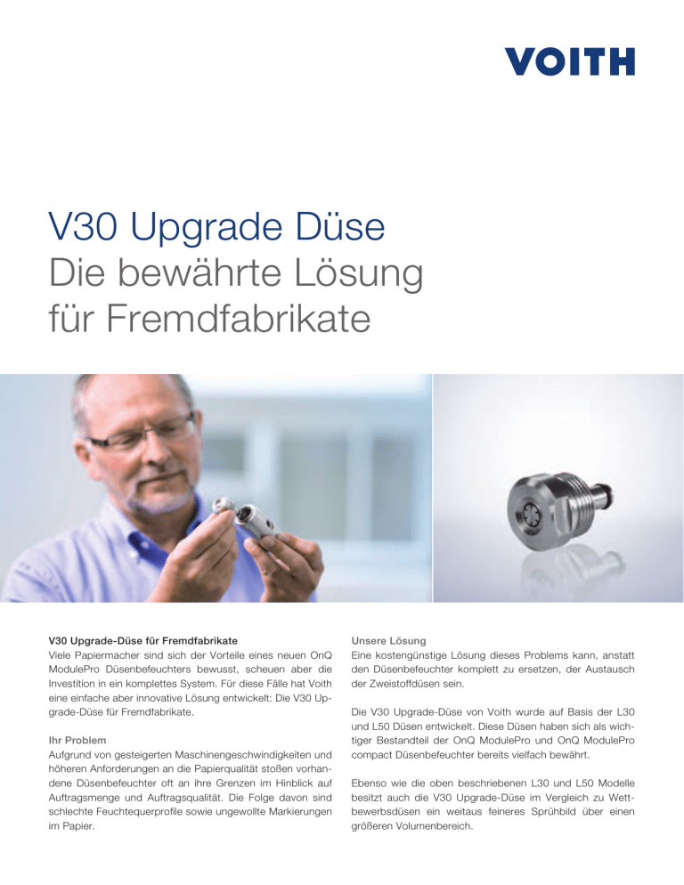 V30 Upgrade Düse Die bewährte Lösung für Fremdfabrikate V30 Upgrade-Düse für Fremdfabrikate Viele Papiermacher sind sich der Vorteile eines neuen OnQ ModulePro Düsenbefeuchters bewusst, scheuen aber die ­Investition in ein komplettes System. Für diese Fälle hat Voith eine einfache aber innovative Lösung entwickelt: Die V30 Upgrade-Düse für Fremdfabrikate. Ihr Problem Aufgrund von gesteigerten Maschinengeschwindigkeiten und höheren Anforderungen an die Papierqualität stoßen vorhandene Düsenbefeuchter oft an ihre Grenzen im Hinblick auf Auftragsmenge und Auftragsqualität. Die Folge davon sind schlechte Feuchtequerprofile sowie ungewollte Markierungen im Papier. Unsere Lösung Eine kostengünstige Lösung dieses Problems kann, anstatt den Düsenbefeuchter komplett zu ersetzen, der Austausch der Zweistoffdüsen sein. Die V30 Upgrade-Düse von Voith wurde auf Basis der L30 und L50 Düsen entwickelt. Diese Düsen haben sich als wichtiger Bestandteil der OnQ ModulePro und OnQ ModulePro compact Düsenbefeuchter bereits vielfach bewährt. Ebenso wie die oben beschriebenen L30 und L50 Modelle besitzt auch die V30 Upgrade-Düse im Vergleich zu Wett­ bewerbsdüsen ein weitaus feineres Sprühbild über einen ­größeren Volumenbereich. Die Tauschbarkeit der Düse er­fordert zuvor eine technische Detailprüfung. Vorteile V30 Upgrade-Düse ++ Besseres Feuchtequerprofil durch Erweiterung der Einsatzgrenzen des Düsenfeuchters (höherer Volumenstrom) ++ Bessere Papierqualität durch feineren, markierungsfreien Sprühauftrag (kleinere Tröpfchengröße) ++ Minimale Investitionskosten, da lediglich die Düsenmundstücke getauscht werden ++ Minimales Risiko durch Vorabversuche mit Testdüsen Bessere Sprühqualität bei größeren Sprühmengen Düse Fremdfabrikat optimale Tropfengröße Tropfengröße (Qualität) Voith V30 Upgrade-Düse Sprühmenge (Quantität) Kontakt Asien: Kunshan, China Tel: Europa: Heidenheim, Deutschland Tel: Nordamerika: Wilson (NC), USA Tel: Südamerika: São Paulo, Brasilien Tel: paper@voith.com www.voith.com/papier +86 512 5799 +49 7321 37 +1 252 265 +55 11 3944 3600 2487 4405 4966 vpz no. 1014 | Deutsch | Design: kalteny | Inhalt: wip | 2012-07-25 | Technische Daten und Darstellungen unverbindlich, Änderungen vorbehalten! Einfacher Austausch Der Düsenaustausch erfolgt problemlos durch Ausschrauben des alten Düsenmundstücks und Einschrauben der neuen V30 Upgrade-Düse von Voith. Dabei bleiben sowohl der Sprühbalken selbst, als auch die Regelung und Steuerung unangetastet.